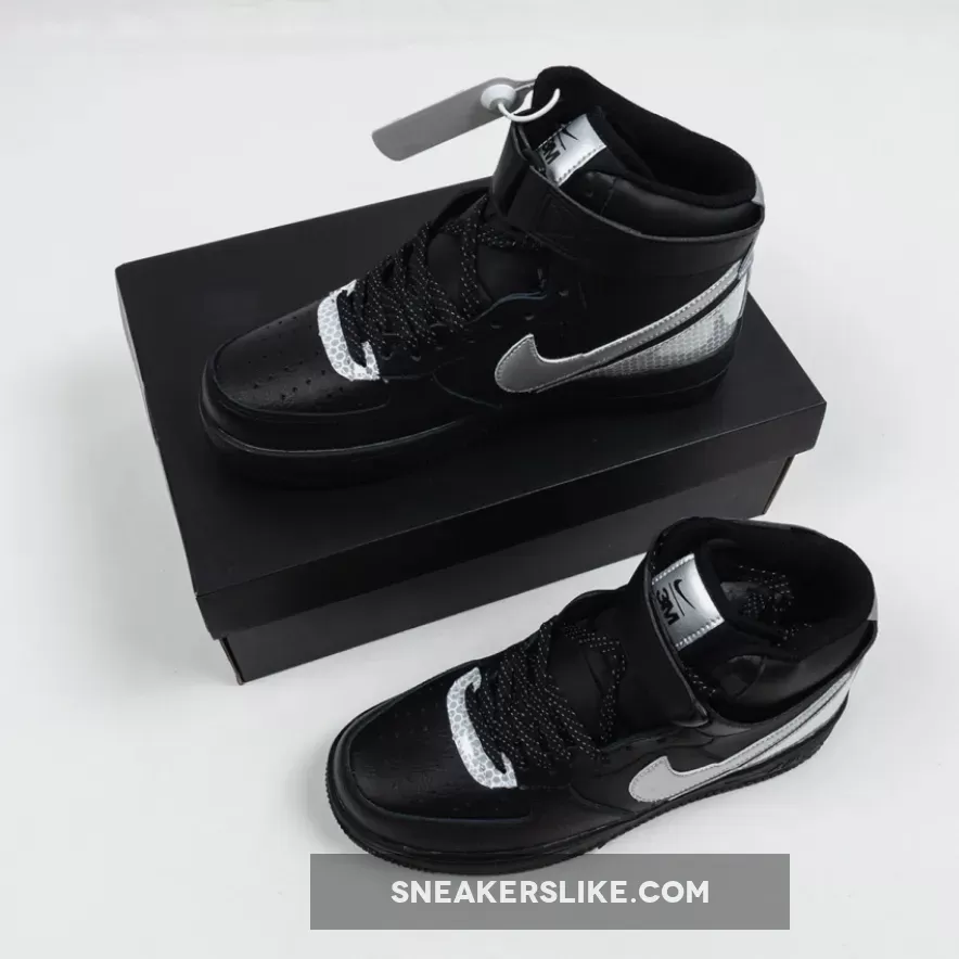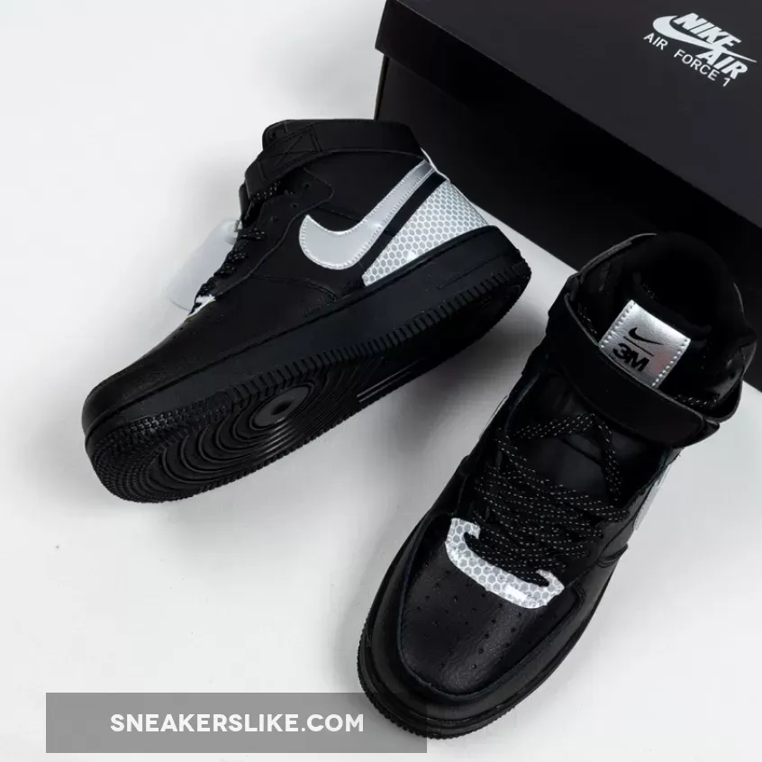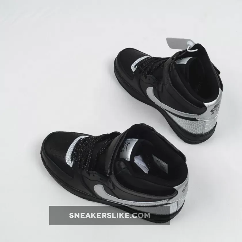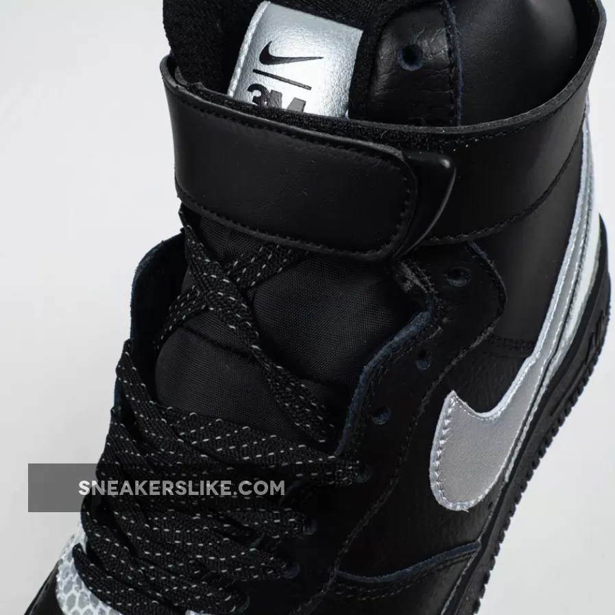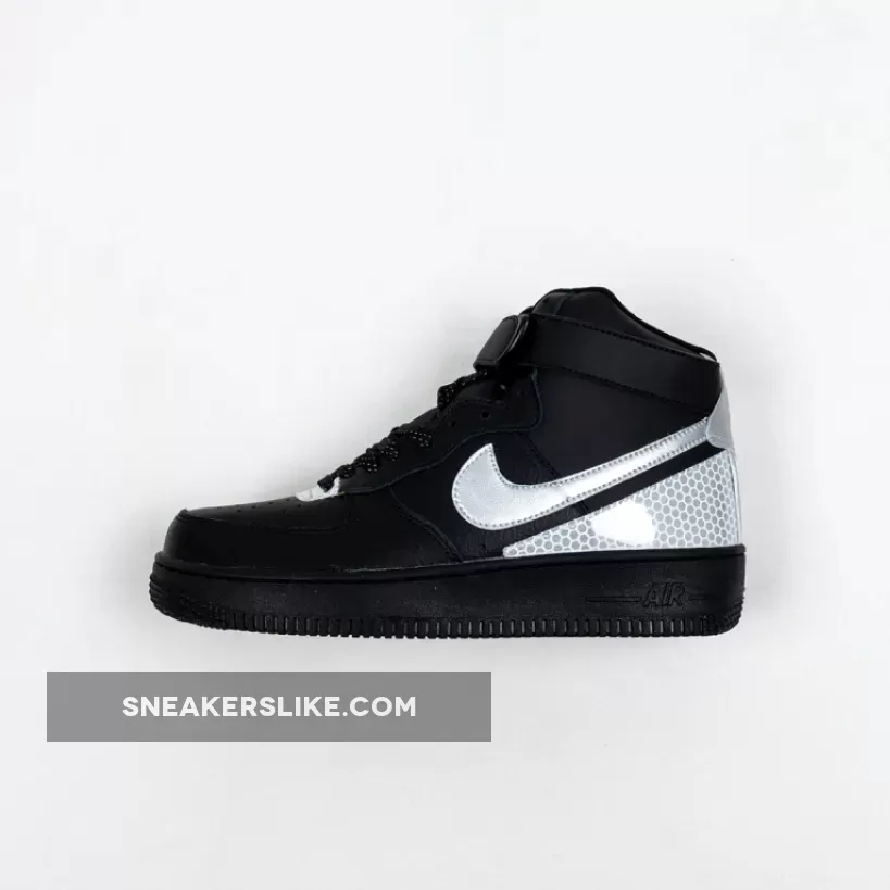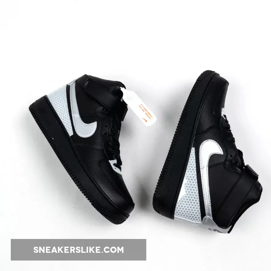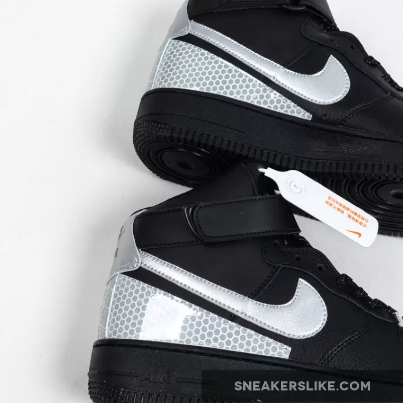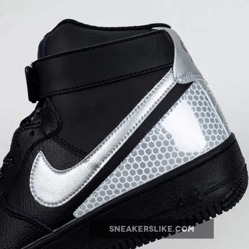 This 3M Air Force 1 High utilizes a Black tumbled leather upper while Silver is applied to the Swoosh logo on the panels. Following we have honeycomb 3M reflective Silver on the eyestay as well as wrapping the heel.