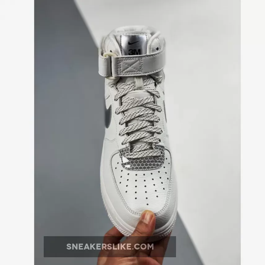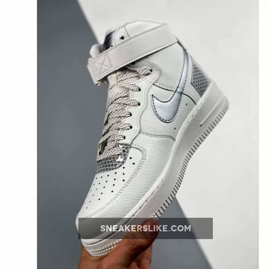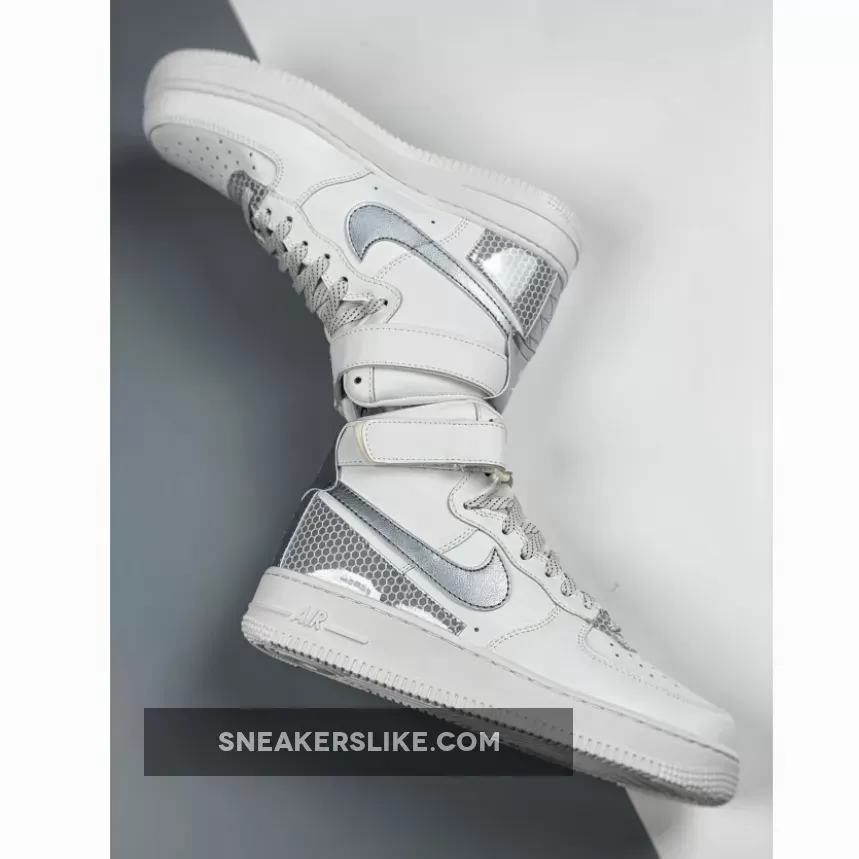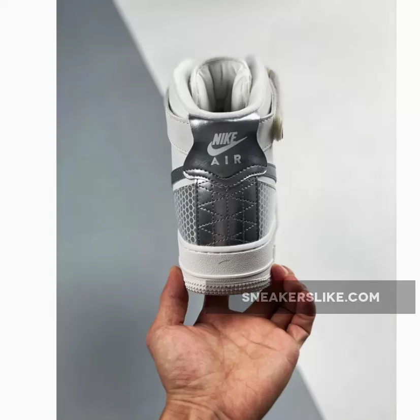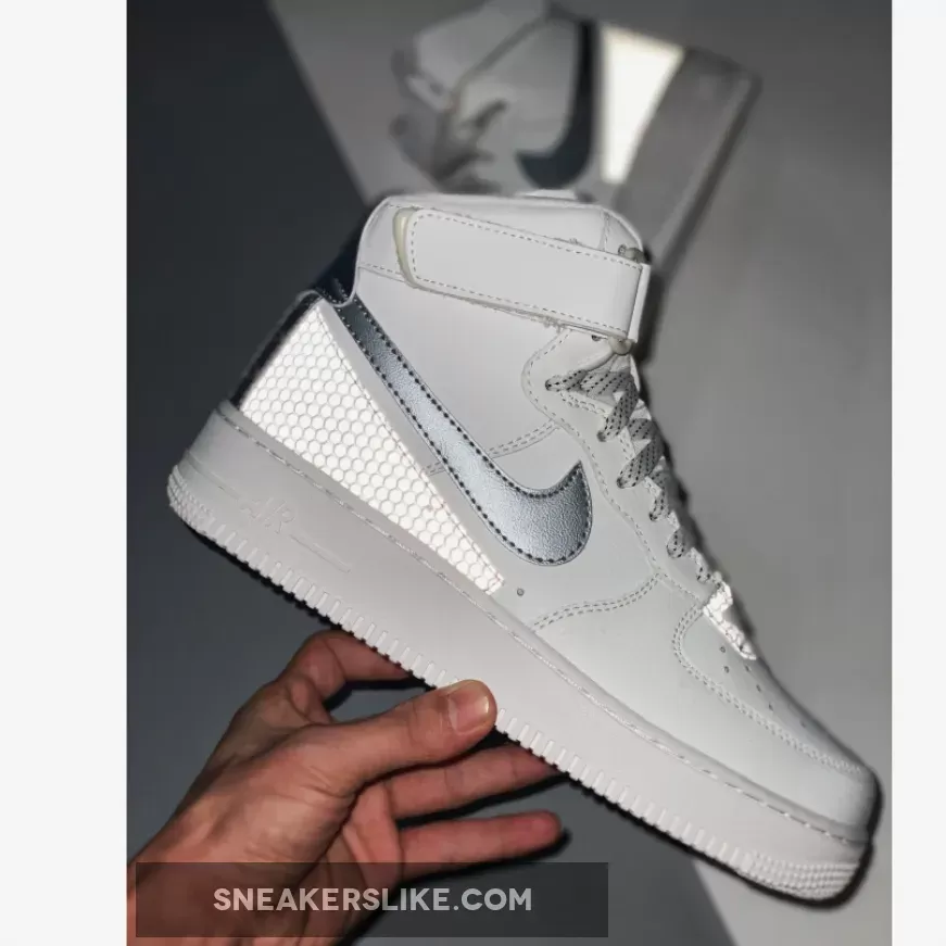 This offering of the Nike Air Force 1 High features a White leather upper with Silver Swooshes and 3M Silver honeycomb detailing on the toe and heel.
