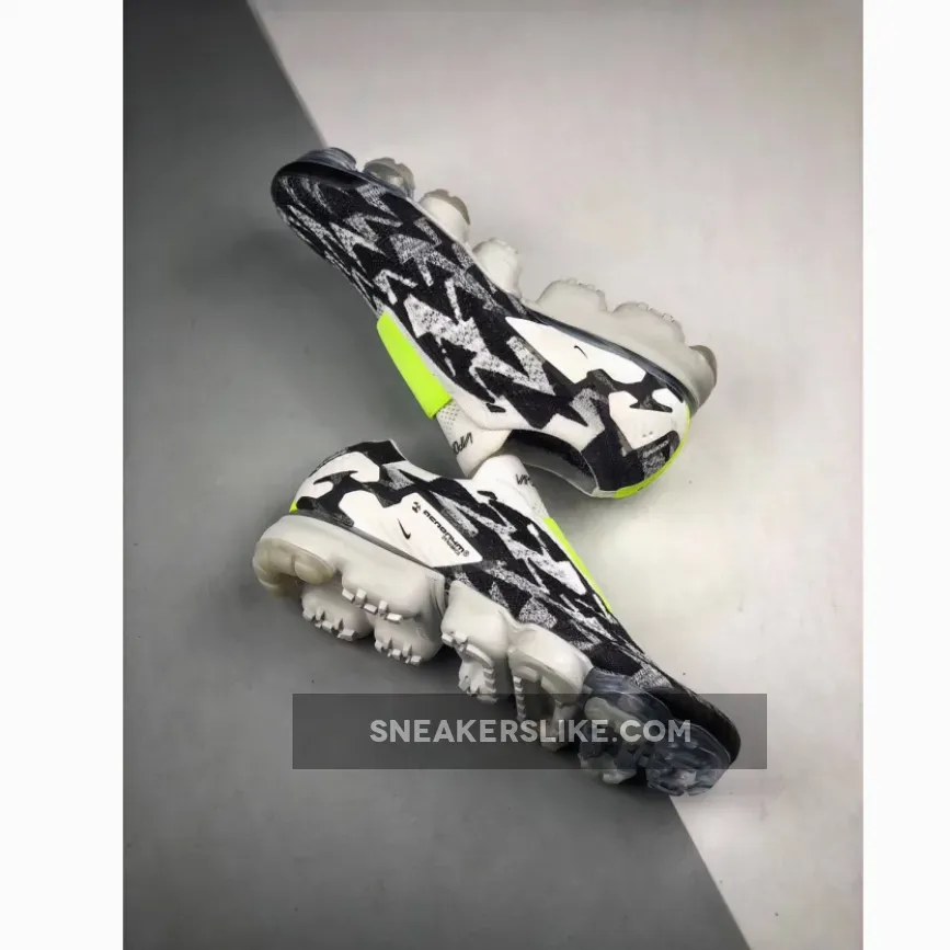 This Nike Air VaporMax Moc comes dressed in a Light Bone and Black color combination. Looking closer you can see that they feature a unique pattern across the Flyknit upper. In addition we have Volt on the overlay. Completing the look is a matte to transparent VaporMax Air unit.