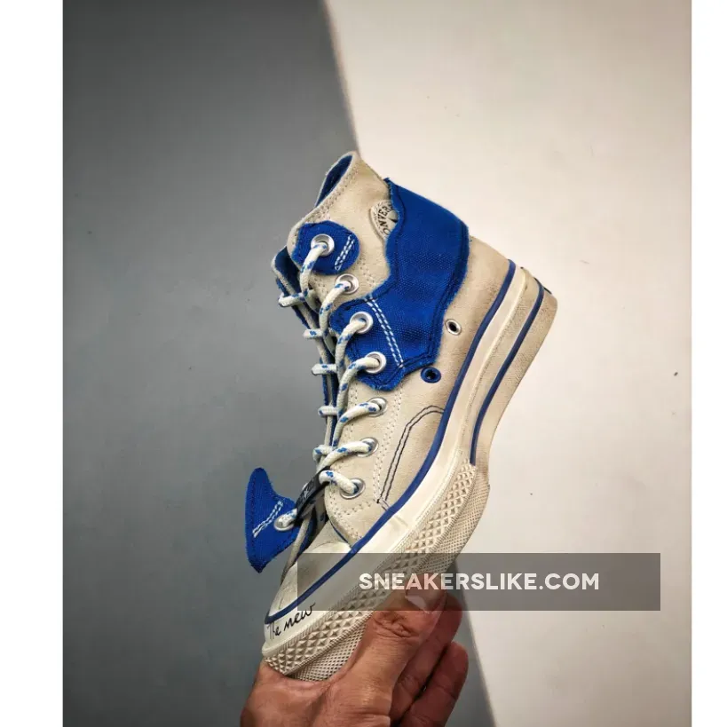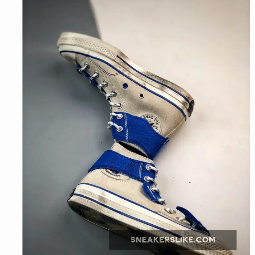 The collaborative pairs are found predistressed with a number of unconventional and deconstructed elements including double-laces intertwining both conventional and rope laces, contrast-stitched tongue tabs, and cutout blue canvas panels stretching around the metal eyelets. The title slogan is printed across the sides and “The New” and “Not New” text is found in cursive on the tip of the toe. Rounding out the look are classic outsoles featuring blue piping accents, black heel banners, and semi-translucent checkerboard bottoms.