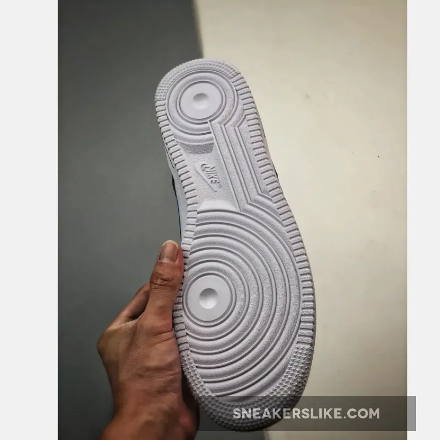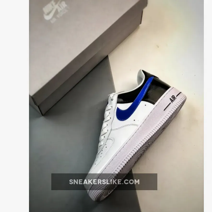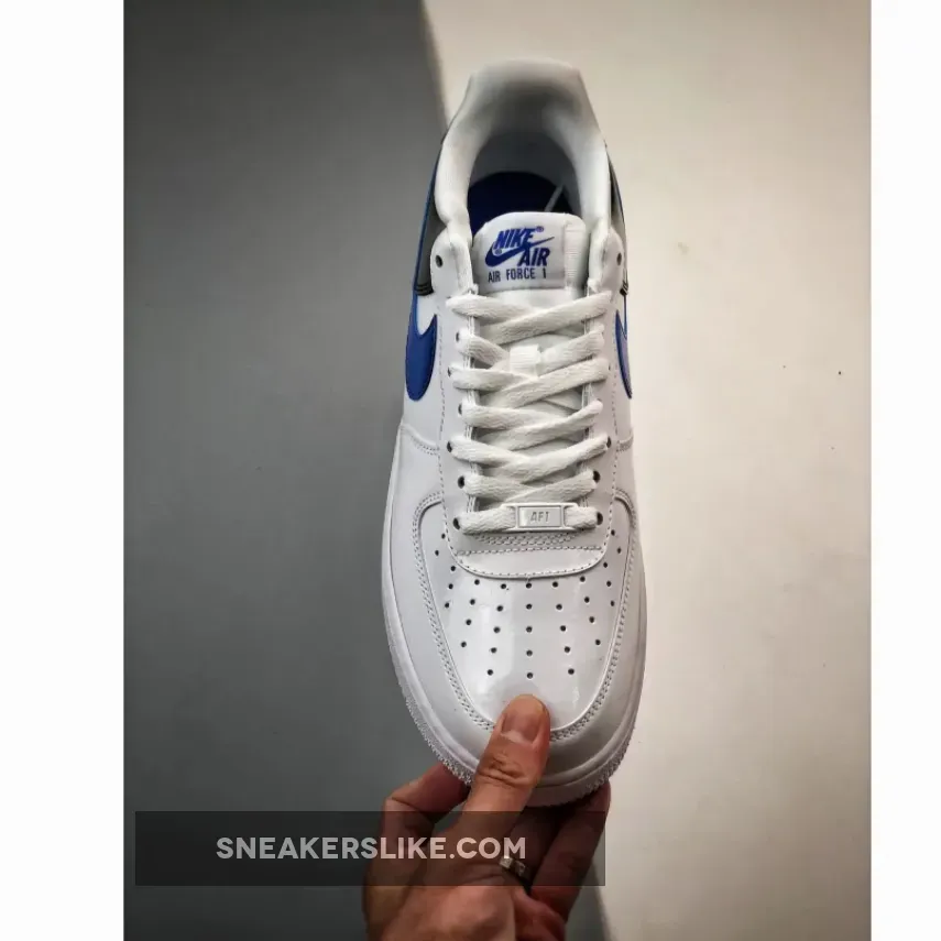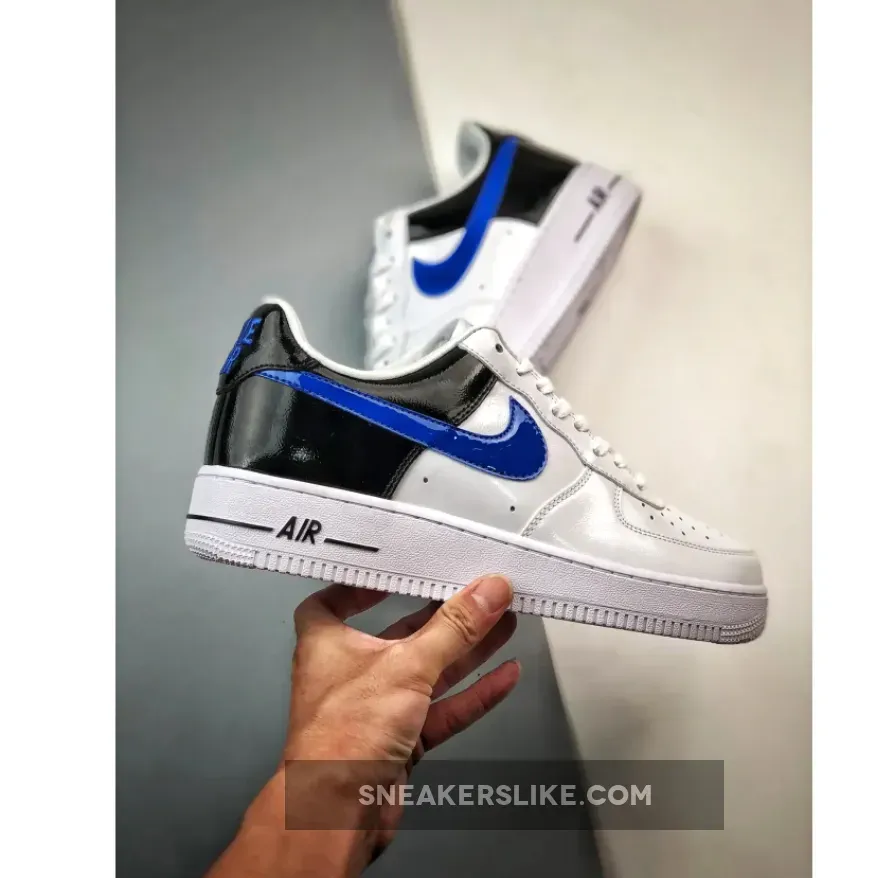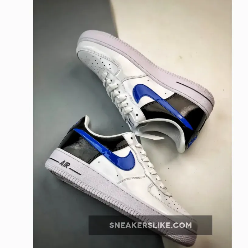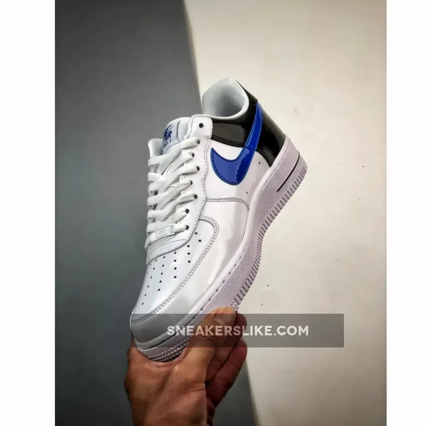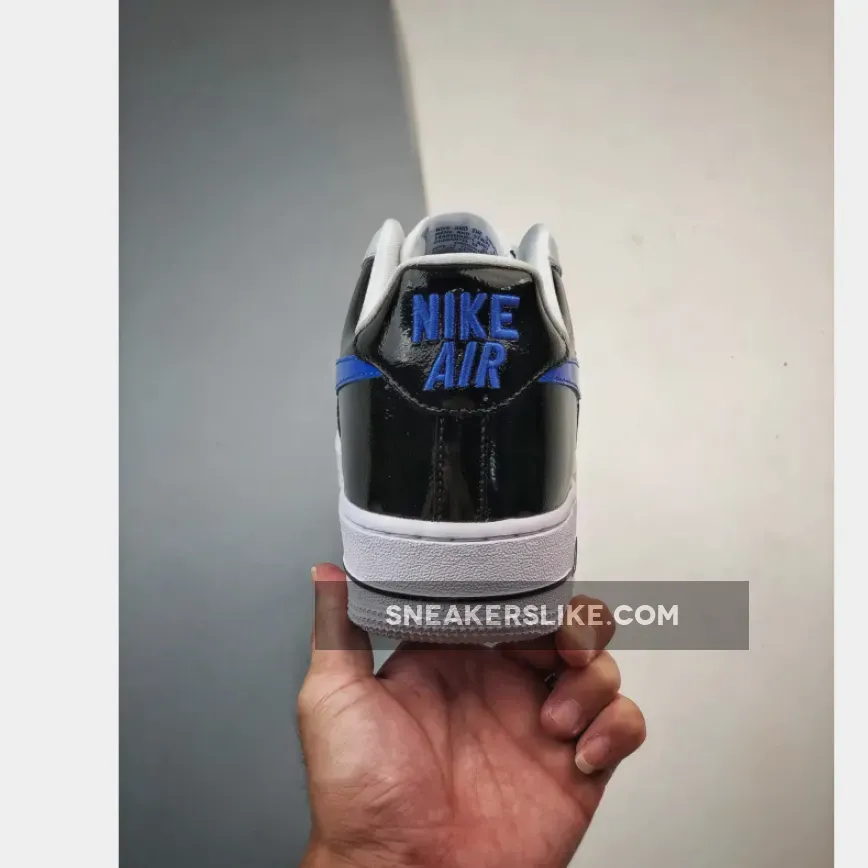 AF1 gets a sleek makeover! Classic smooth white leather Nike Air Force 1 Low White Blue Black Patent covers the side panels and the forefoot area including the perforated toe and eyestays. Meanwhile, the back portion contrasts the front design with its elegant shiny patent leather material. The Nike Swoosh is equally eye-catching in royal blue patent leather. At the rear, embroidered blue “NIKE AIR” branding adds a retro touch. Underfoot, the white chunky midsole has a grey tint to match the upper’s polished look.