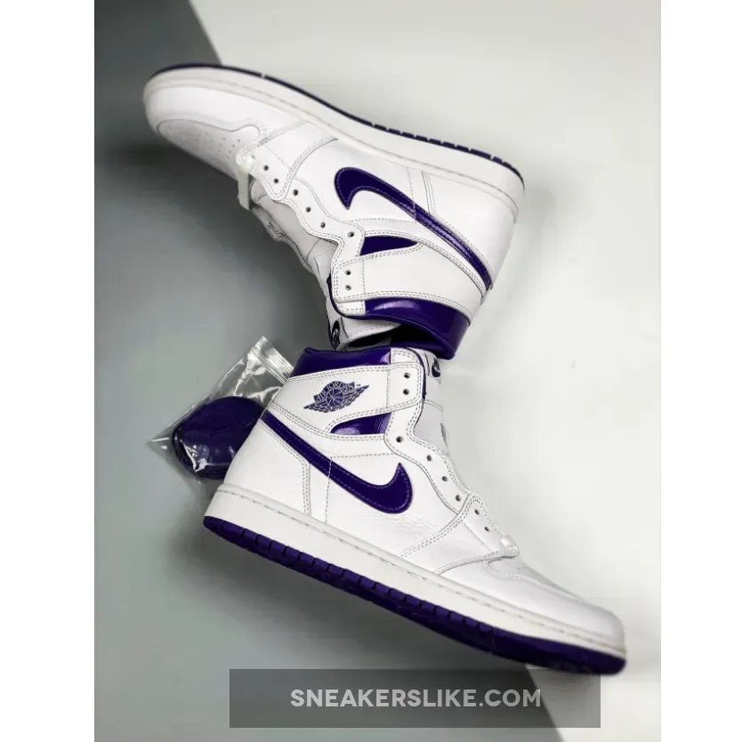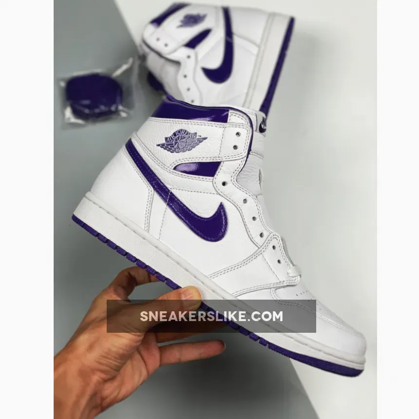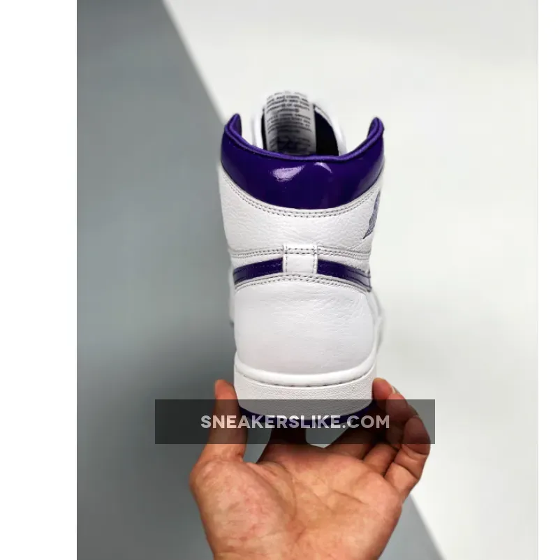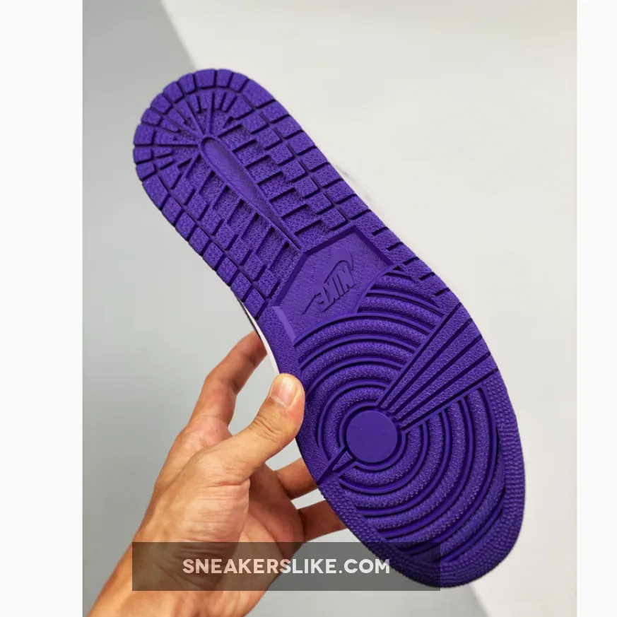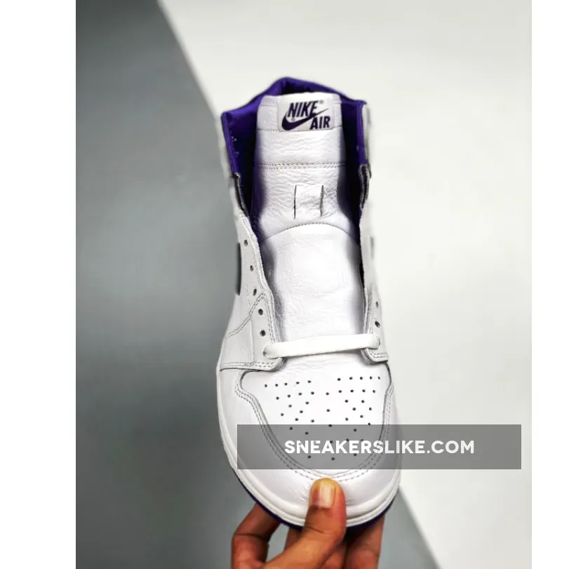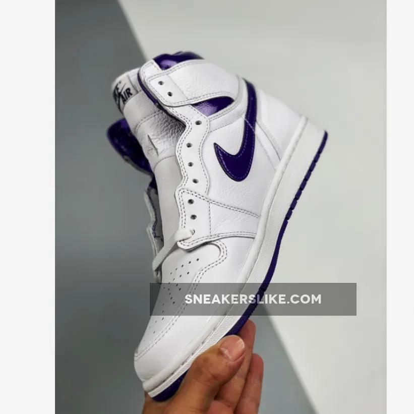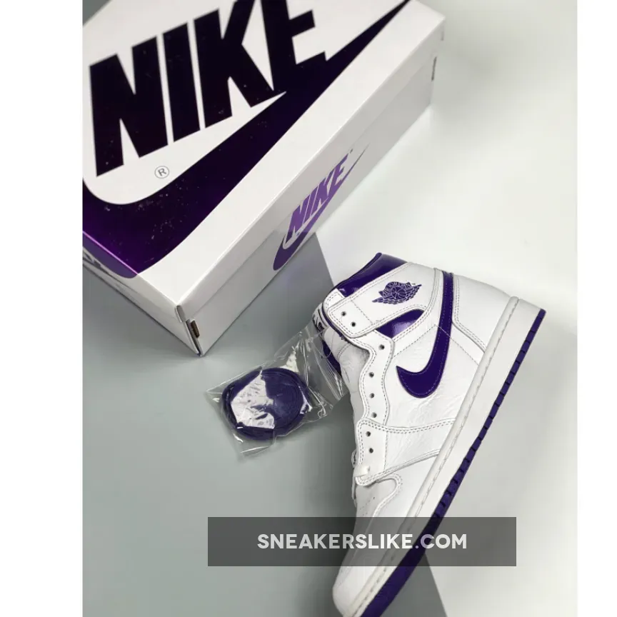 Dressed in a White and Court Purple color scheme. This Air Jordan 1 looks very similar to the OG “Metallic Purple” Air Jordan 1s, featuring a White leather upper with satin sockliner, Purple Swooshes, ankle collar, Wings logo, tongue branding, insoles, and rubber outsole.
