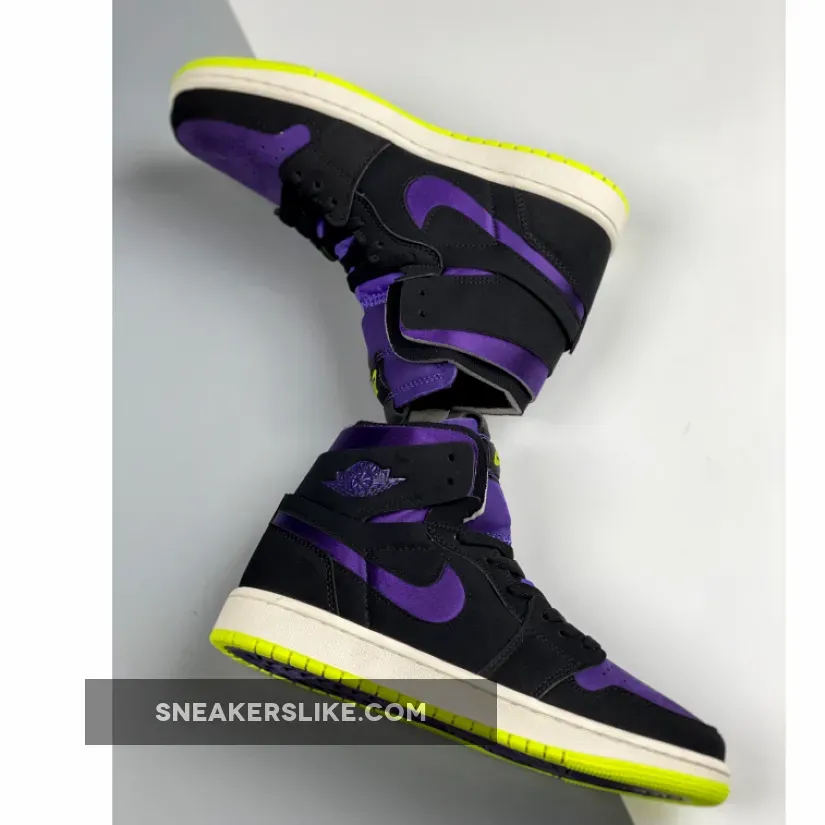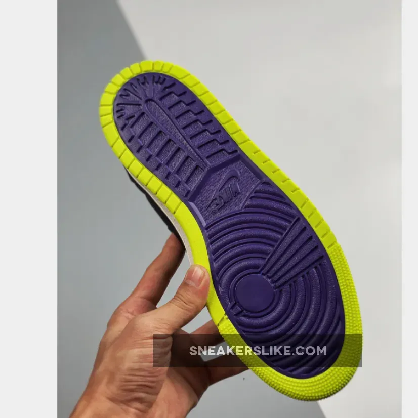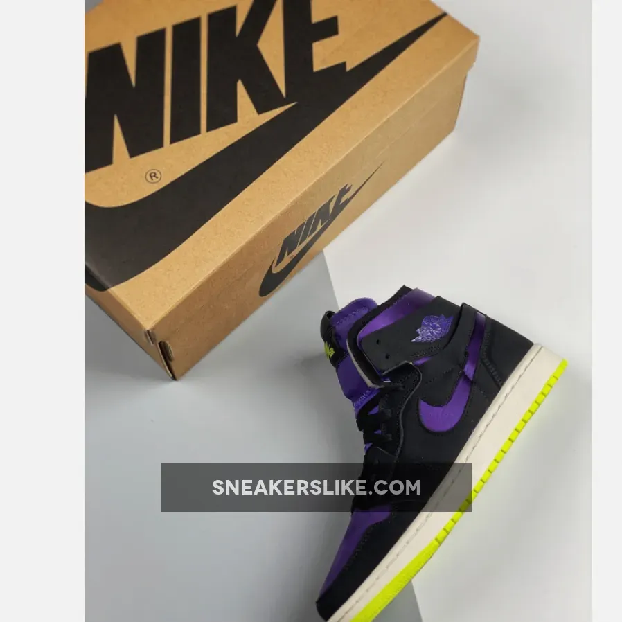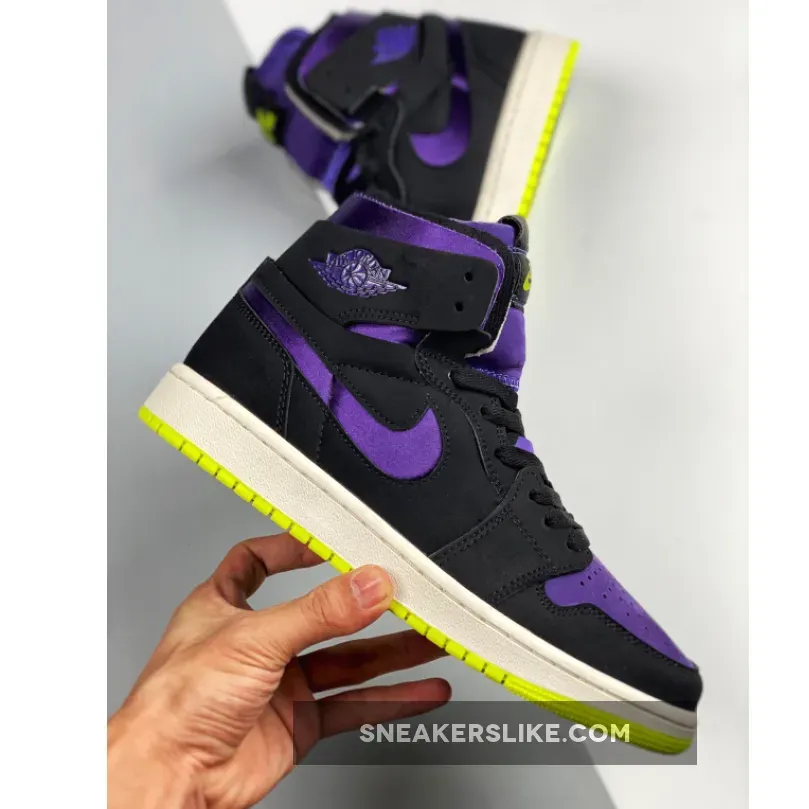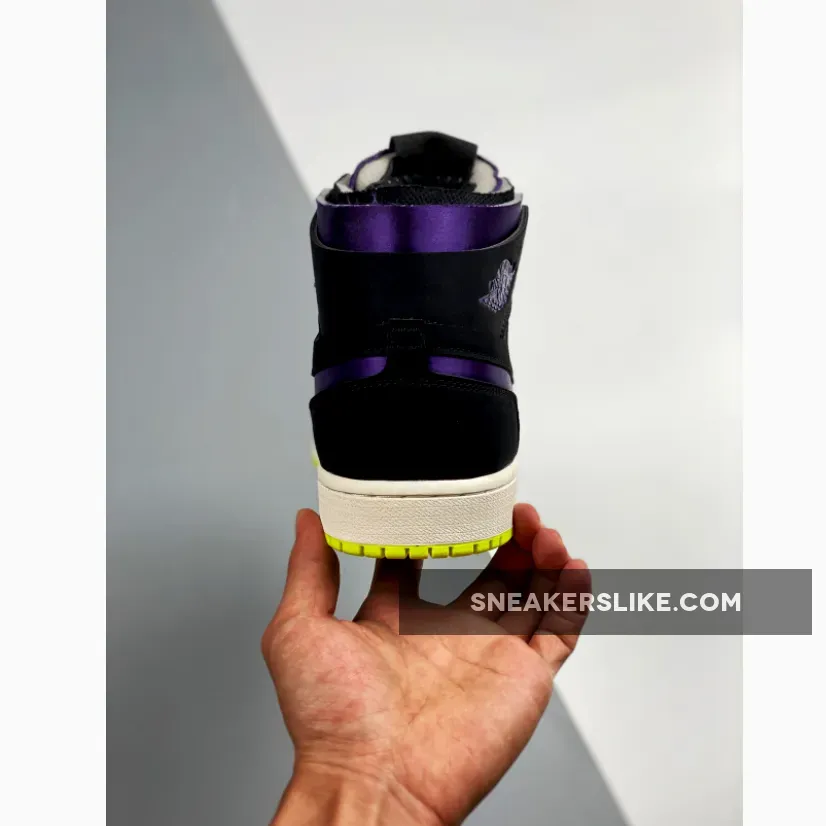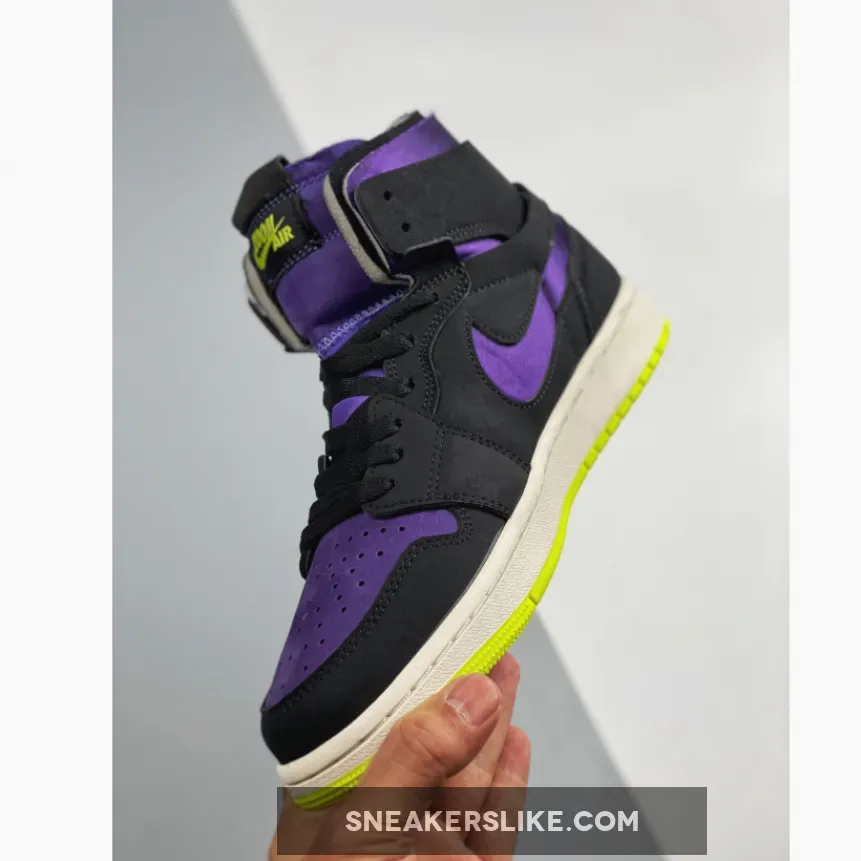 Dressed in a Black, Court Purple, Lemon Venom, and Sail color scheme. This Air Jordan 1 Zoom features a suede constructed upper with Purple on the toe, collar, tongues, and Swoosh logos paired with Black overlays.