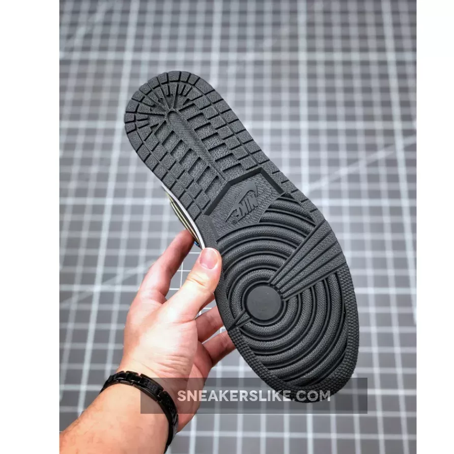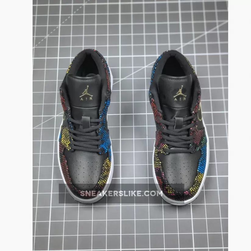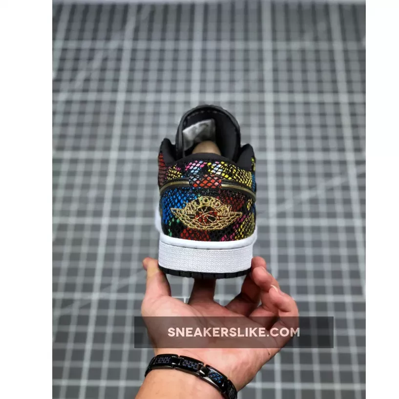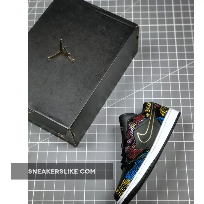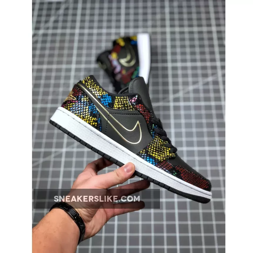 This offering of the low-top Air Jordan 1 features a Black smooth leather upper detailed with multicolored snakeskin overlays that resembles traditional African hues.