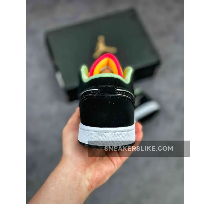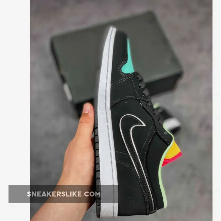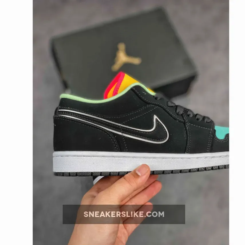 The Jordan 1 Low Black Aurora Green Laser Orange is a fresh new take on the legendary AJ1 silhouette that’s been a cult-classic with footwear fans since 1985. As Michael Jordan’s first-ever signature sneaker, the AJ1 holds huge sentimental value and originally launched in high, mid and low-top versions, with all three remaining popular today. The uppers are crafted from a blend of suede, canvas and mesh, with the colorway combining a black base layer with pops of green, orange and red for a vibrant look. Nike’s signature Swoosh logo runs neatly across both the lateral and medial sides, while a Jumpman logo is embroidered into the tongue and a wings logo onto the heel. If you’ve been searching for a versatile pair of Jordans to add to your collection then look no further, as these are certainly a valid choice.
