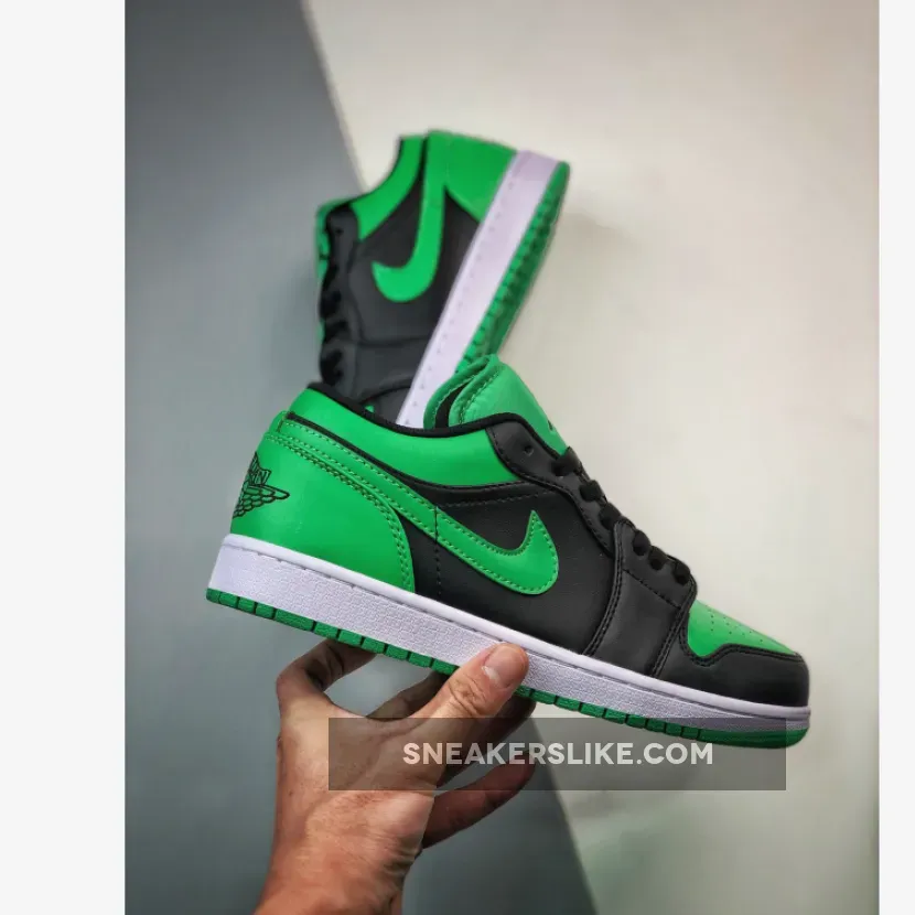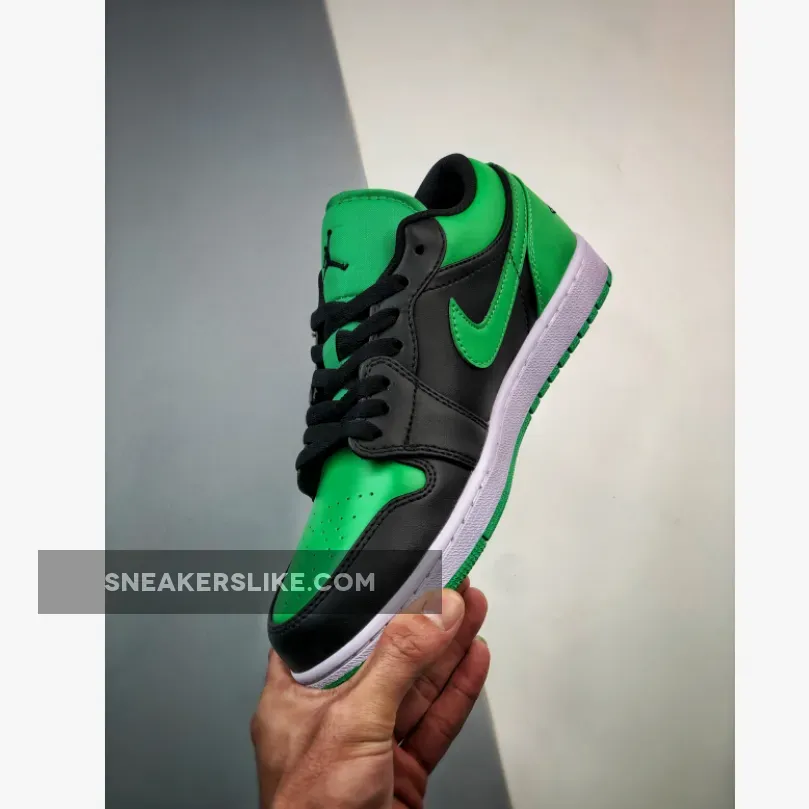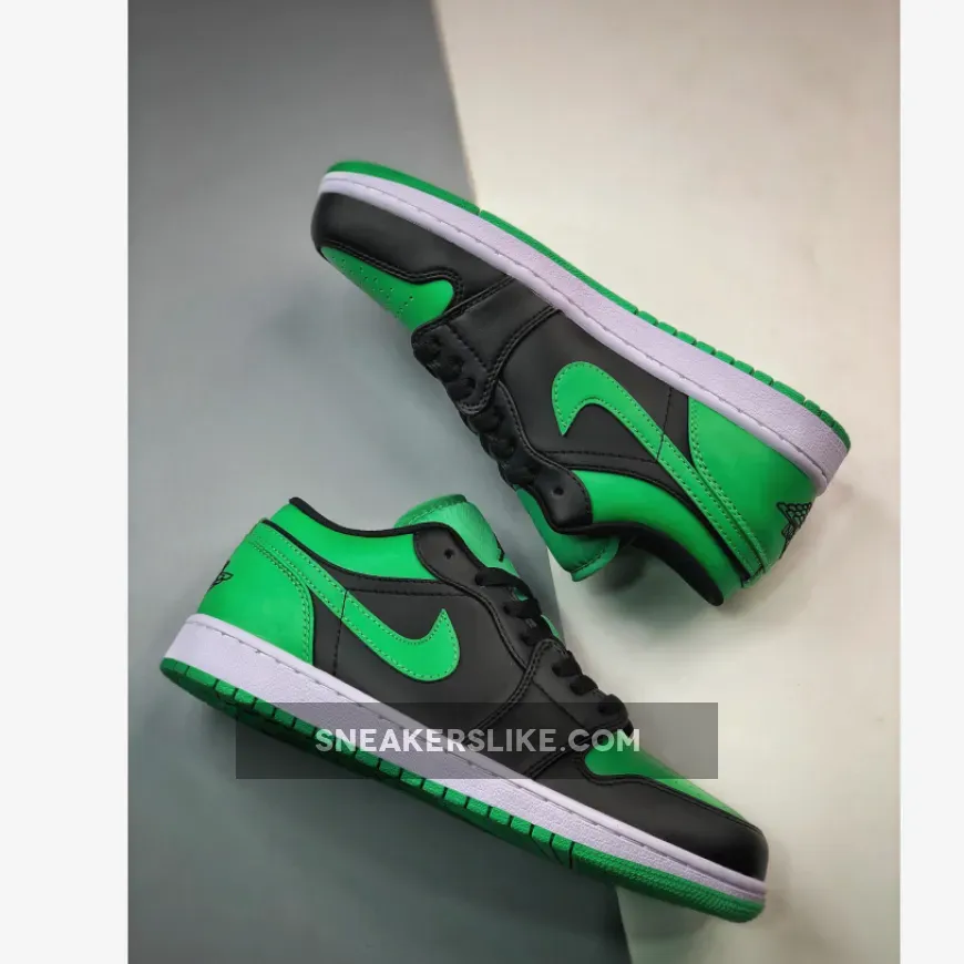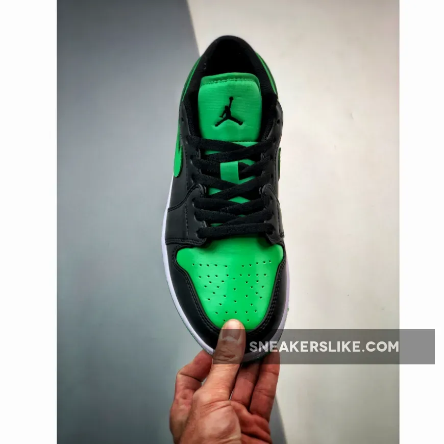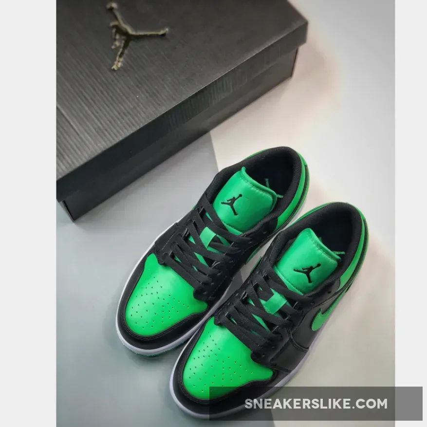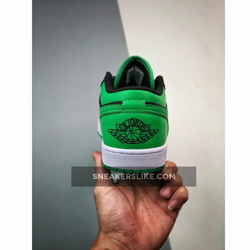 The Air Jordan 1 Low Lucky Green is constructed using Lucky Green and black color blocking across the uppers. Jordan brand stitched a black Air Jordan Wings logo on the sneakers heel, and Jumpman logo on the tongue. The low cut sneakers are laced with flat black laces.