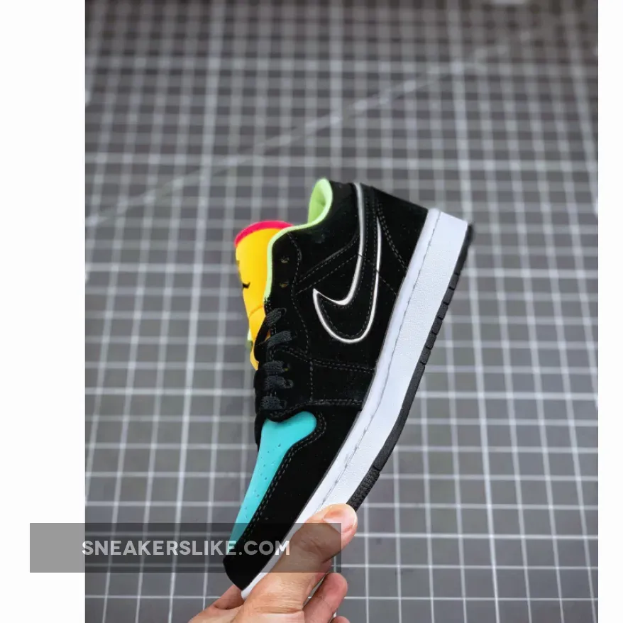This pair sports a Black suede upper highlighted with Turquoise on the toe, Yellow on the tongues with Pink trimming.