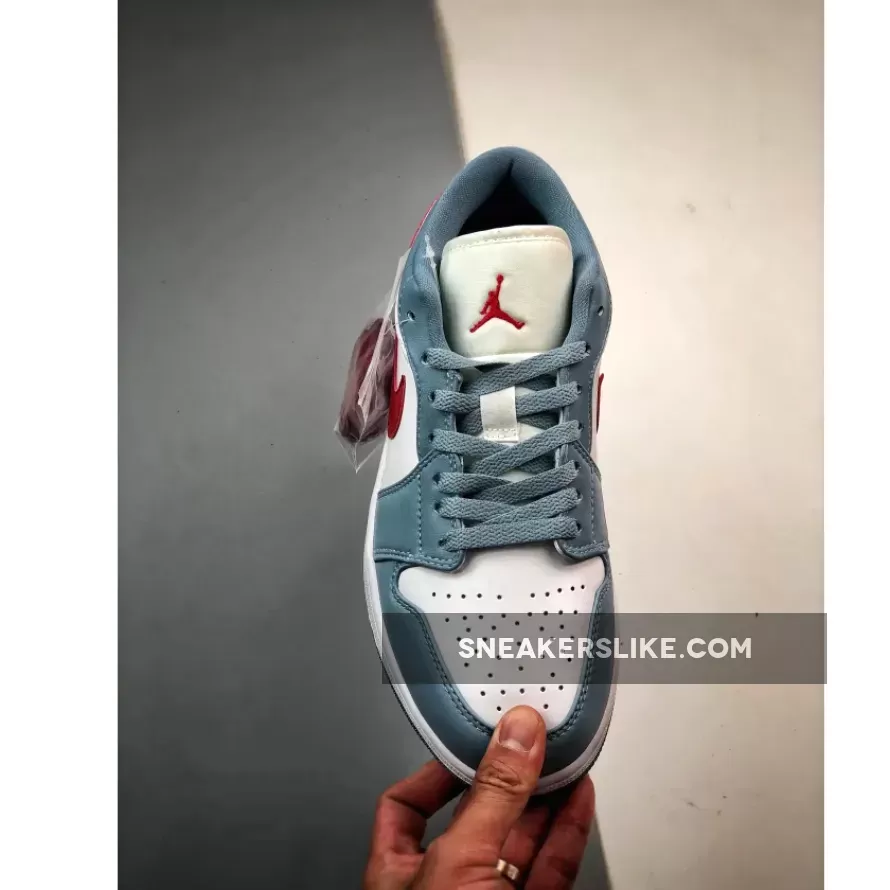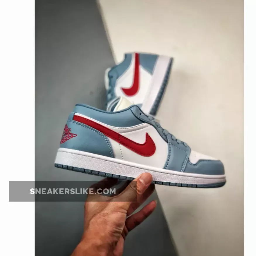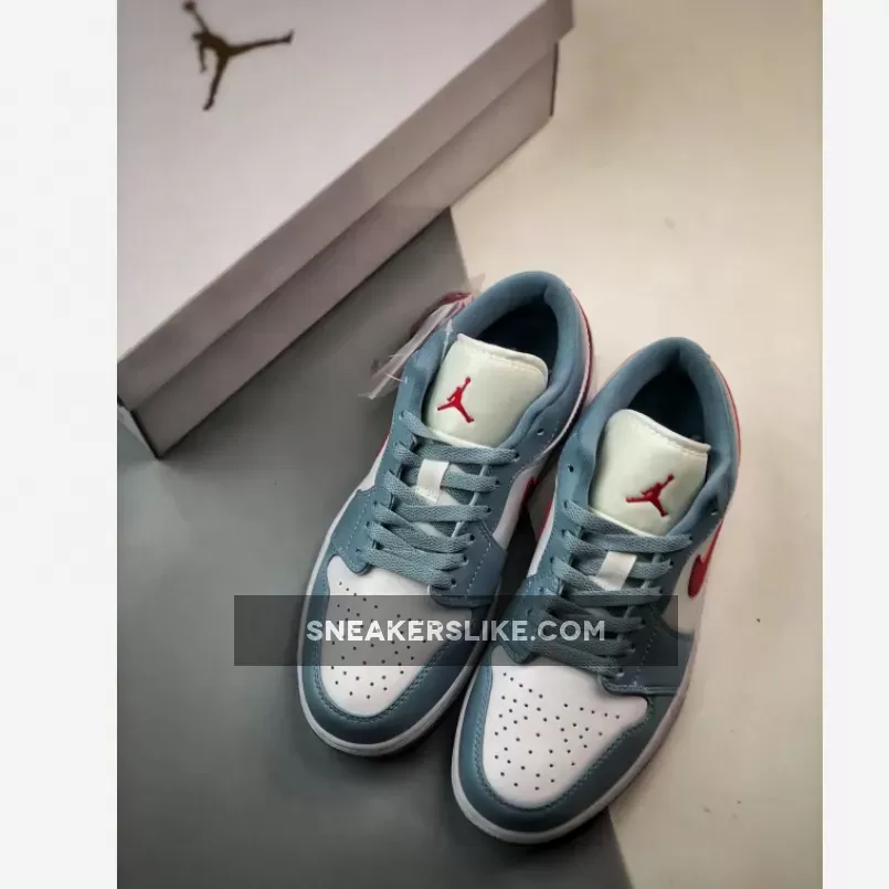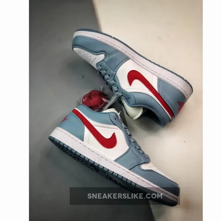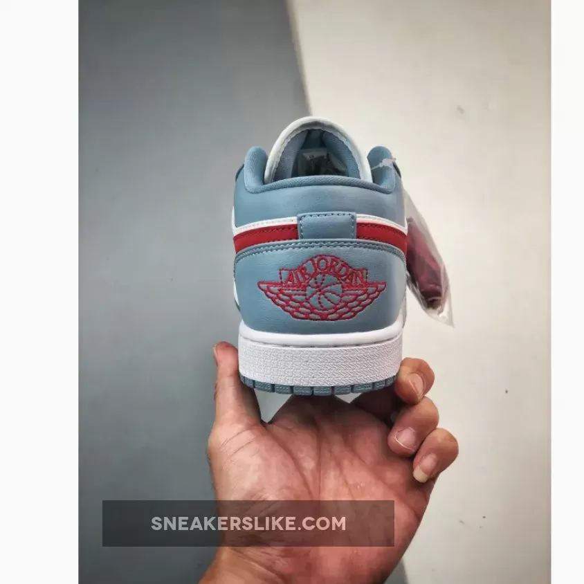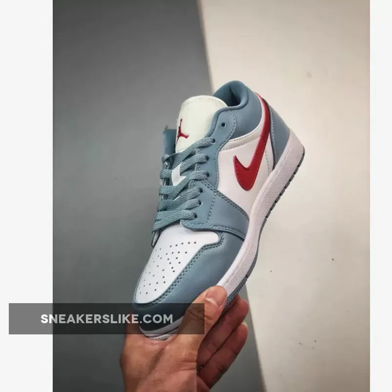 This Air Jordan 1 Low features an all-leather top in white, red, and light blue, similar to the Nike SB Dunk Low “Phillies” from 2022. The mudguard, eyestays, collar, and heel are all covered in a blue-grey hue, while a sail shade appears on the toe box, nylon tongue flap, and quarter panel.