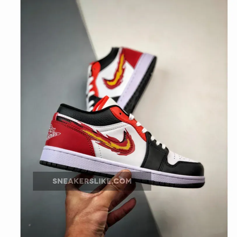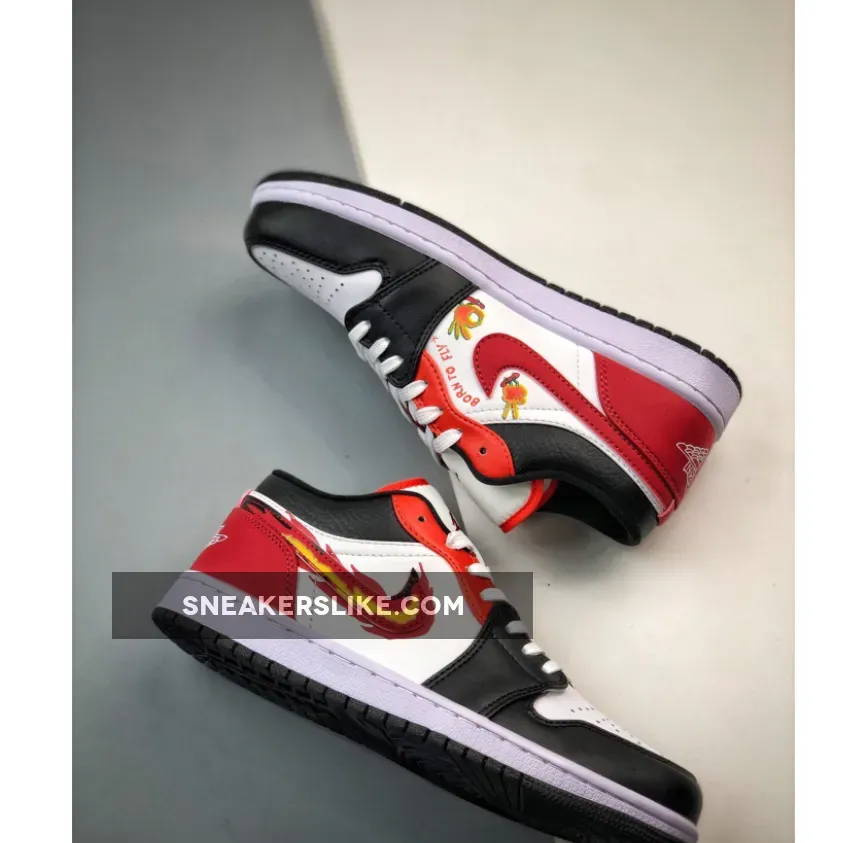 This offering of the Air Jordan 1 Low comes constructed in a smooth and tumbled leather build with mesh tongues and lining. The shoe’s standout feature is the flaming Swoosh, which is made from a gradient of red, orange, and yellow, and gives the shoe its name. while having “Born To Fly” branding and hand signs on the medial. A White midsole atop a Black rubber outsole completes the design. The release even comes with a Gold Jumpman sticker.