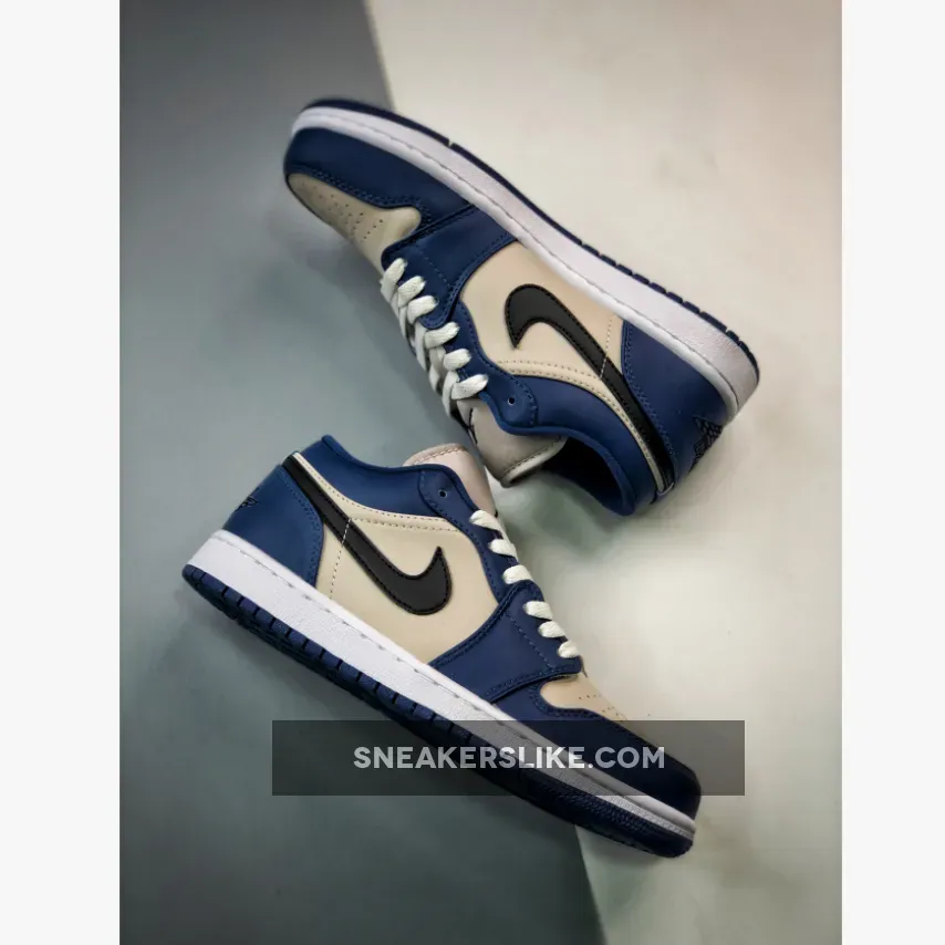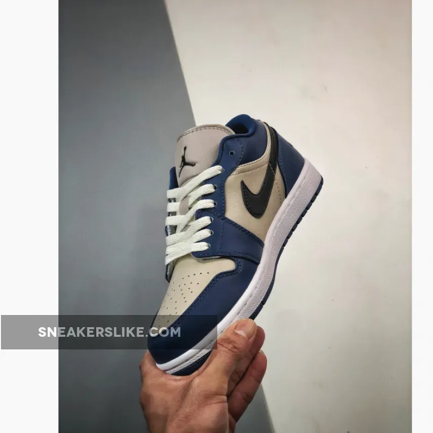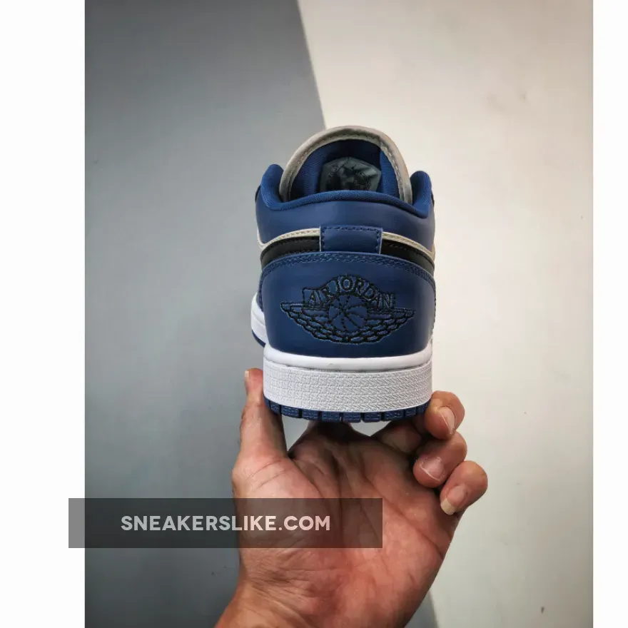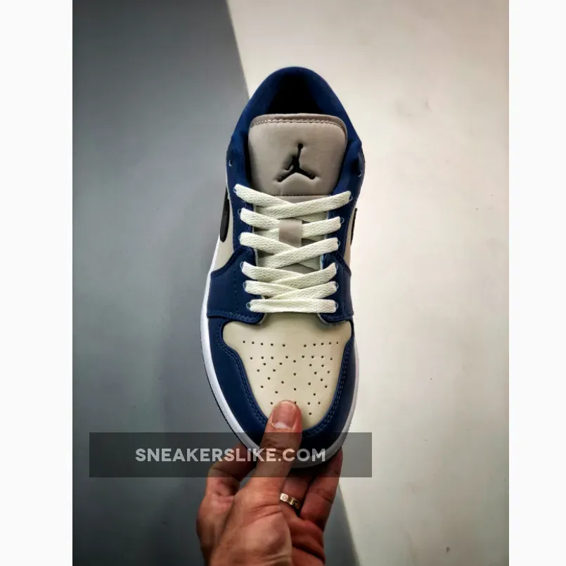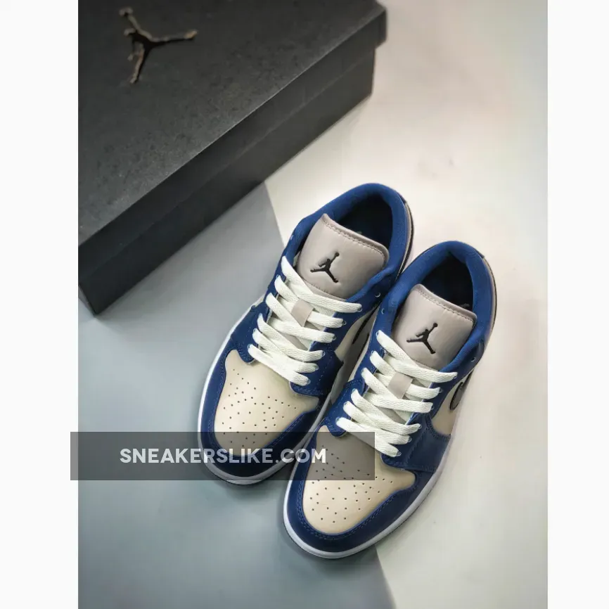 this low-top Air Jordan 1 comes constructed with the usual leather build.Georgetown vibes hit the upper as the sneaker has a Grey leather base and Navy Blue overlays complete with a soft sheen. The signature Nike Swoosh is dressed in Black, as well as the Jumpman on the tongue and Air Jordan Wings on the heel. Other details include White on the laces and midsole and a Navy rubber outsole.