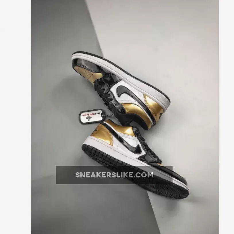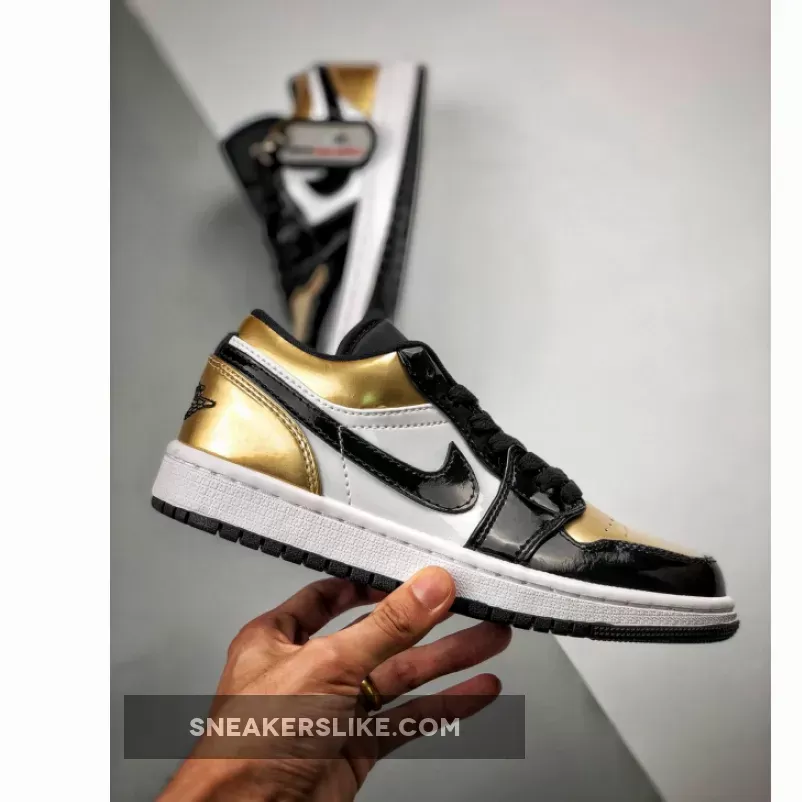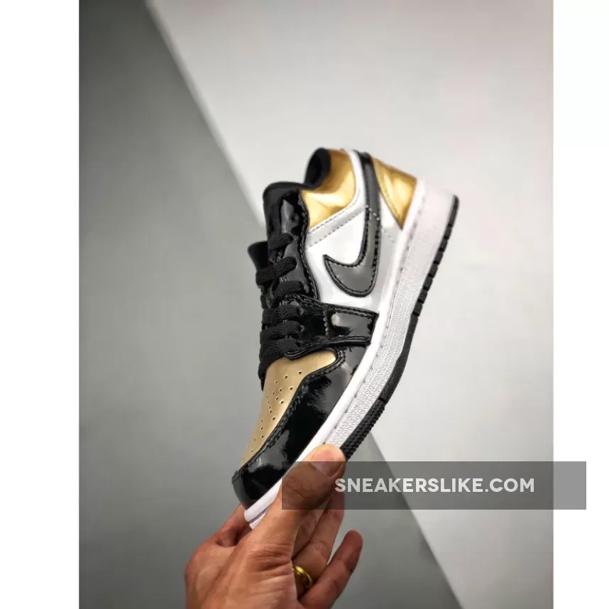 Dressed in a Black, White and Gold color combination. This Air Jordan 1 Low features White leather on the panels while Black leather covers the overlays. Following is the use of Gold patent leather on the toe and heel.