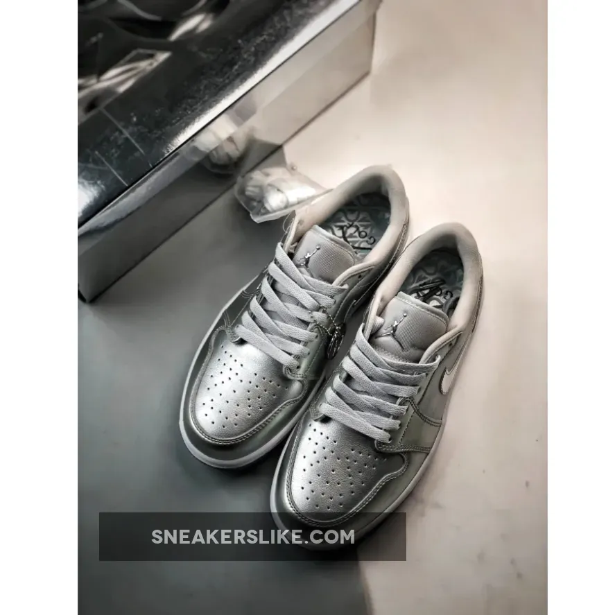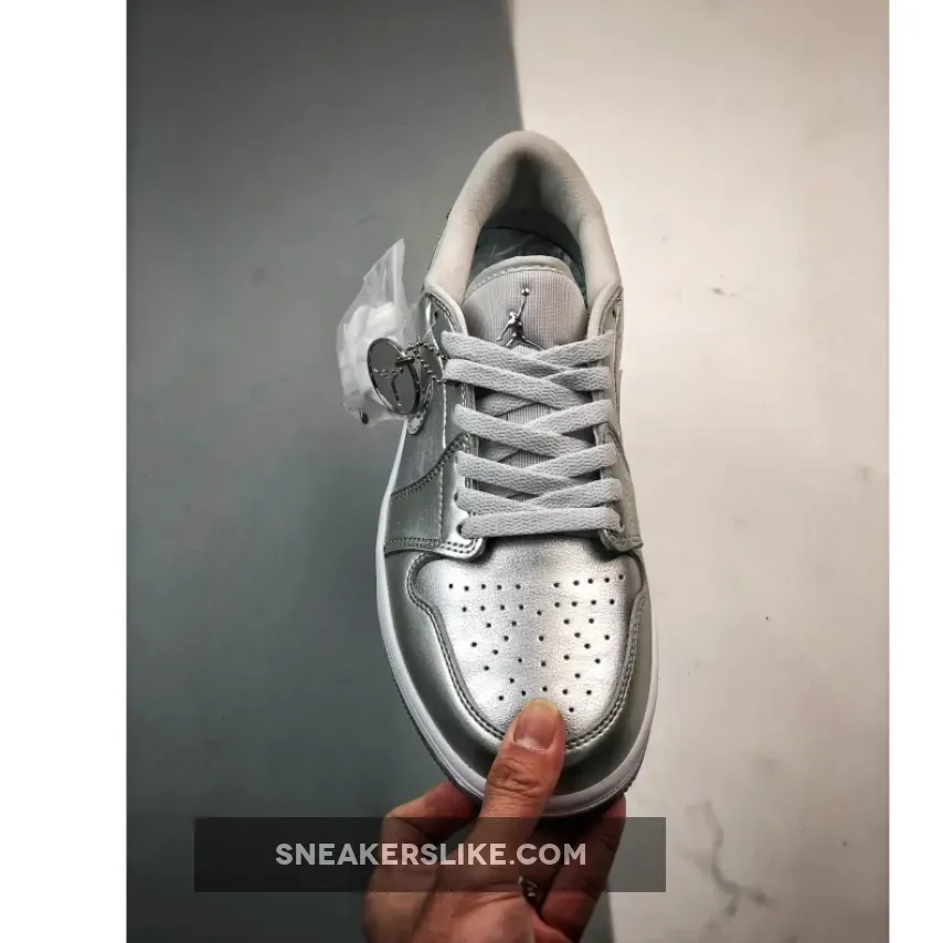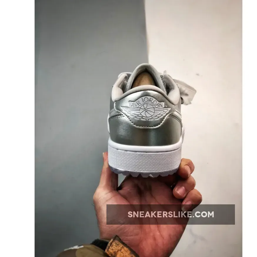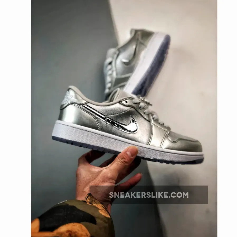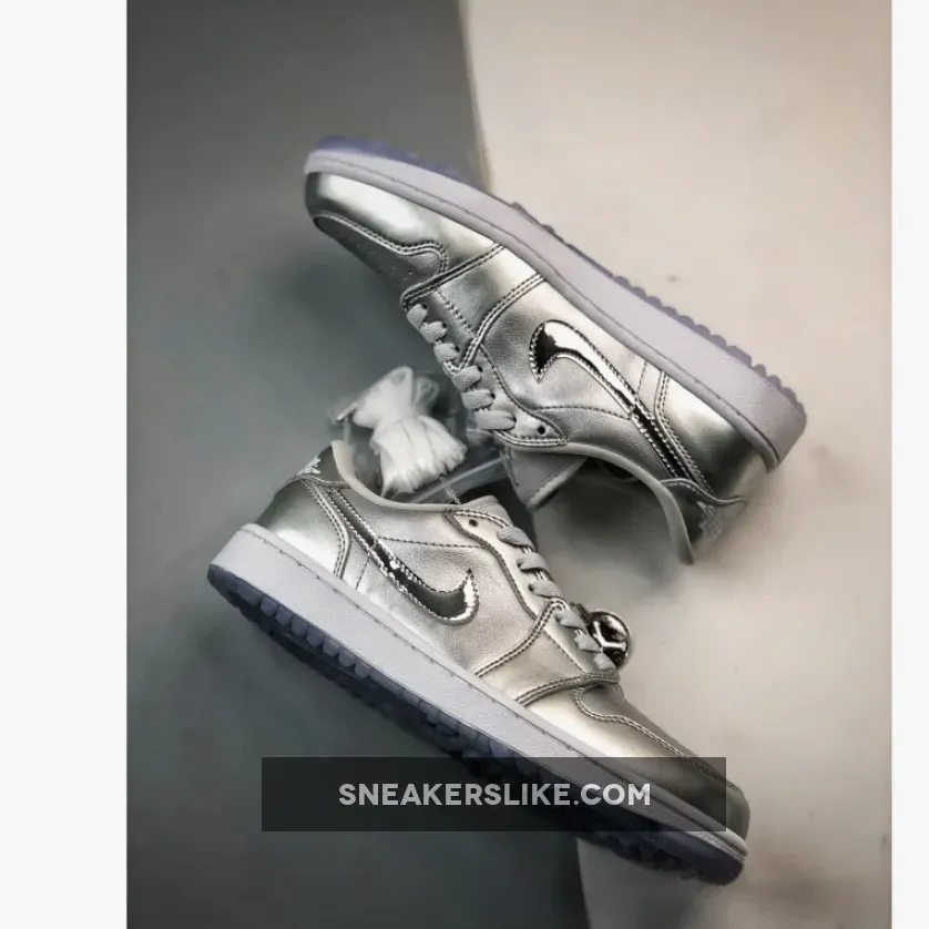The Air Jordan 1 Low from this collection is decked out in Metallic Silver, Photon Dust, and White hues. This golf-ready shoe boasts a Metallic Silver leather base for durability and breathability with perforations on the toe box. The Photon Dust mesh on the tongues and inner lining adds comfort and style. Chrome Swooshes provide a touch of elegance, and the insoles feature the iconic “23” pattern. The design is completed with a White midsole and a golf-appropriate icy Blue translucent outsole, featuring the same “23” emblem.
