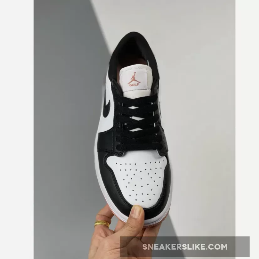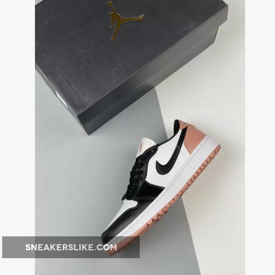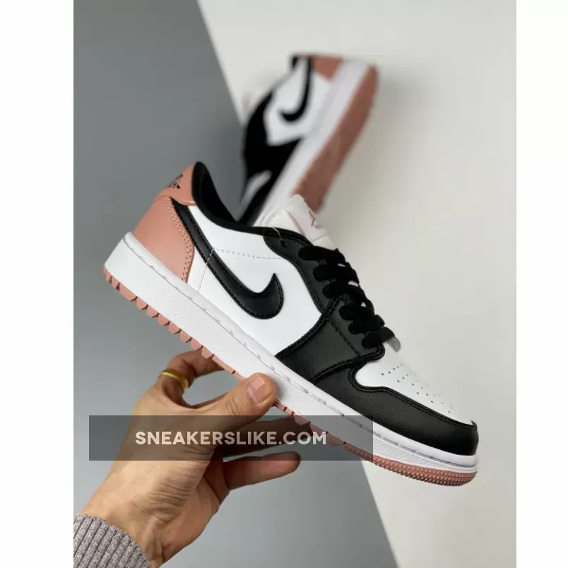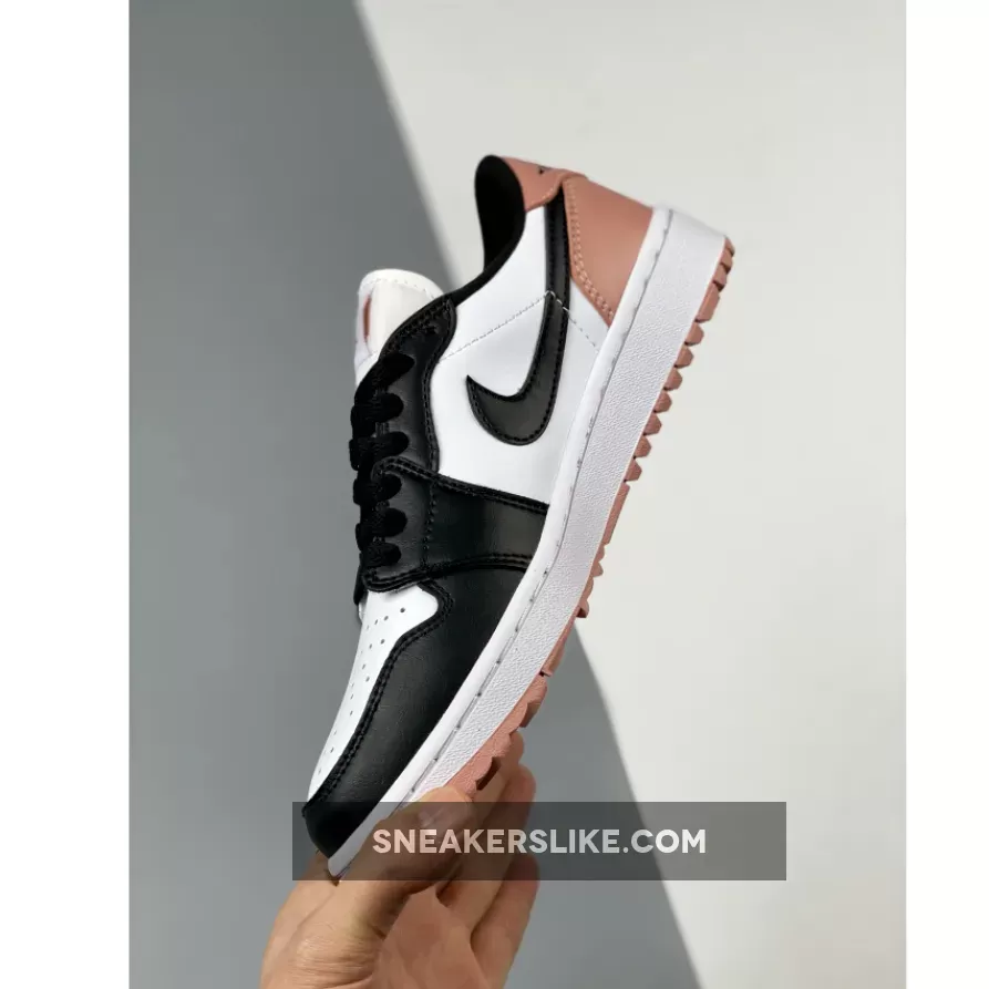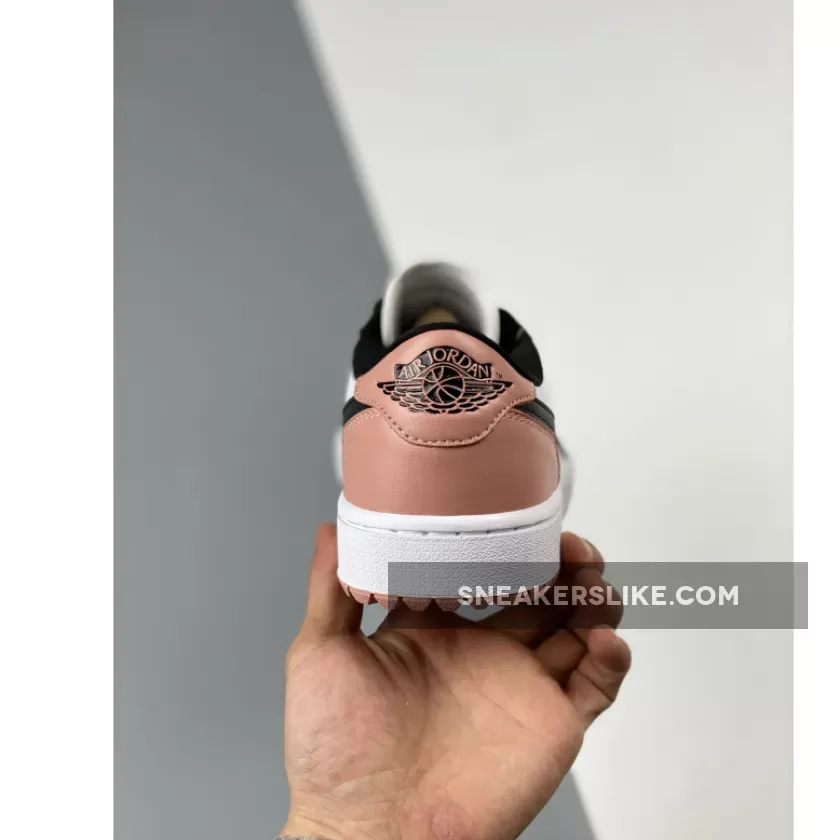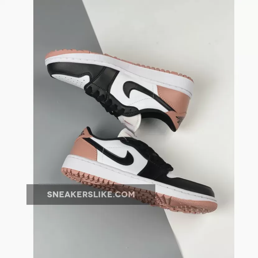 The Jordan Brand’s Air Jordan 1 golf line built with soles designed for the fairway, the Air Jordan 1 Low Gold, has a new offering featuring a black toe and a touch of rose. Get ready for the Air Jordan 1 Low Golf Rust Pink. This low-cut AJ1 Golf starts out with a “colourless” smooth leather base showing on the perforated toe box and the mid-panels. The smooth leather overlays on the toe cap, the mudguard and eye stay panels are all in contrasting pitch black. The laces, signature profile Swooshes on both the medial and lateral mid-panels and the plush sock liners all jump on the black bandwagon. A lovely shade of Rust Pink enters the picture on the leather heel tabs showing off black embossed “Wings” logos, the heel counters, the Jumpman branding on the tongue labels and the insoles.