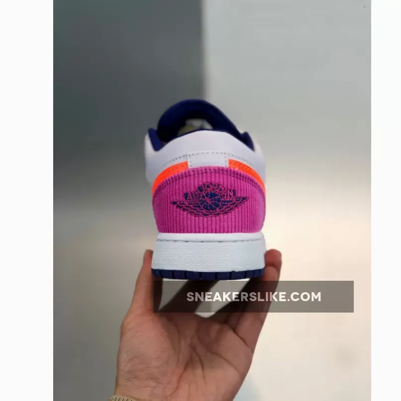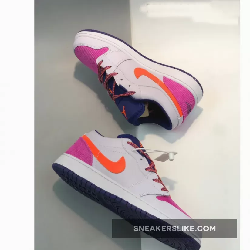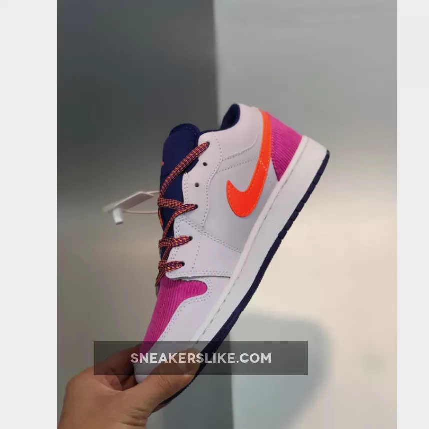 Dressed in a Barely Grape, Fire Pink, Regency Purple, and Hyper Crimson color scheme. This low-top Air Jordan 1 features a premium leather base with Pink corduroy material on the toes and heels. Crimson covers the Swooshes and Jumpman logos completed with a speckled laces.