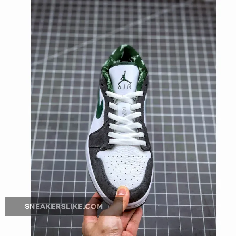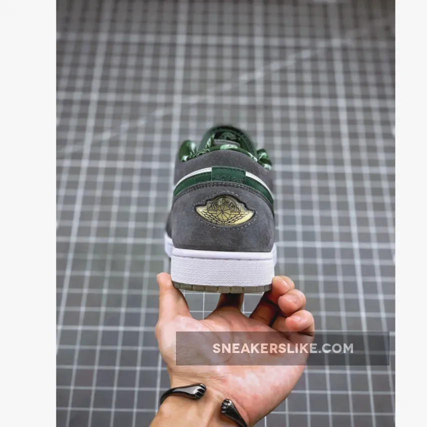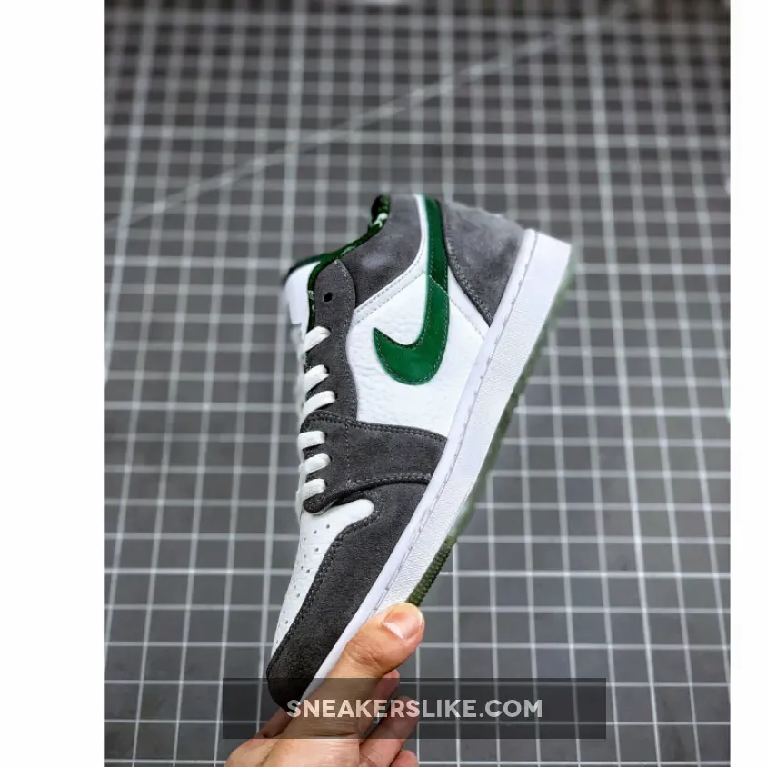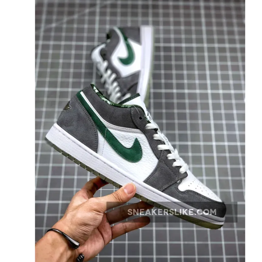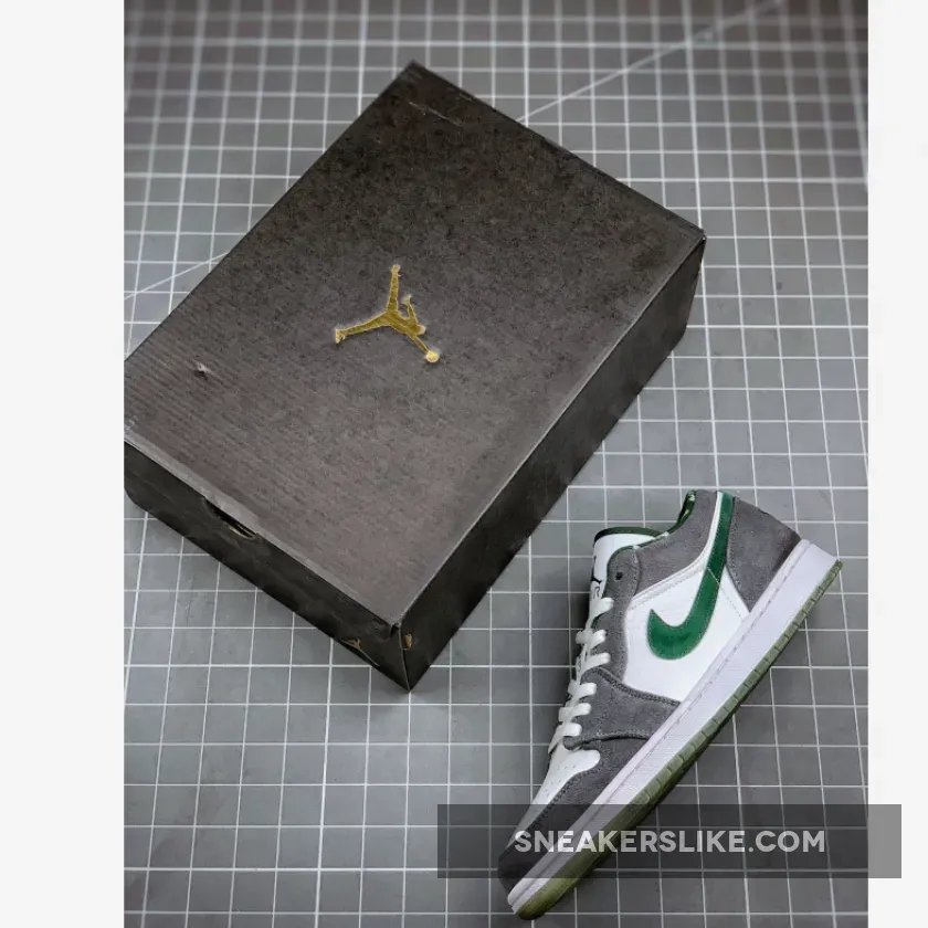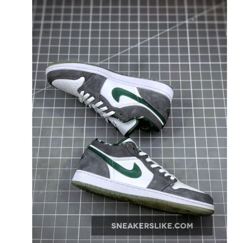 The Air Jordan 1 (I) Low North Side – White / Dark Forest – Light Graphite is part of the Air Jordan 1 (I) Regional Pack . It looks more like a Nike Dunk SB because of the leather and grey suede. It features a grey and white upper constructed from leather and suede, along with a clear outsole, which is a nice touch.