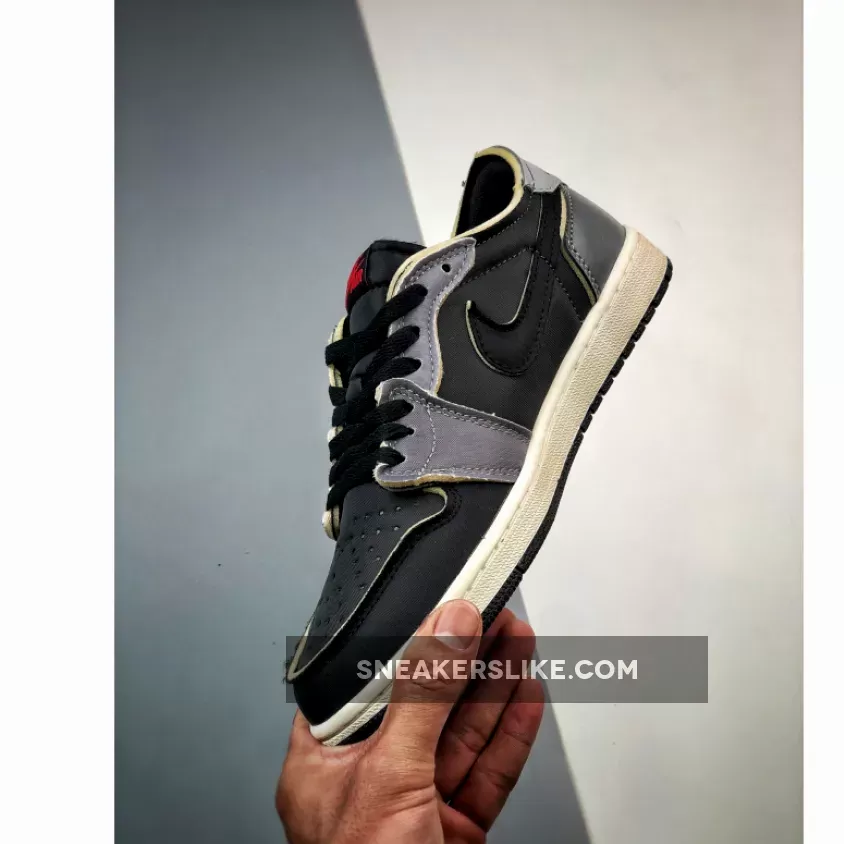 It’s been a long time since 1985 but the Air Jordan 1 continues to innovate. One of its recent iterations experiments with a deconstructed look. Introducing the Air Jordan 1 Retro Low Ex Black Smoke Grey. The base of this AJ1 is black ballistic nylon. The dissected aesthetic of this shoe comes in the form of exposed foam overlays in black on the toe cap and Smoke Grey on the eye stay panel, the heel counter and the collar edge of the heel tab. Even the black nylon profile Swooshes on both sides of the shoe are distinguishable because of their purposely unfinished edges. Nike Air branding in bright, contrasting red stand out on the nylon tongue and the black insole.