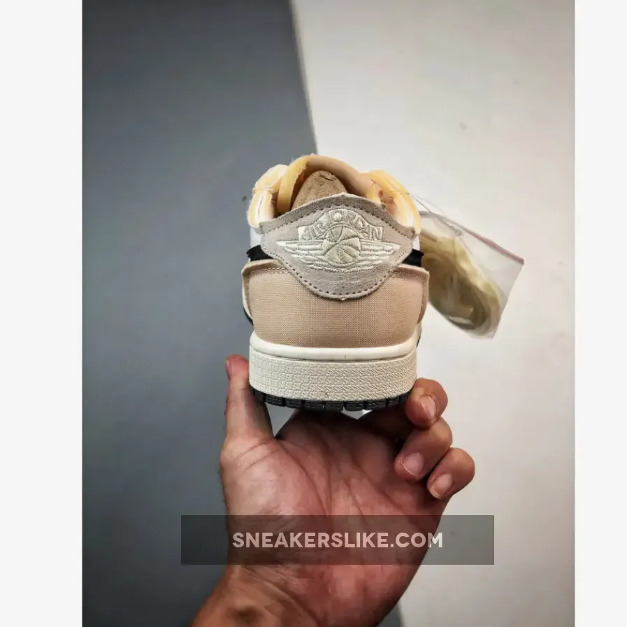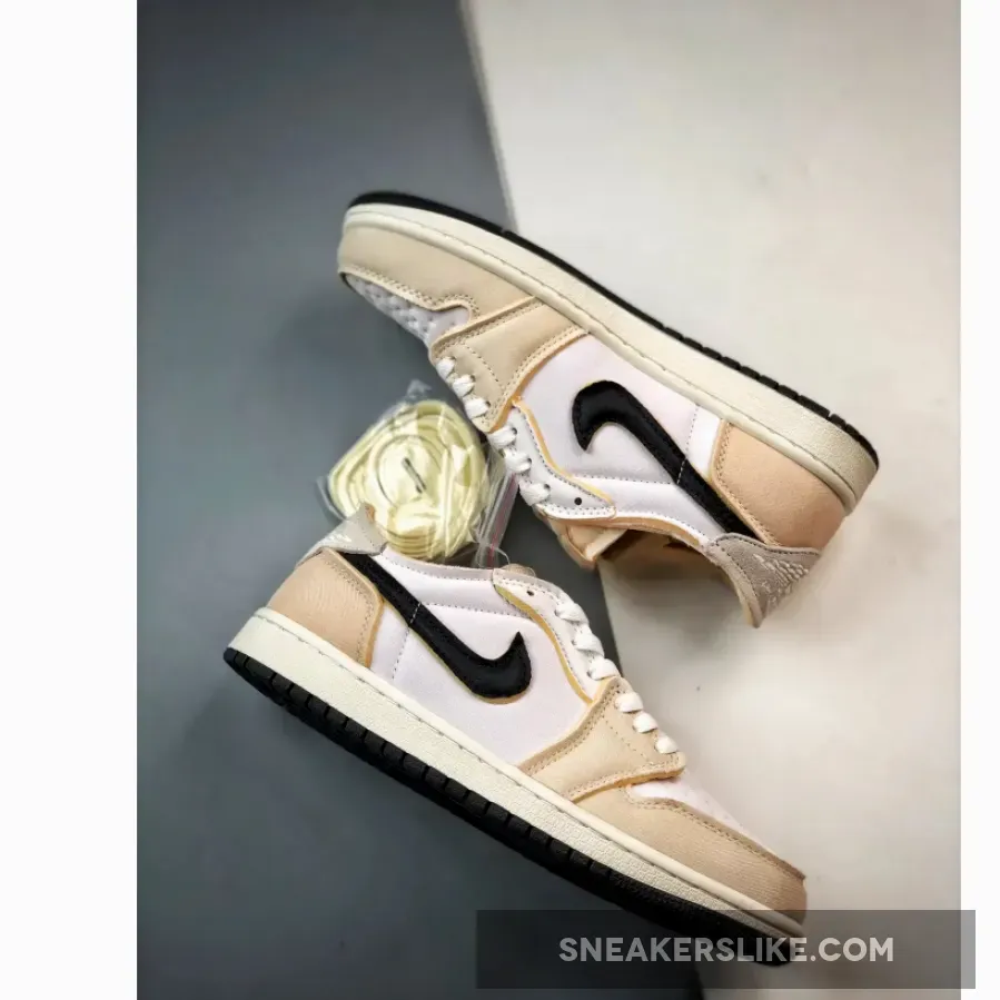 The “Coconut Milk” colorway features the same utilitarian design that focuses on water resistance. Borrowing the silhouette from the Air Jordan 1 Low OG, the shoe features a slightly modified upper. The base layer has a deconstructed aesthetic as the Swooshes and overlays feature exposed foam edges to give it a three-dimensional look. The upper is mostly a crisp, white base, featuring warm grey-sail overlays and a bold, black Swoosh. The shoe sits atop a sail-colored midsole and a black rubber outsole to match the Swoosh. The tongue is dressed in a light pink tone and the Nike Air branding is seen across the tongue tab and insoles while the Air Jordan branding is embroidered onto the heel to round out the design.