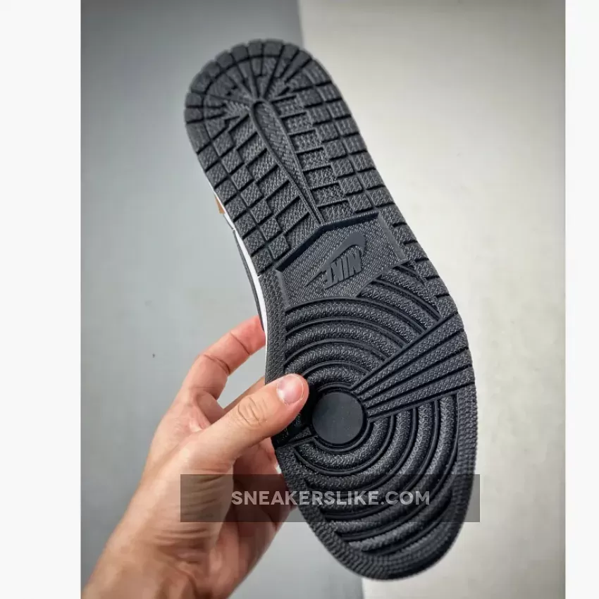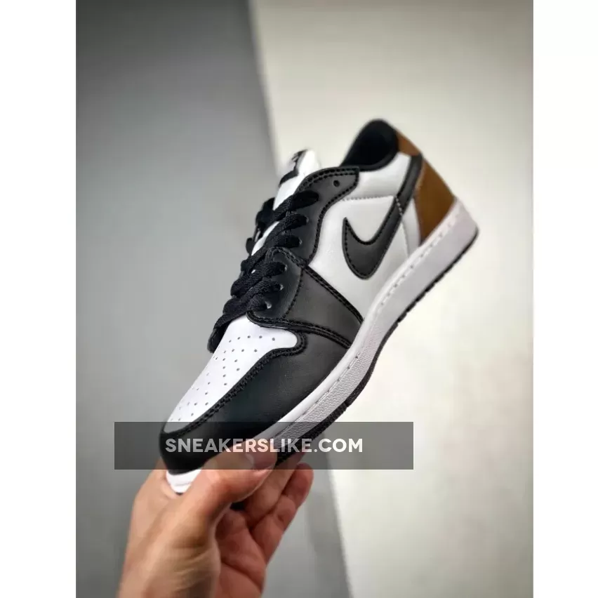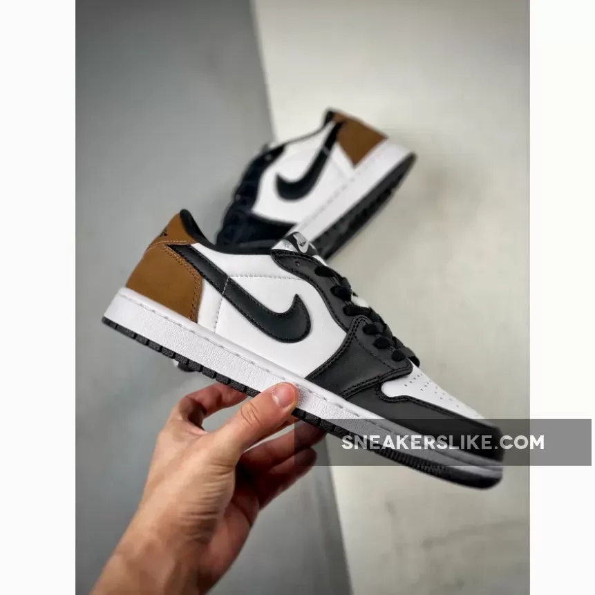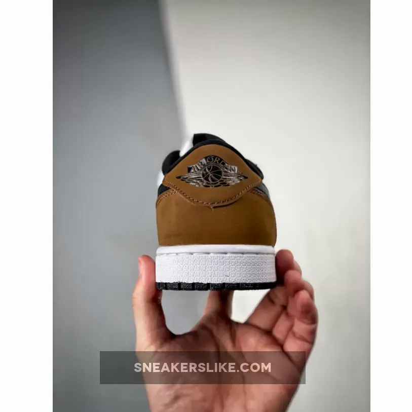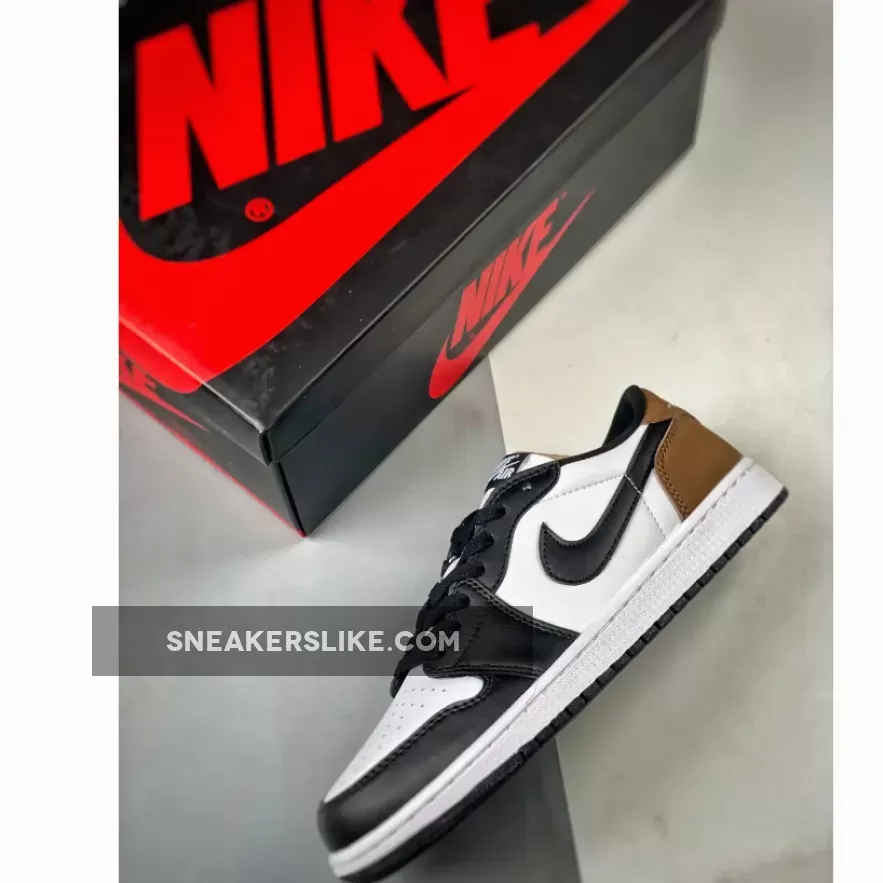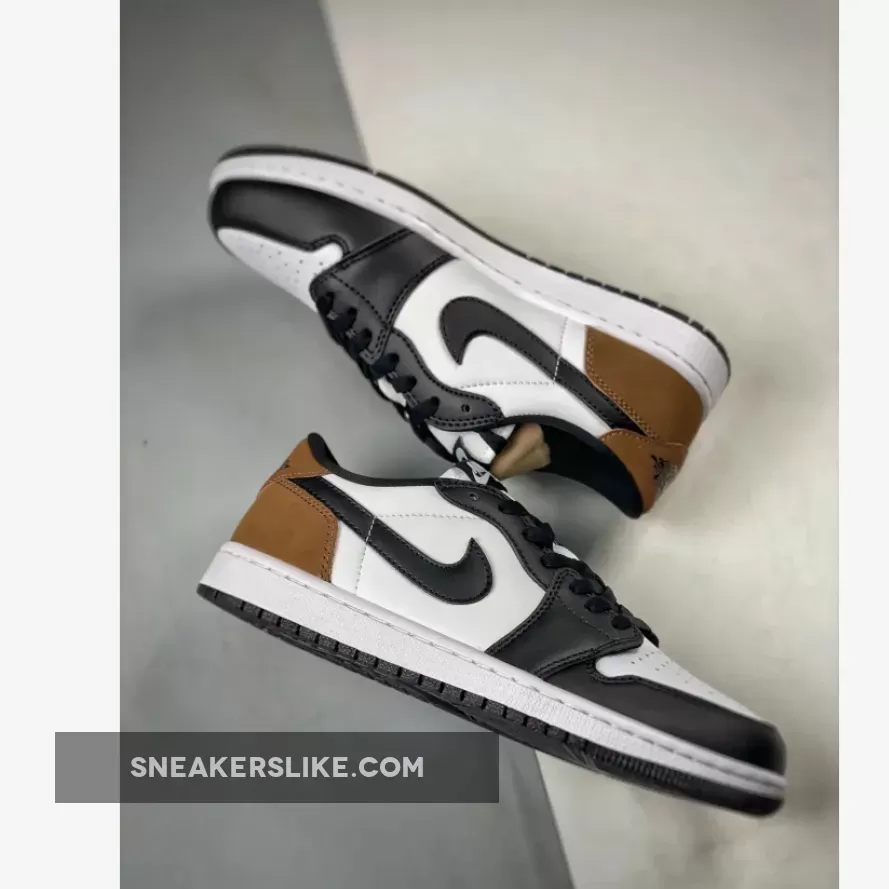 With its White, Black, and Palomino colorway and a design reminiscent of the 2020 “Mocha” Air Jordan 1 High OG, this low-top shoe offers a fresh look with its distinctive accents and branding.