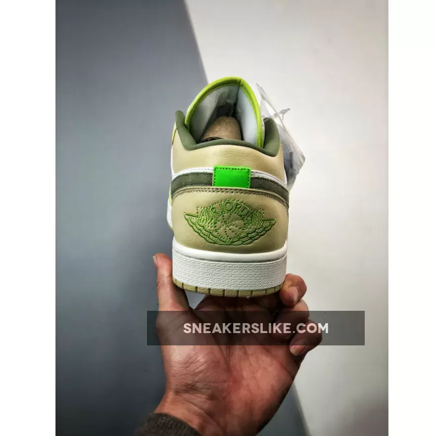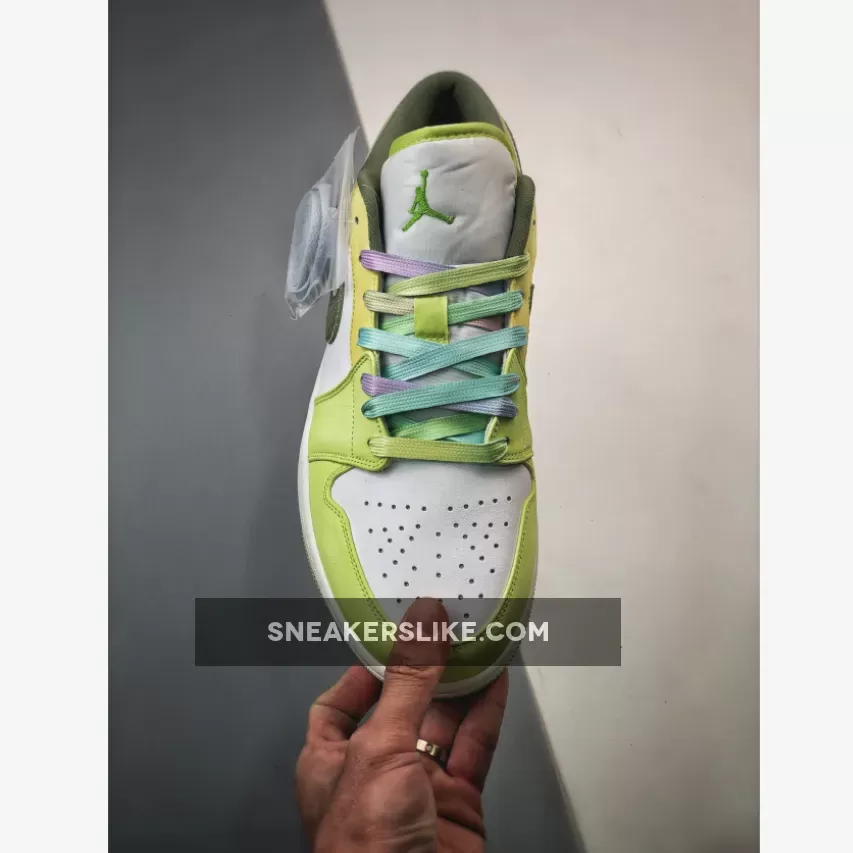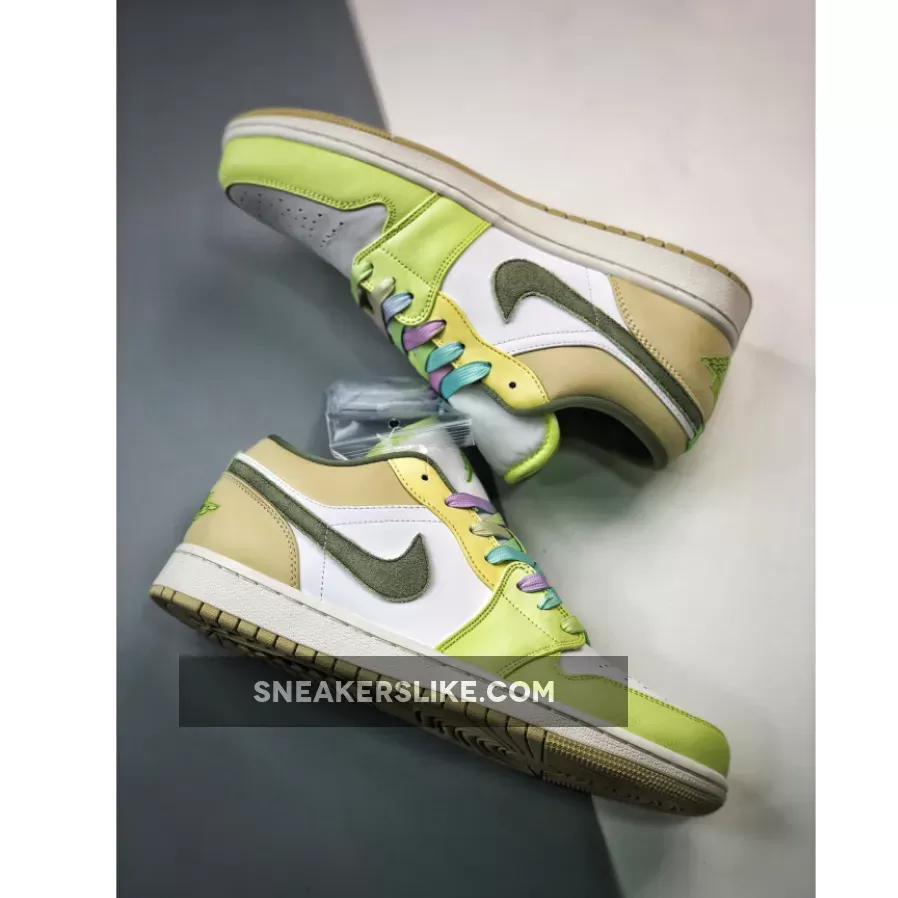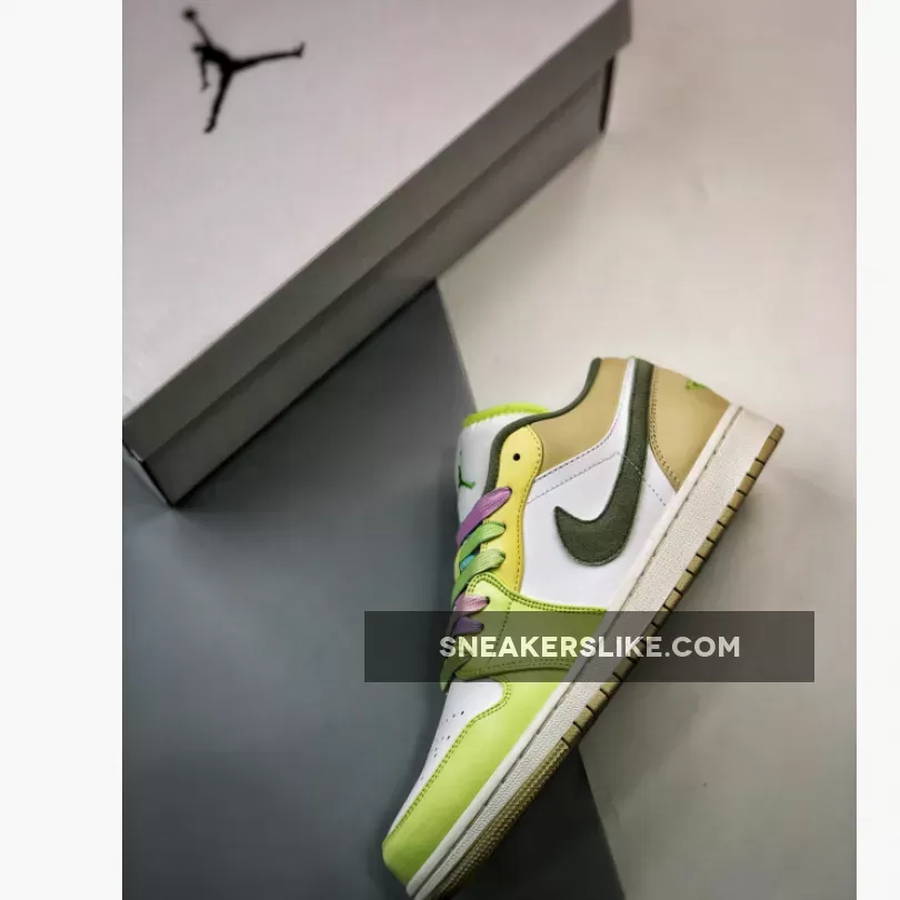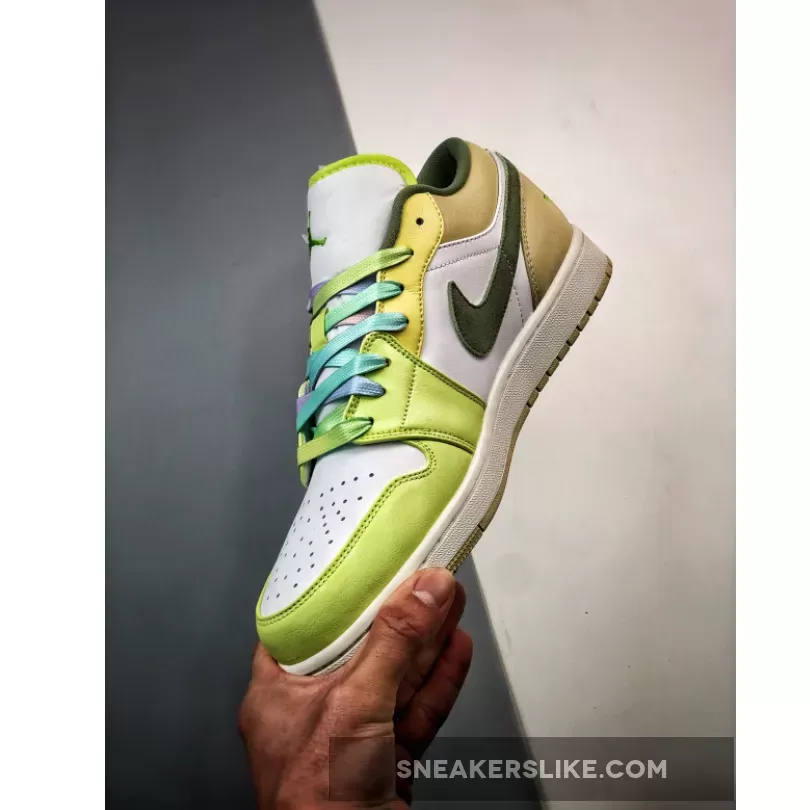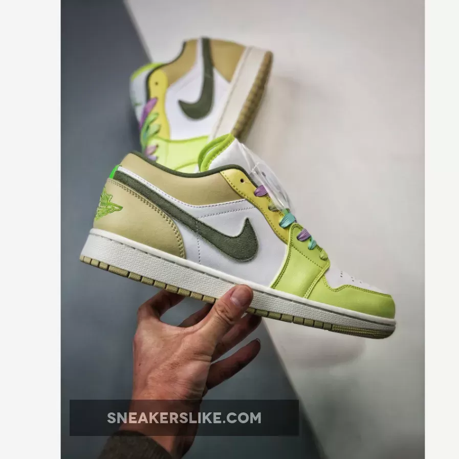 The OG iconic sneaker of the Jordan Brand, the Air Jordan 1, gets touched up with refreshing yellows and greens. Check out the Air Jordan 1 Low Volt Green Tan. This low-cut AJ1 has a “colourless” white smooth leather base. The toe cap and mudguard are in lime-looking Volt green while the eye stay panel is a light butter yellow. The heel counter and collar underlay are in a tan-looking Gold hue. The signature profile Swooshes on both the medial and lateral mid-panels are olive-coloured suede. Olive repeats on the plush sock liner and the mesh insoles. The laces are a light baby blue and the Jumpman logos on the white tongues as well as the embroidered Wings logos on the heel counters are Volt green.