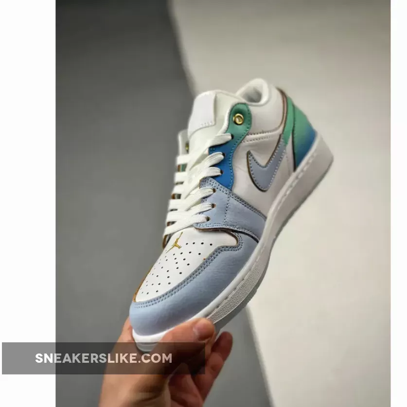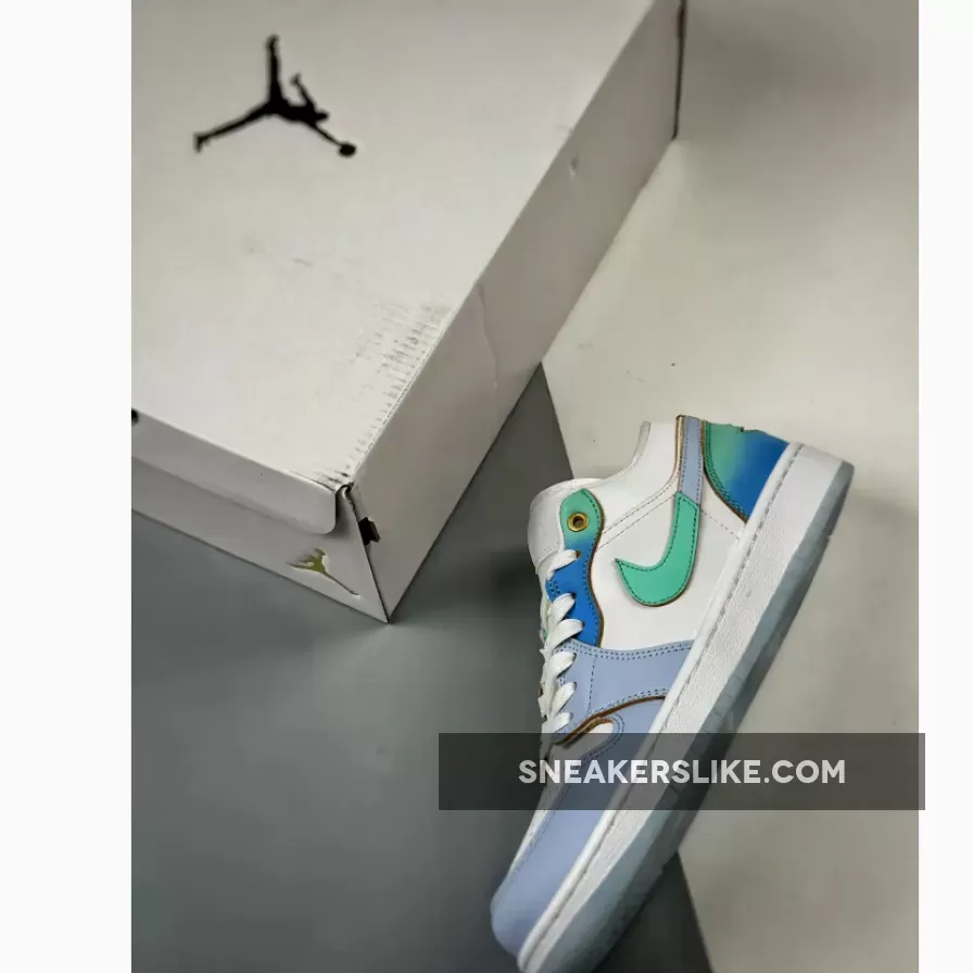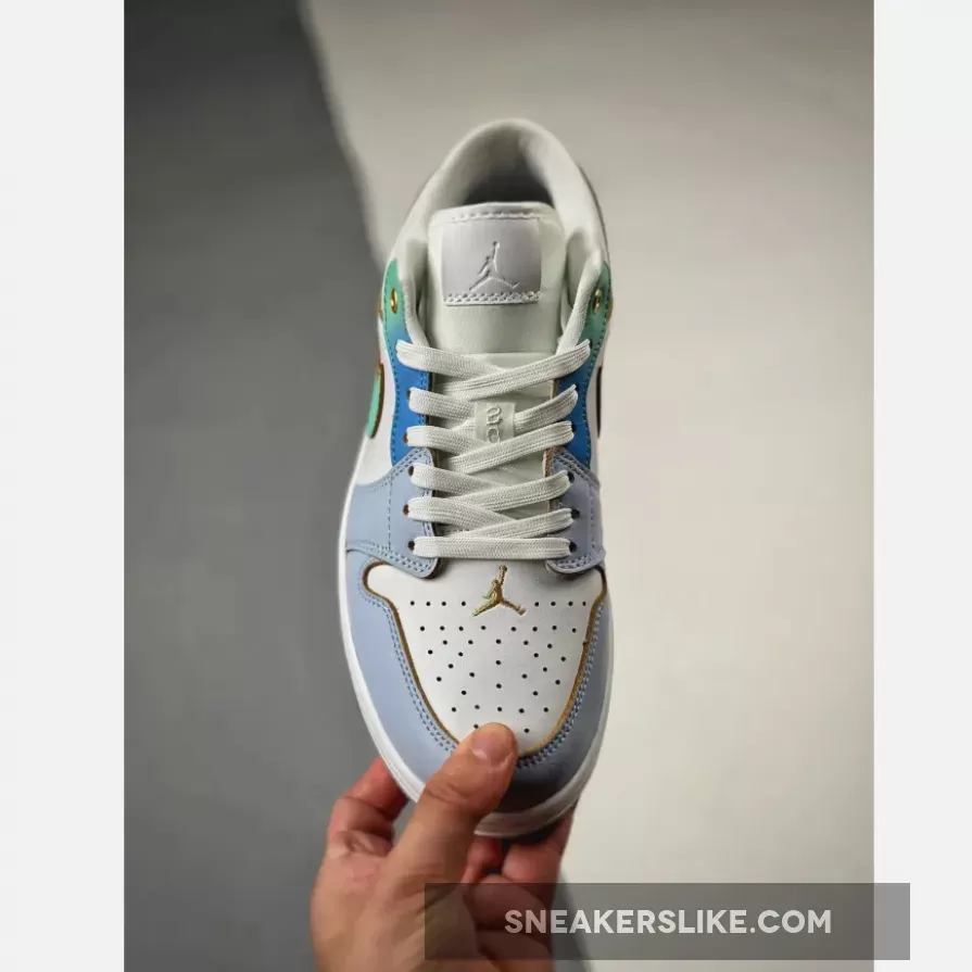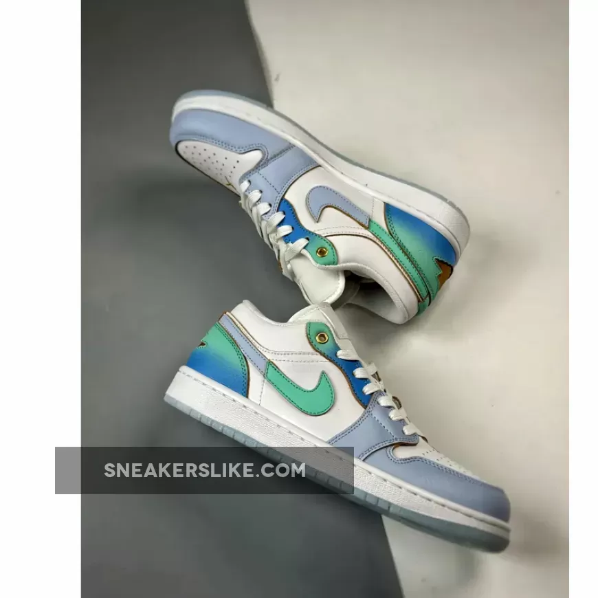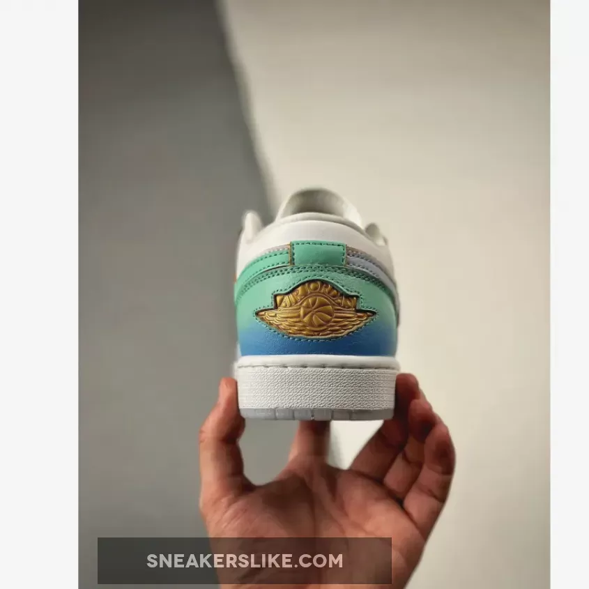 the Air Jordan 1 Low comes dressed in a White, Emerald Rise, Football Grey, Ice Blue, and University Blue color scheme. The sneaker blends smooth and tumbled leather materials, along with mesh tongues and a soft sockliner. The base has a “White” leather exterior paired with tumbled leather overlays. The eyestay and heel counter are painted with a gradient finish that fade from turquoise to mint. Finishing details include a Gold Jumpman logo on the vamp, a Wings logo on the heel, a White midsole and icy translucent outsole.