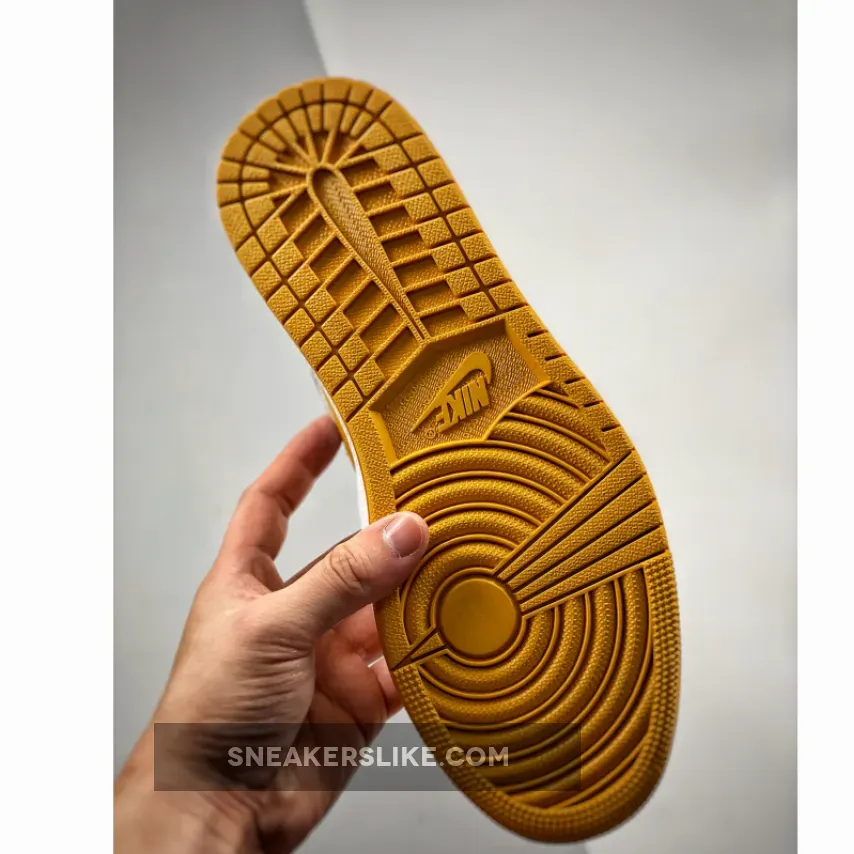 The latest Air Jordan 1 Low release will give you serious bumblebee vibes. Take a closer look at the Air Jordan 1 Low University Gold. This AJ1 Low looks absolutely cheerful with a “White/ Black/ University Gold” colour scheme. The toe box and quarter panels are in smooth “colourless” white leather. The toe box, mudguard and eye stay panel are all in the titular University Gold. The collar and heel counter, on the other hand, are pitch-black as are the laces.