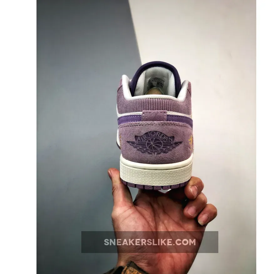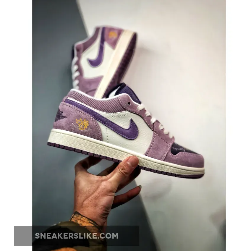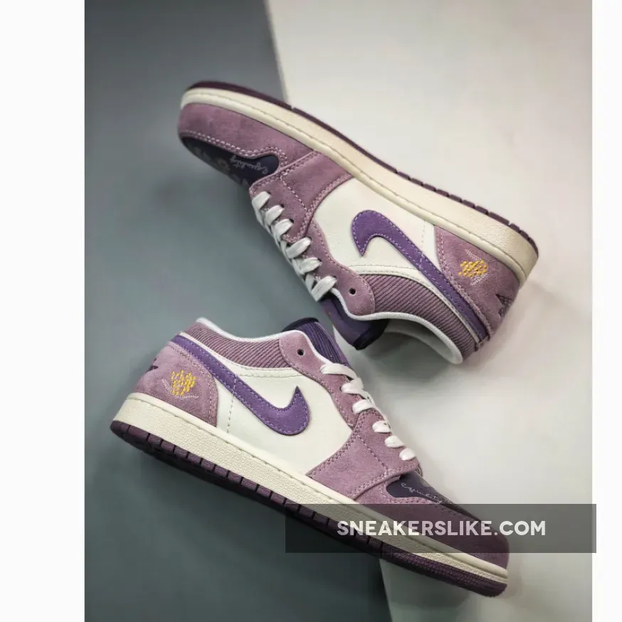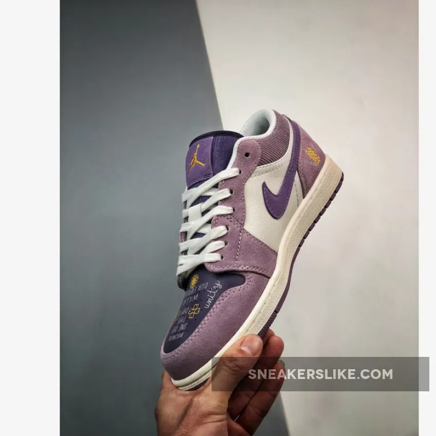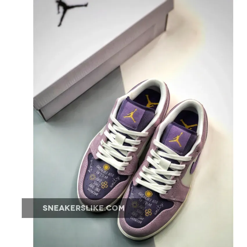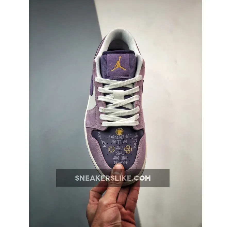 This Air Jordan 1 Low features various materials like leather, suede, and corduroy. Off-white hits the laces, midfoot base panel at the upper and midsole while various light purple hues cover the remainder of the shoe. As for materials, a leather base is joined by rough suede at the mudguard, lacing system and heel while corduroy lands on the collar and tongue. A special message lands on the toe box that reads ‘Because One Day, This Day Will Be Our Everyday,’ and we have ‘Unity’ and ‘Equality’ etchings. This yellow also appears at the heel’s embroidered flower graphics and Jumpman logos