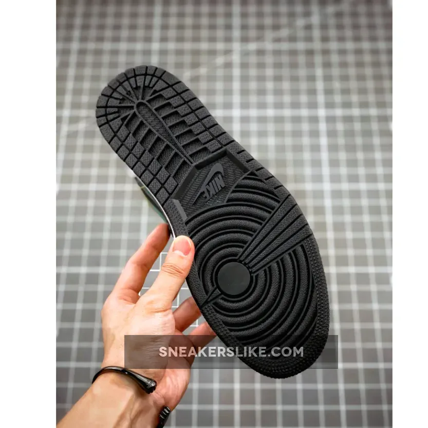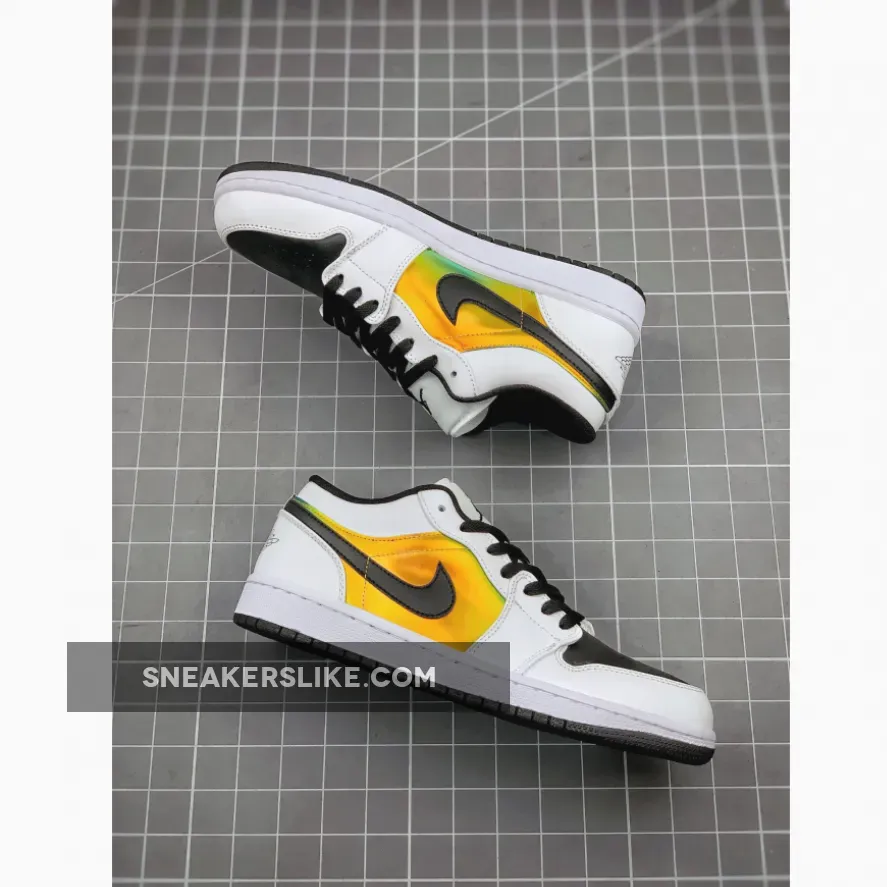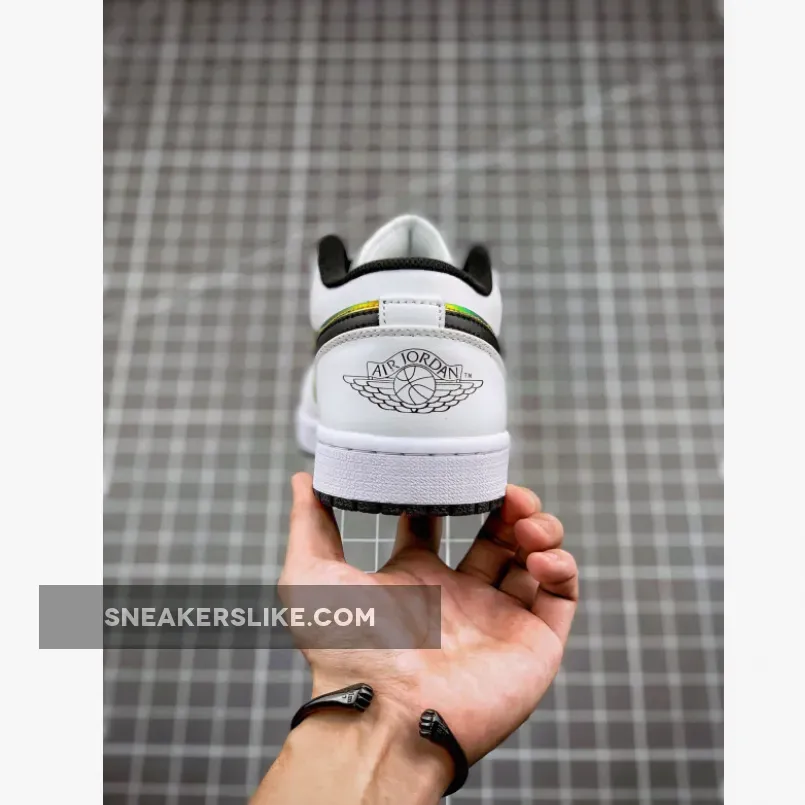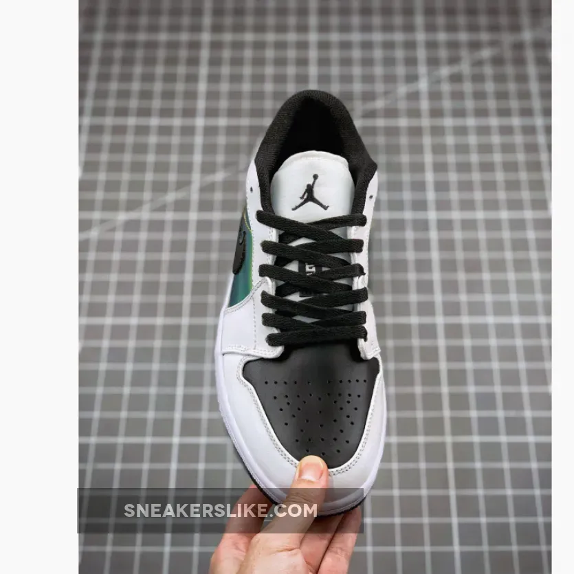 This offering of the low-top Air Jordan 1 features a White leather base with a Black toe box, Swooshes, laces, liner, Jumpman tongue logo, Wings logo, and rubber outsole.