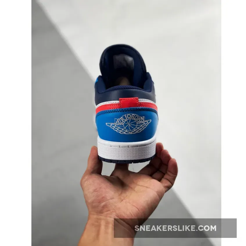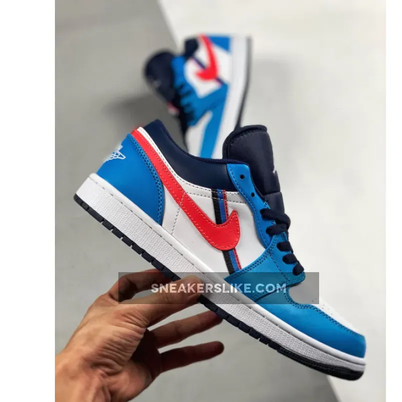 this low-top Air Jordan 1 comes with White leather across the base while Blue lands on the overlays and Crimson on the Swoosh logo. Following we have Navy Blue on the ankle, tongue, laces and outsole.