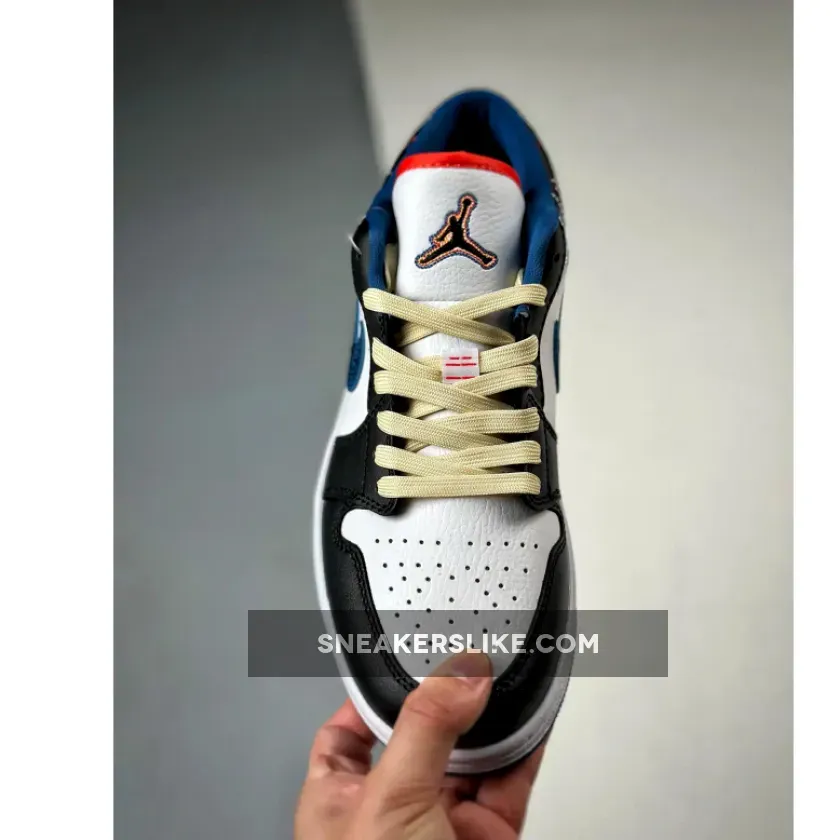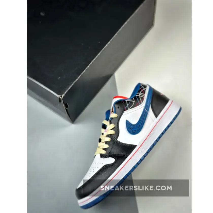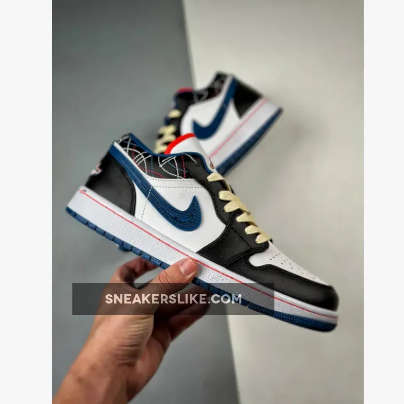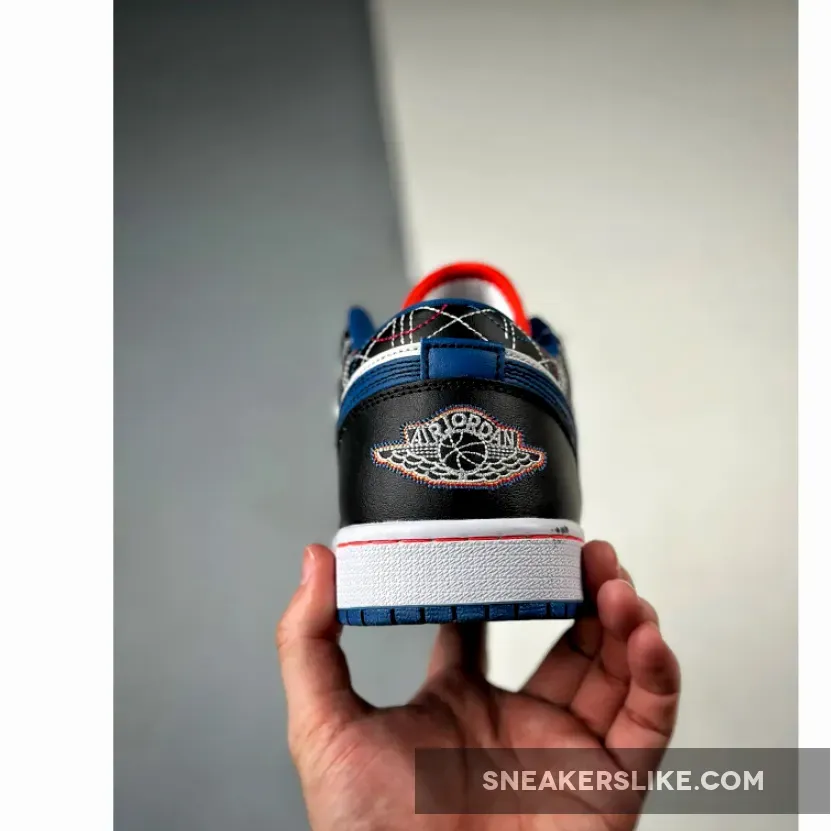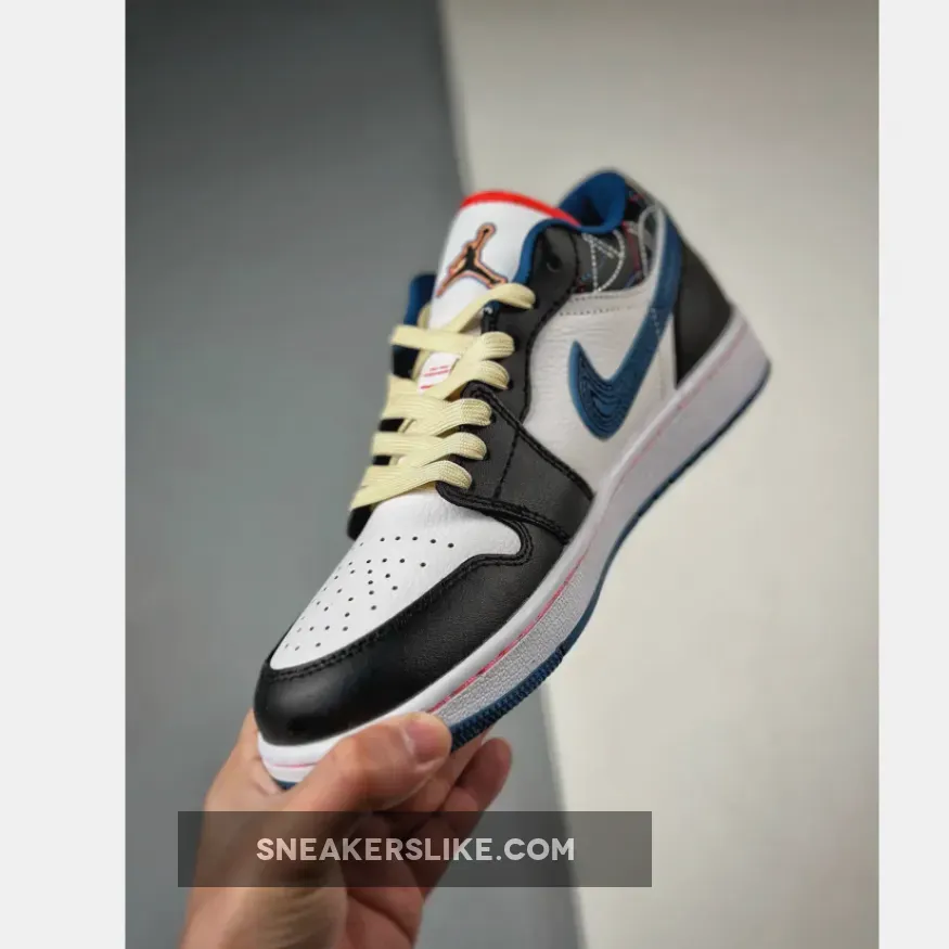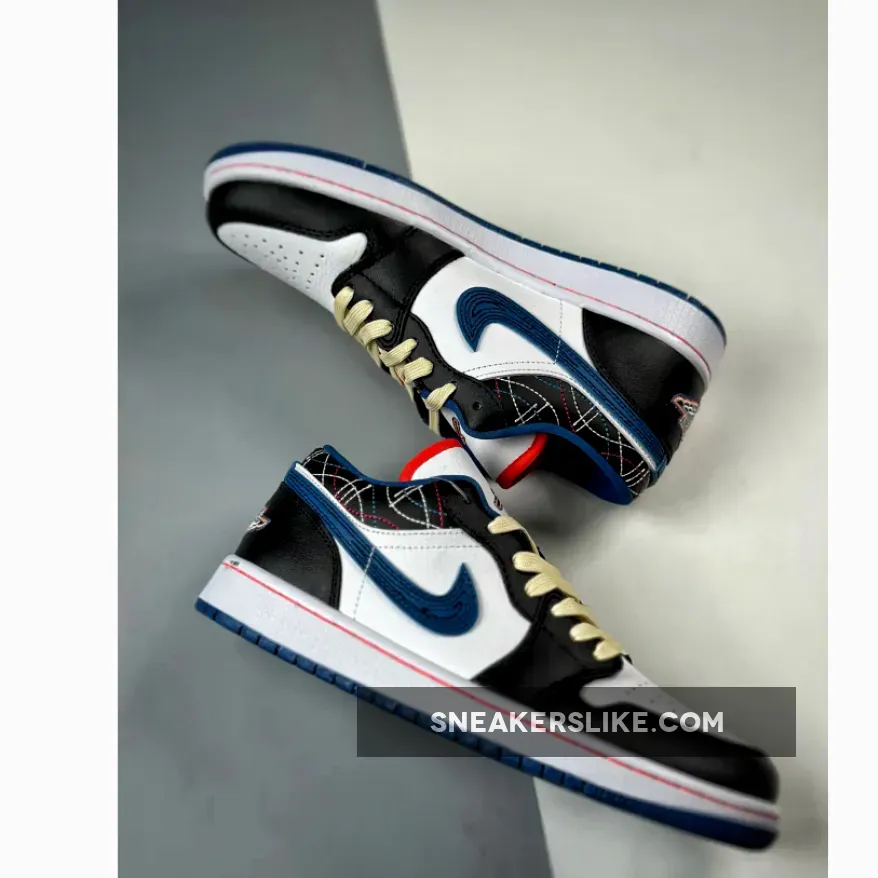 Jordan Brand continues to have fun with the Air Jordan 1 Low as this latest pair plays around with an assortment of colors as well as prints/textures. Taking on an official color makeup of White, Industrial Blue, Black and Siren Red, this Air Jordan 1 Low begins with a White leather construction on the base of the upper as well as on the tongues. On the overlays we then see Black leather which is hit with sashiko-inspired stitching on the Jumpman logos on the tongues, side panel Swooshes, the Wings on the heels, and the collars. For a punch of color we see Industrial Blue noted on the Swooshes, inner liner and rubber outsoles, Siren Red on the inner tongues and the stitching on the midsoles, and crea, laces for that popular aged aesthetic.