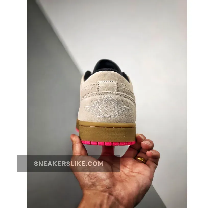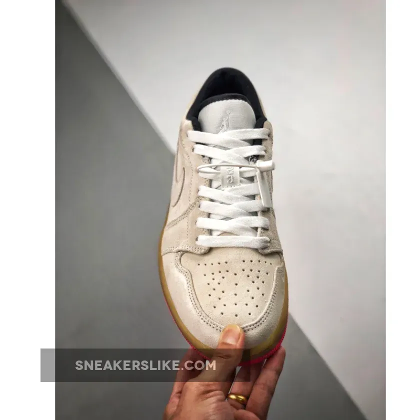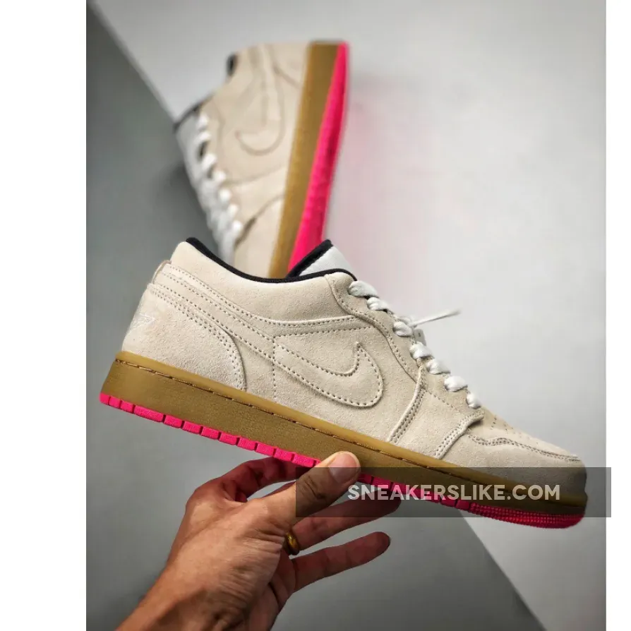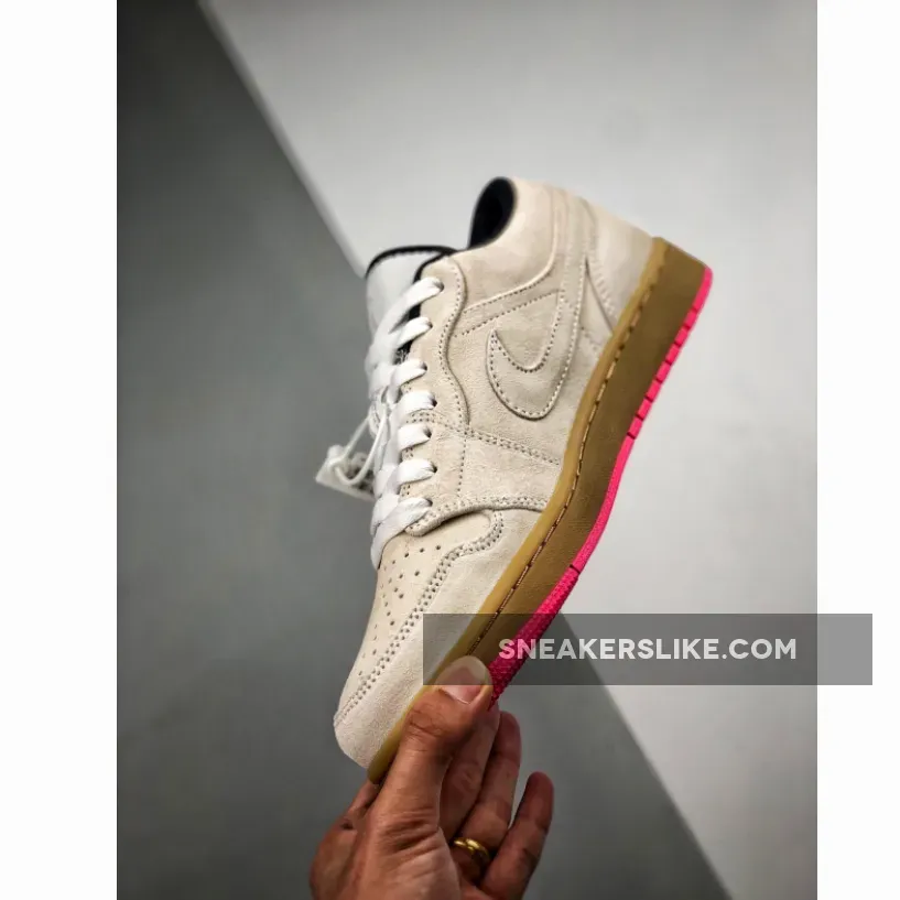 this Air Jordan 1 features Beige suede across the upper while White is used across the tongue and laces.