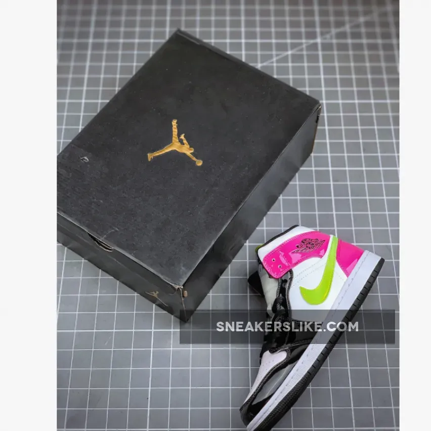 it features White leather across the base while both Black and Pink patent leather lands on the overlays. In addition the same material is applied to the Swoosh logos which is done in a Green – Yellow hue and Blue.
