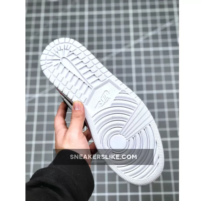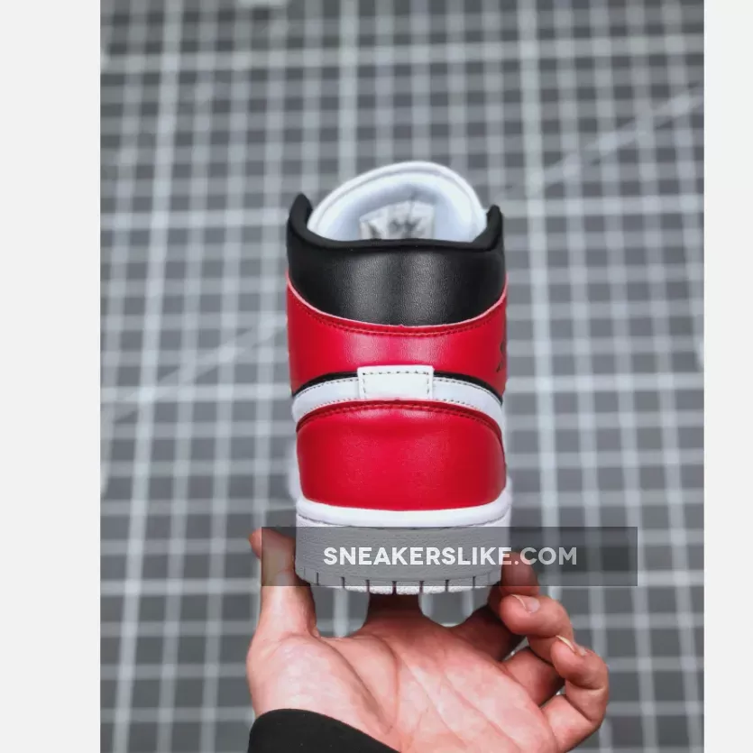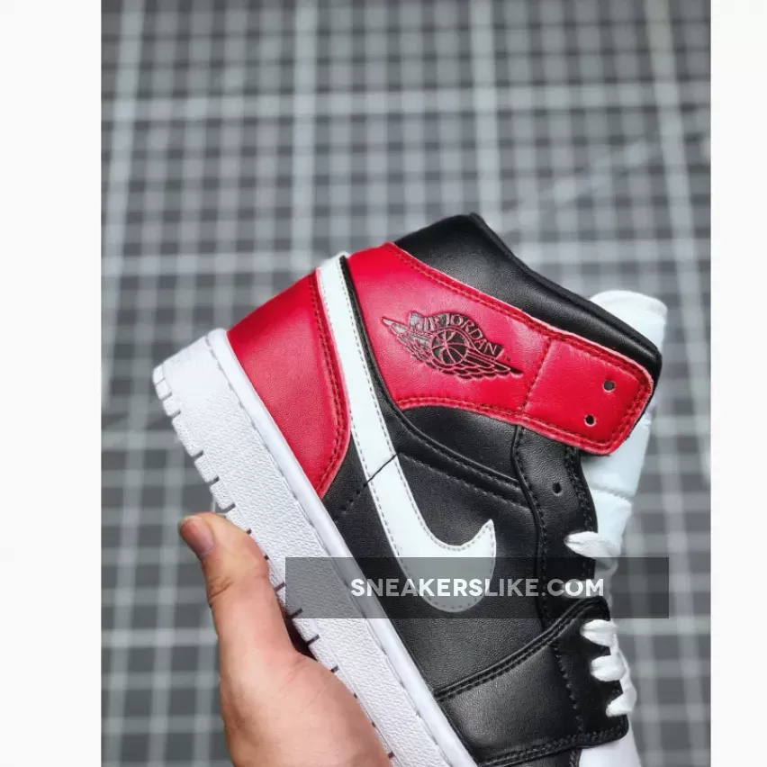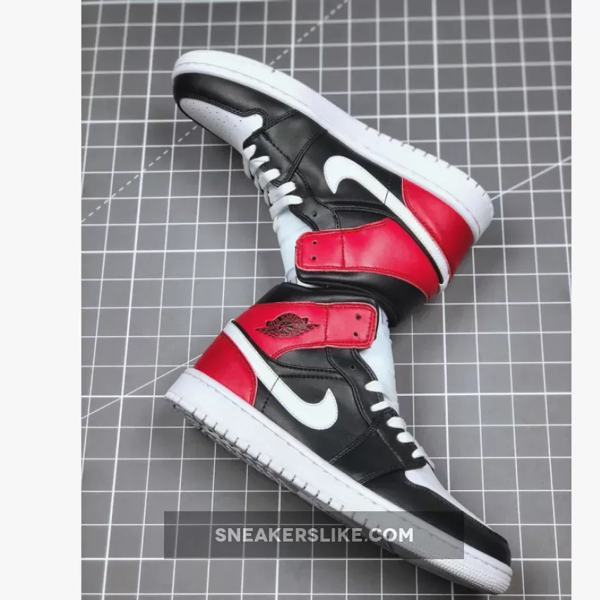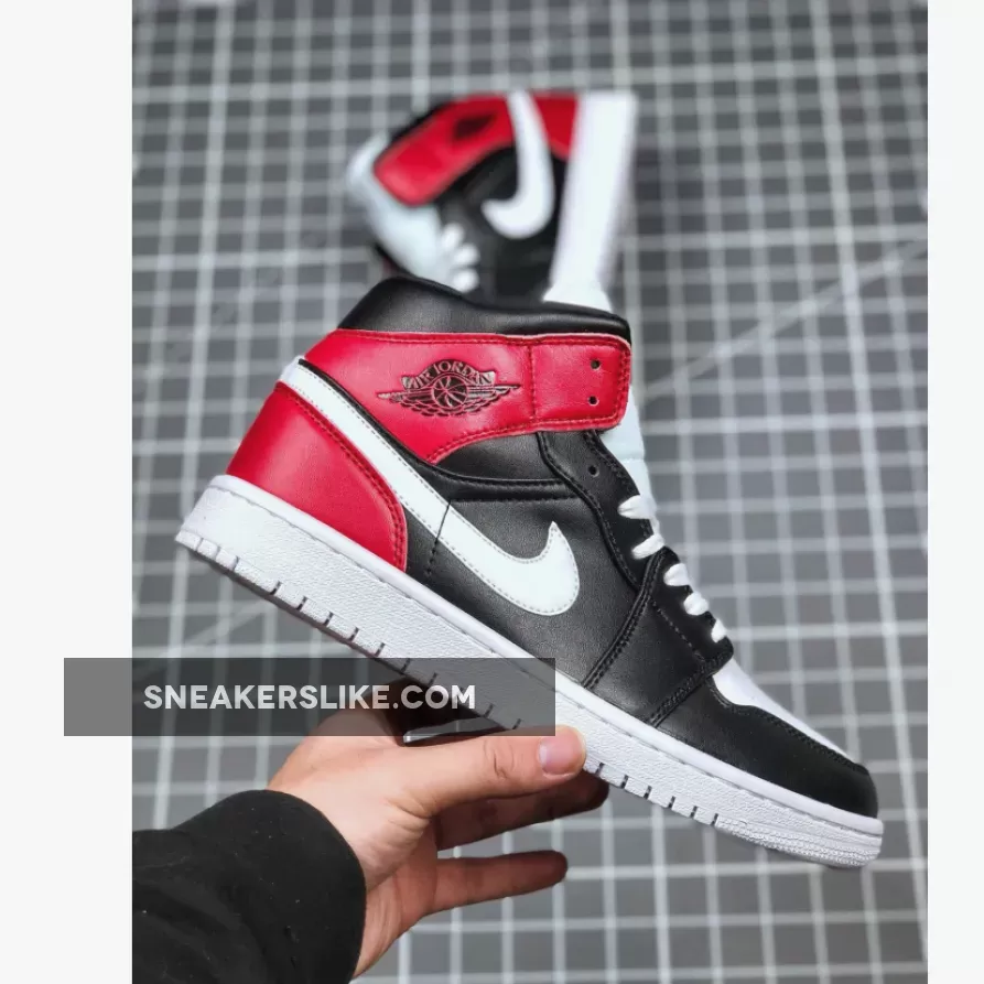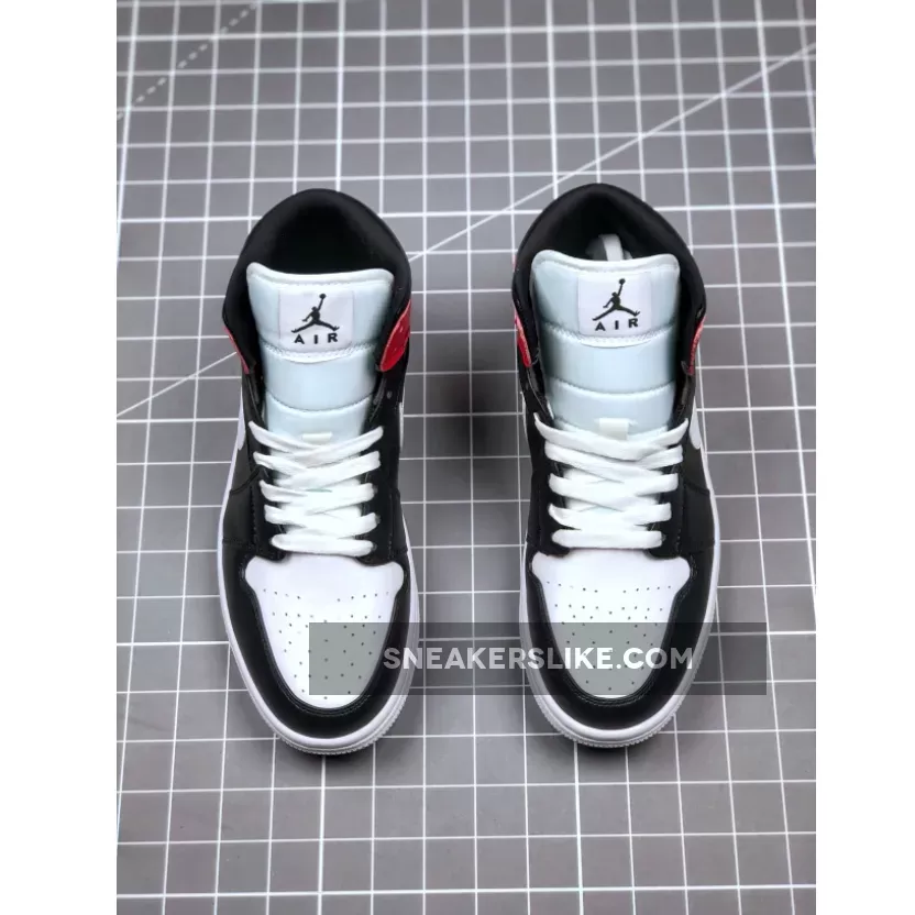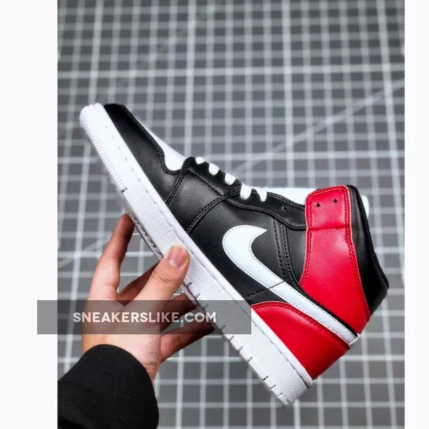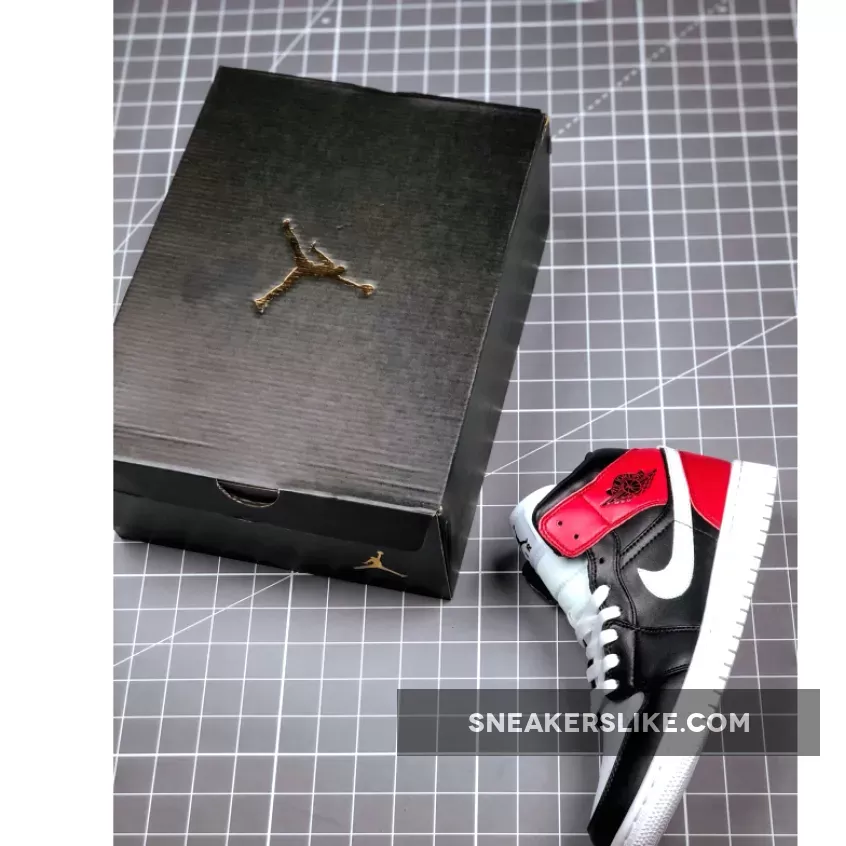 This offering of the mid-top Air Jordan 1 features White leather on the toe and Swoosh with Black leather overlays on the toe, side panels and upper collar. Noble Red is used around the heel completed with a solid White rubber sole.