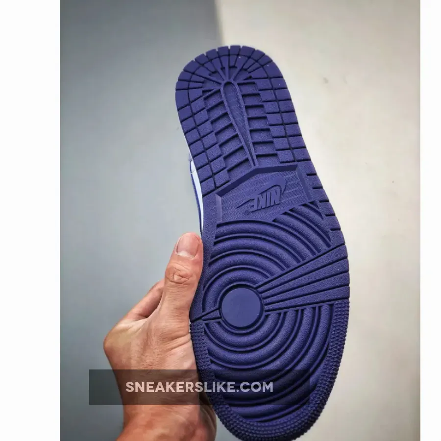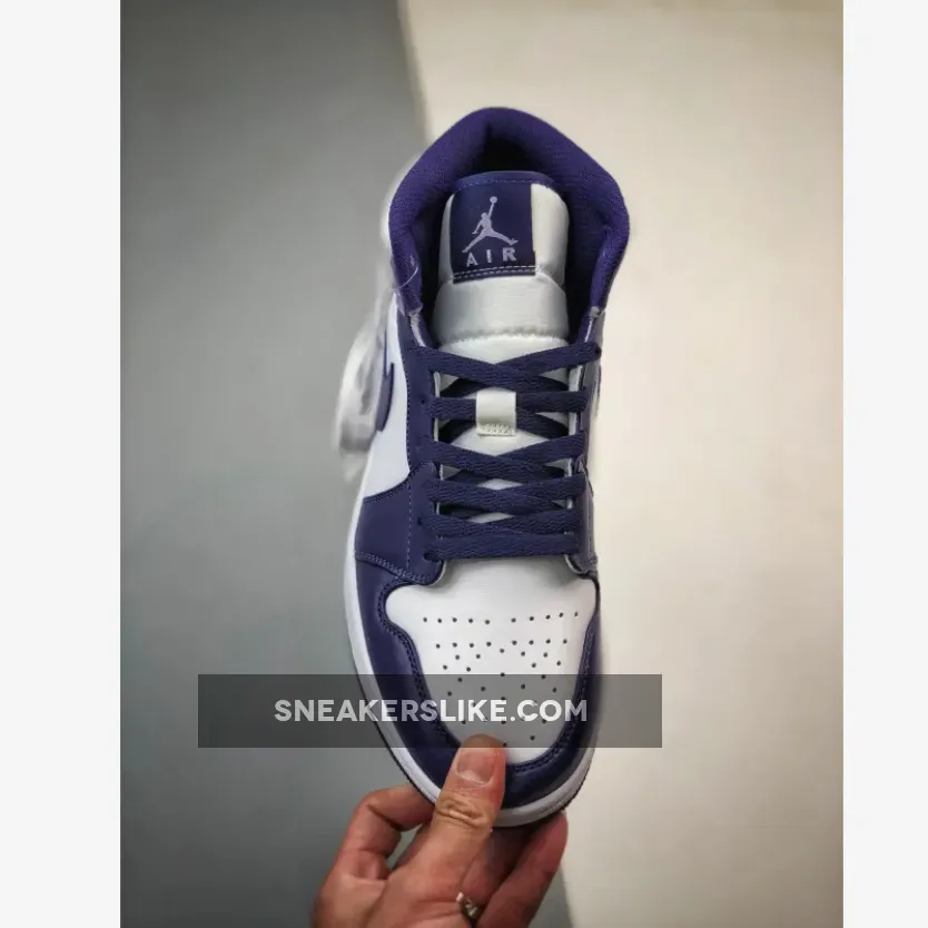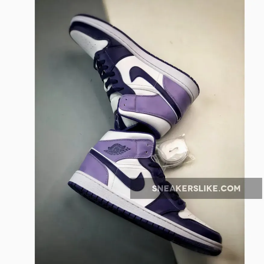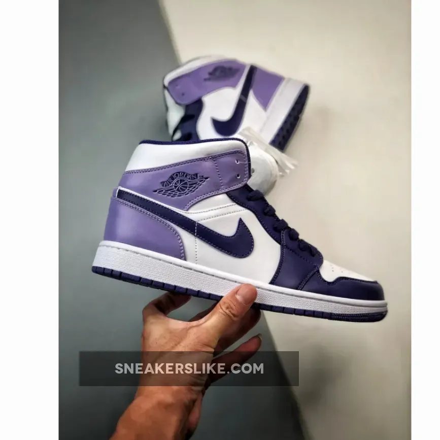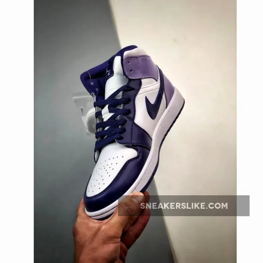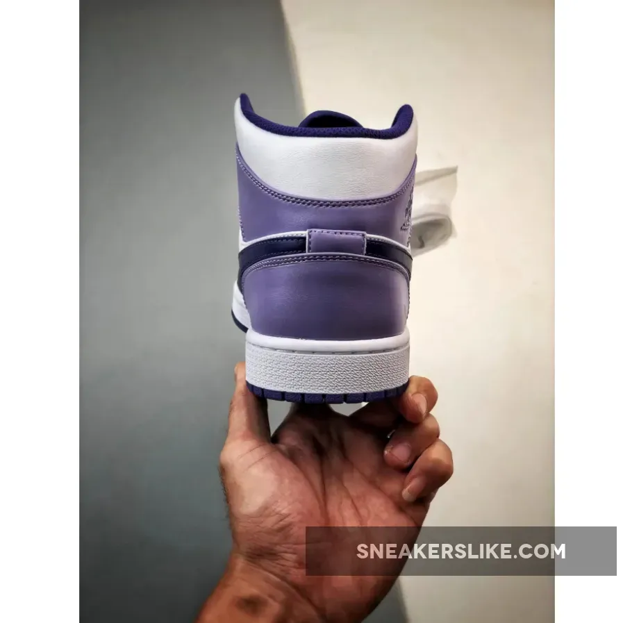 This offering of the Air Jordan 1 Mid features a full leather build on the upper with White serving as the base hue and two different shades of purple seen on the overlays.