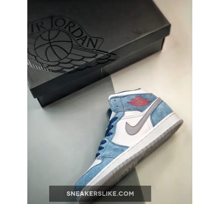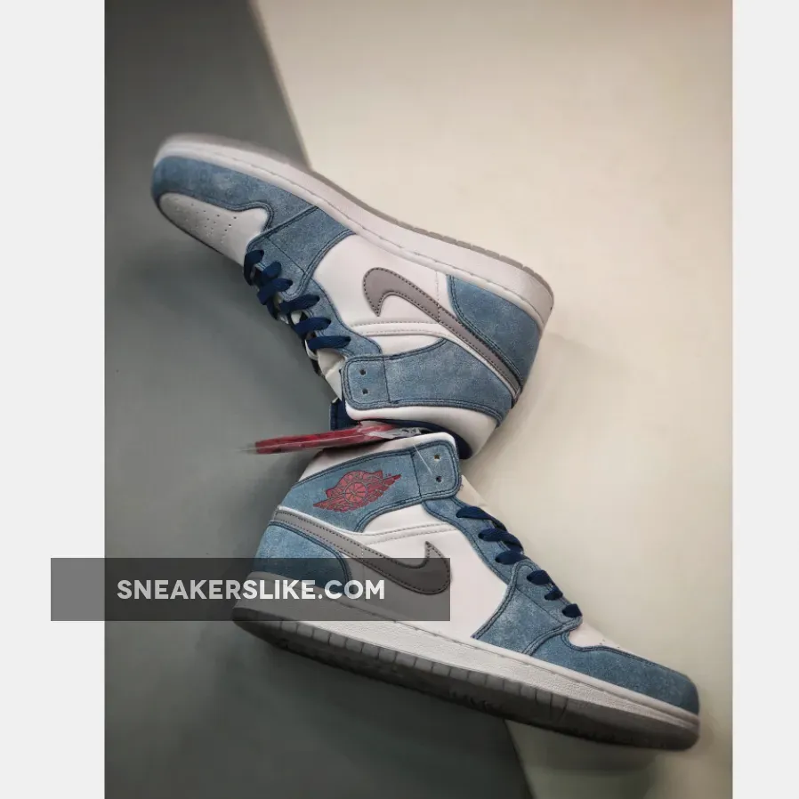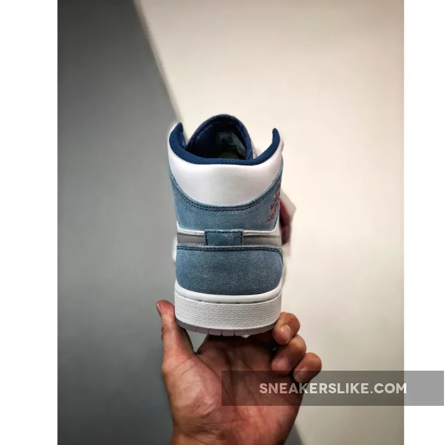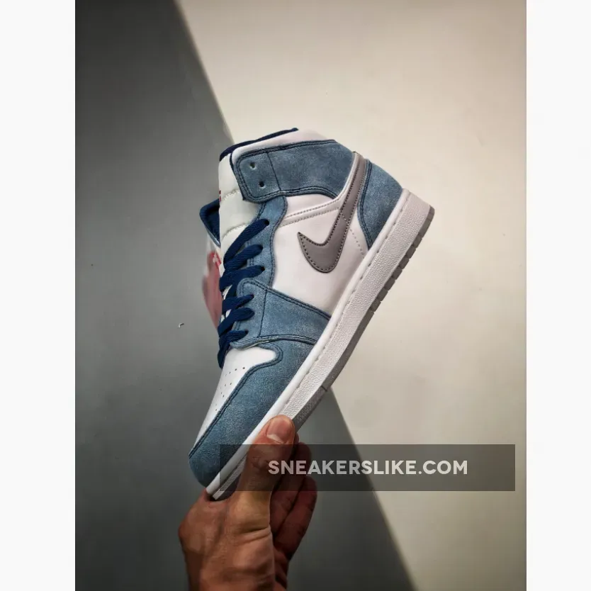 Dressed in a French Blue, Fire Red, White, and Light Steel Grey color scheme. This offering of the mid-top Air Jordan 1 features a White leather base with dusty Blue suede overlays.