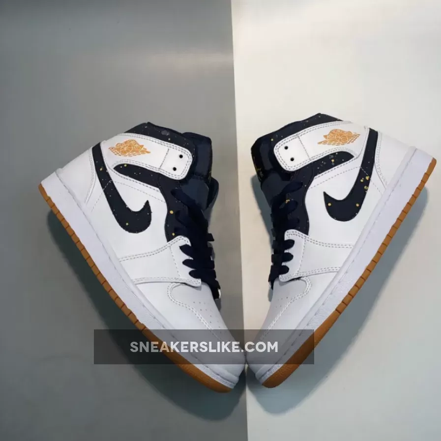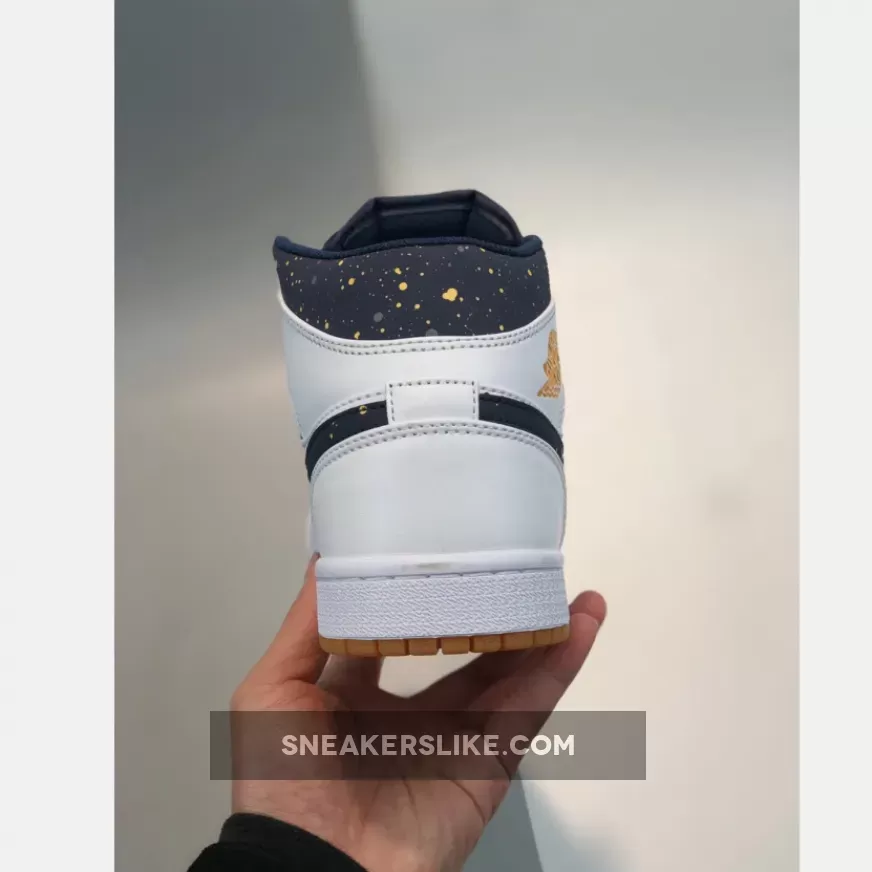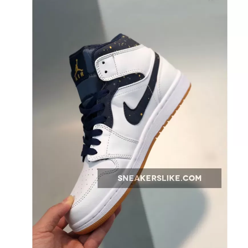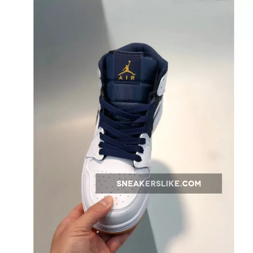 The Air Jordan 1 Mid “Jeter” sports a white leather base that covers the perforated toe, mid-panel, and heel. A speckled navy leather Swoosh branding hit appears on the mid-panel with a navy speckled leather eyelet panel and ankle collar adding to the contrasting. Navy laces, a bronze accented Jumpman logo on the blue tongue tab and bronze Wings logo on the collar complete the upper.