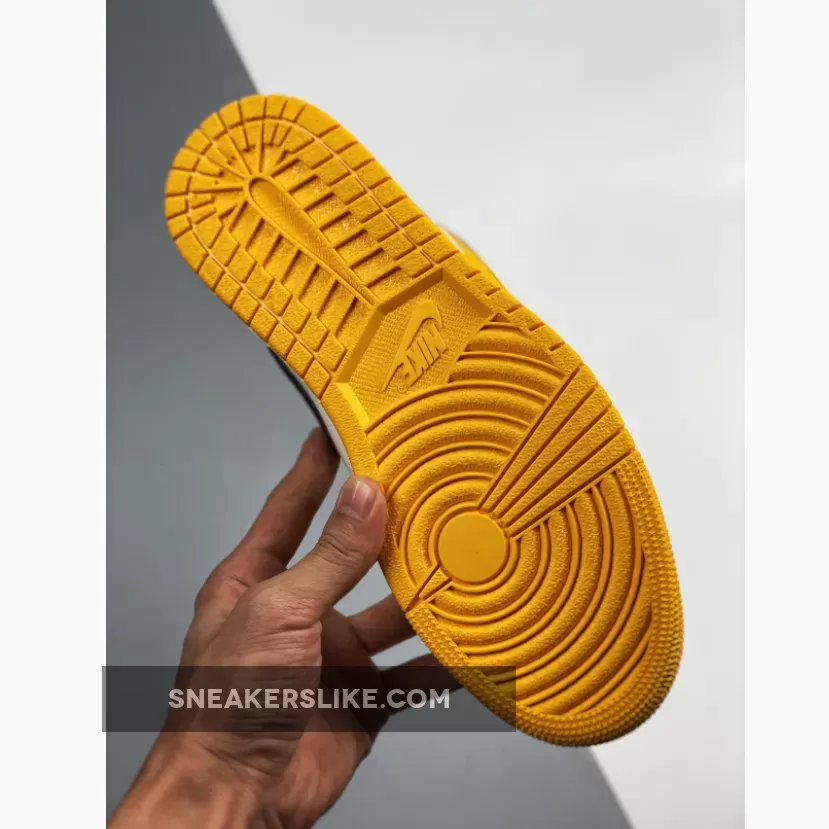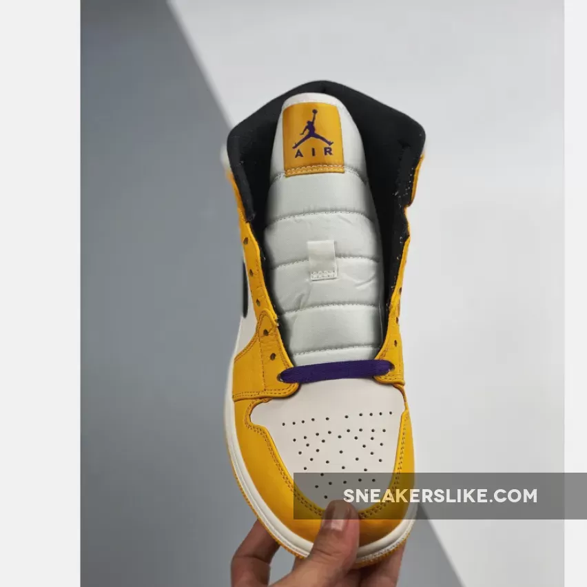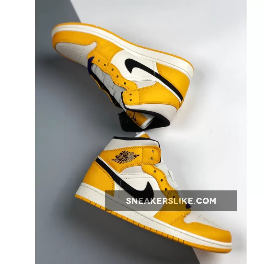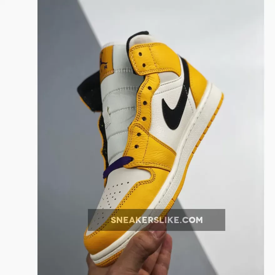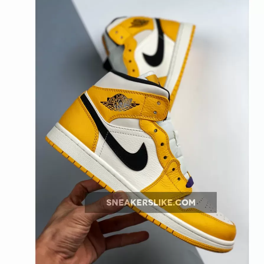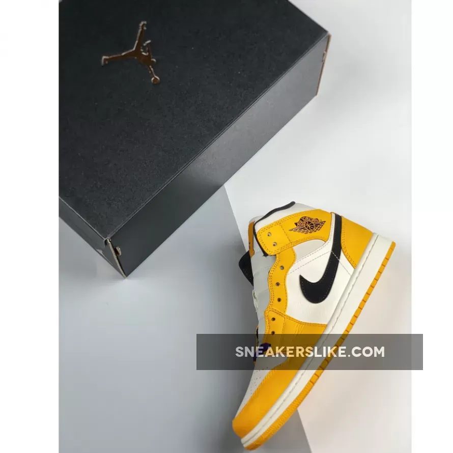 This mid-top iteration of the Air Jordan 1 features a Sail leather underlay with Yellow tumbled leather overlays. Additional details includes a Black Swoosh logo on the sides completed with Purple laces and insoles for that LA Lakers vibe.