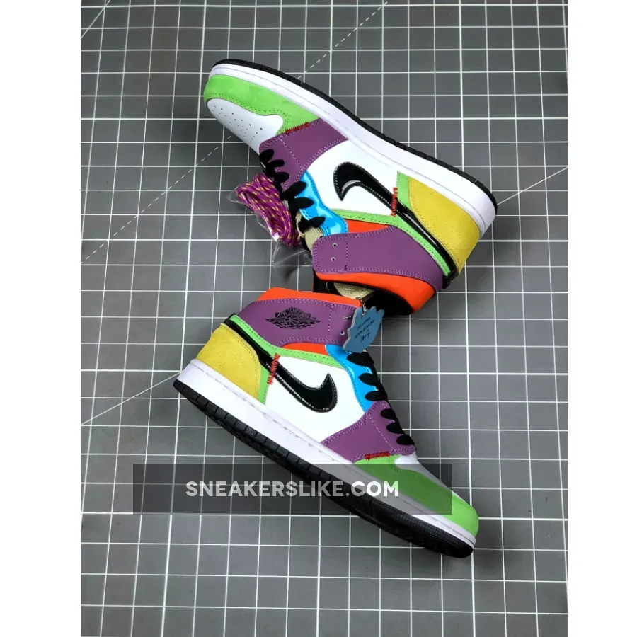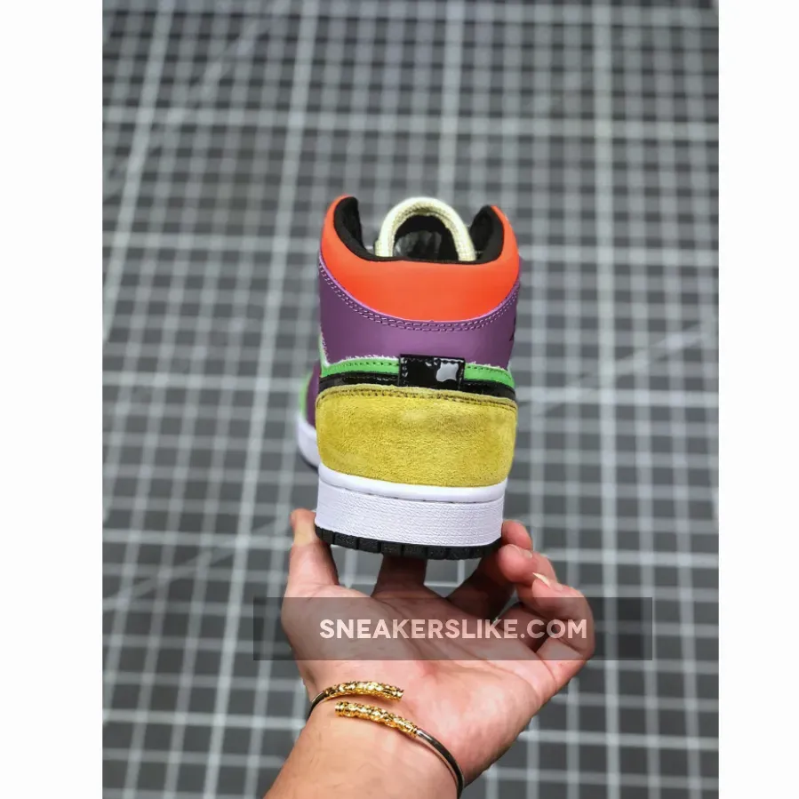 The Jordan 1 Mid SE Multicolor is a brand-new iteration of the classic Nike Air silhouette that has been a huge success since its introduction in 1985 alongside the high and low top versions. The Air Jordan 1 was Michael Jordan’s first ever signature shoe with Nike, and is often regarded as the best shoe of all time. This brand new rendition dresses the AJ1 Mid in a multi-coloured and vibrant look that’s sure to turn a few heads on the street. A combination of construction materials make up the uppers including leather, synthetics and hairy suede. Green, purple, orange, yellow and blue all feature here, with a white base layer housing features such as the black Swoosh that’s stitched onto either side. Classic AJ1 features such as the perforated toe box and wings logo are present as ever, while Jumpman branding is embroidered onto the tongue.