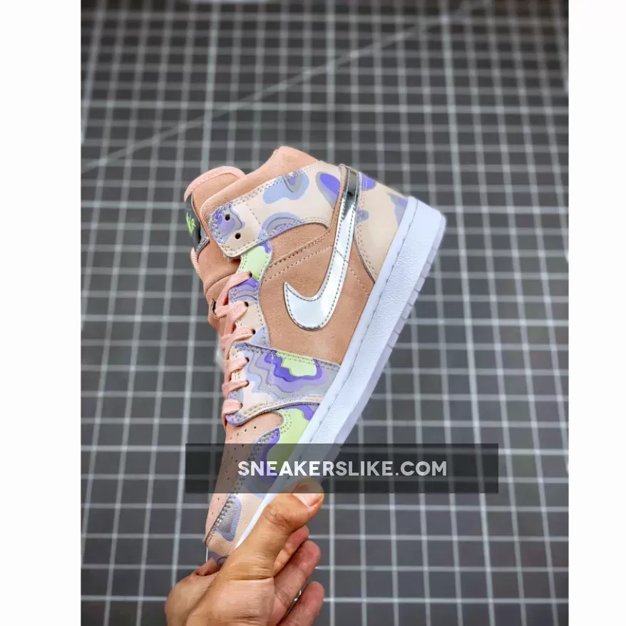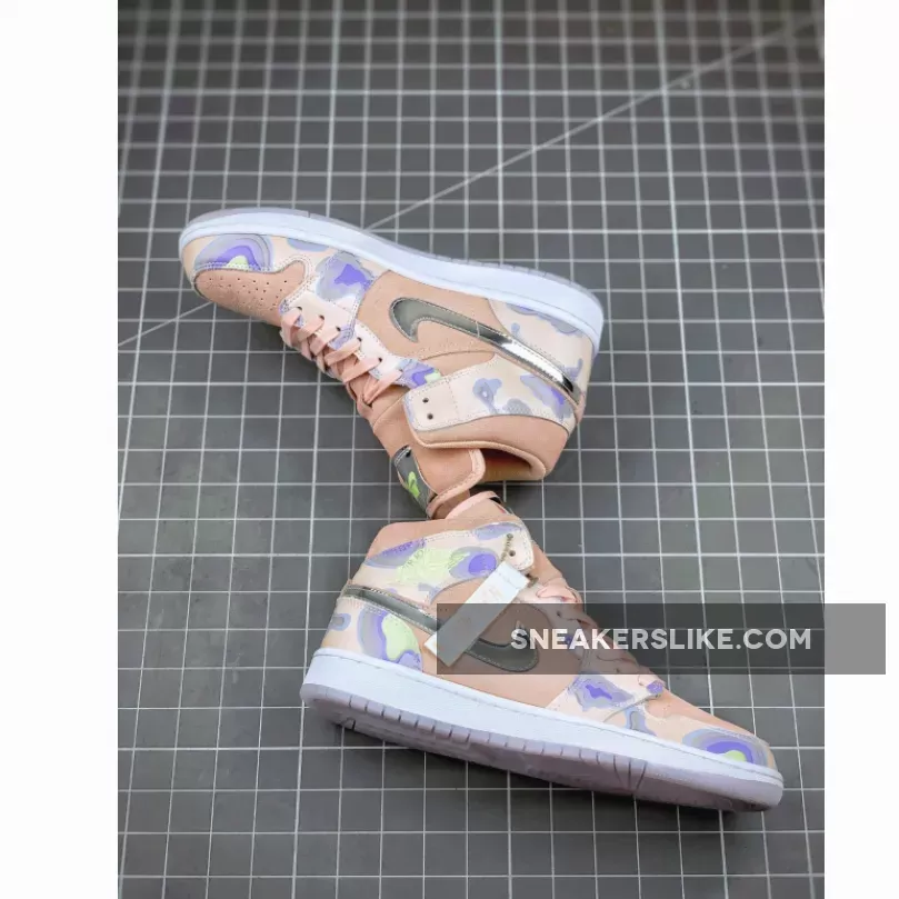 these sneakers are a calling to the clouds as its overlays are treated with cumulus-inspired graphics arranged with accents of pastel volts and purples. Underneath, its suede-constructed base paneling and tongues are dyed identically to a peachy tone, while its Swooshes alternate between metallic silver appearances on the lateral side, and angelic finishes on the medial.