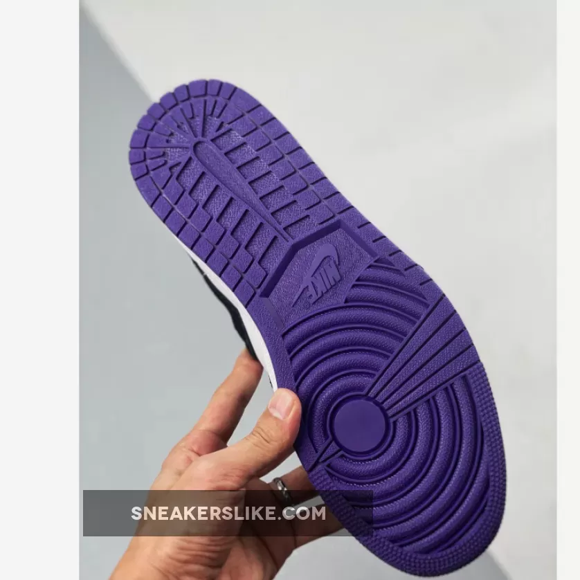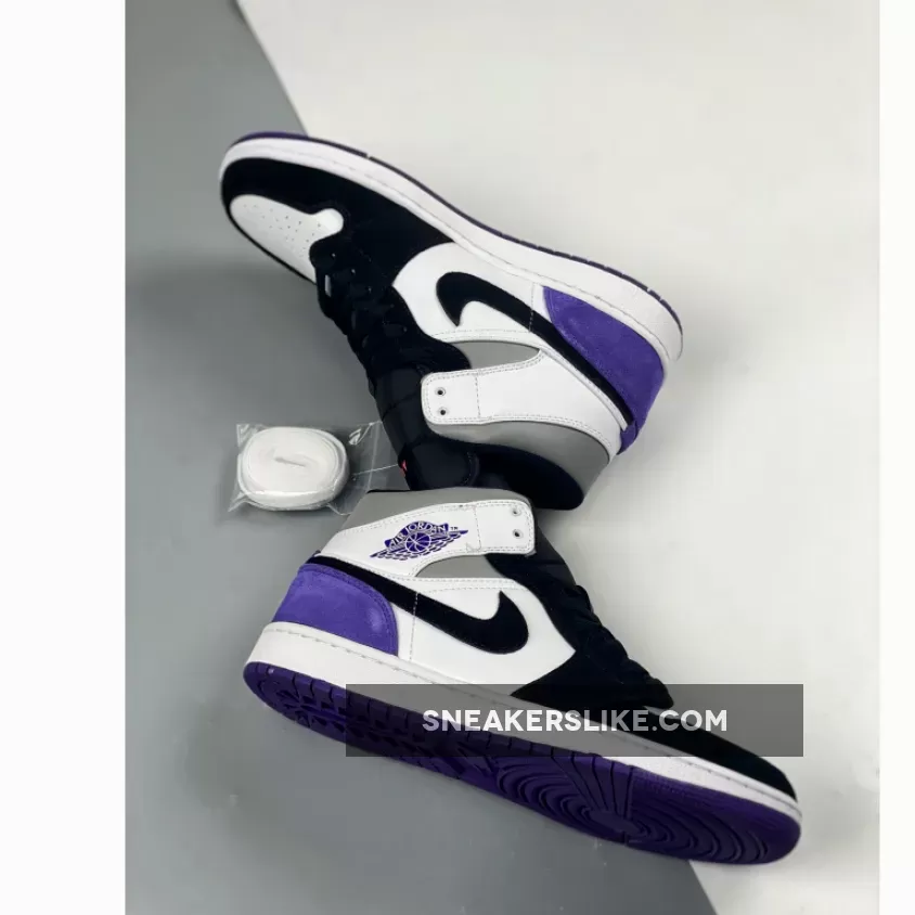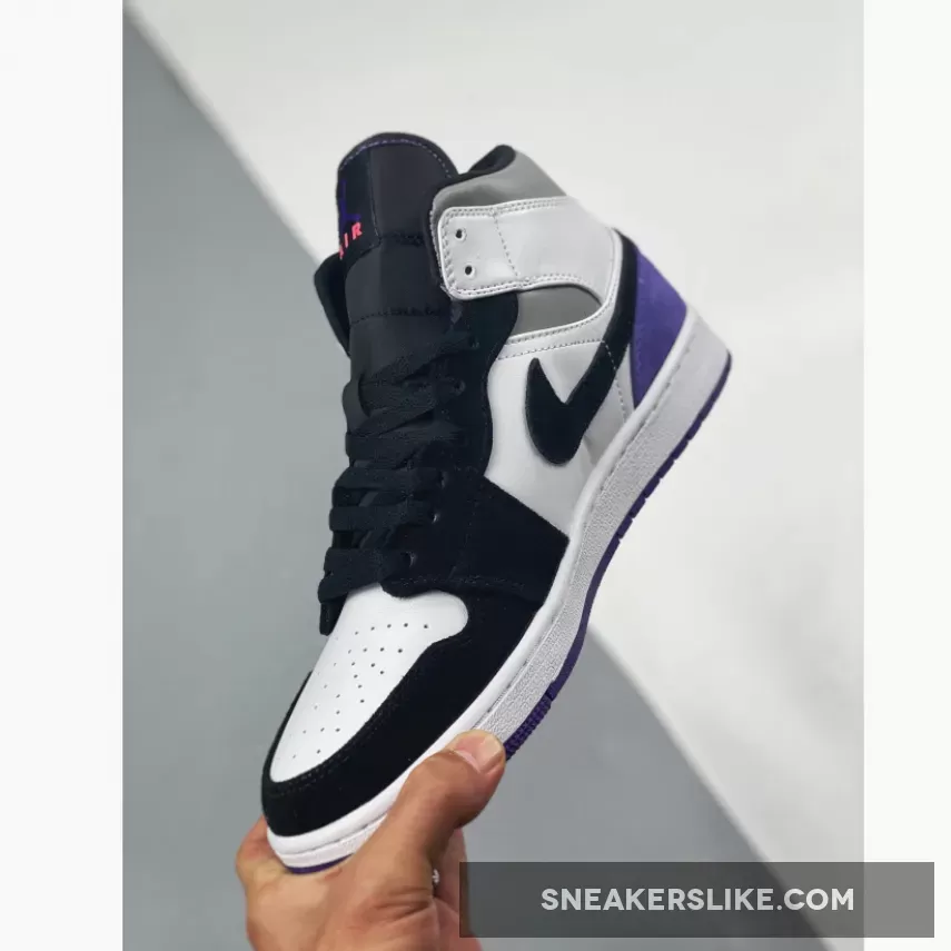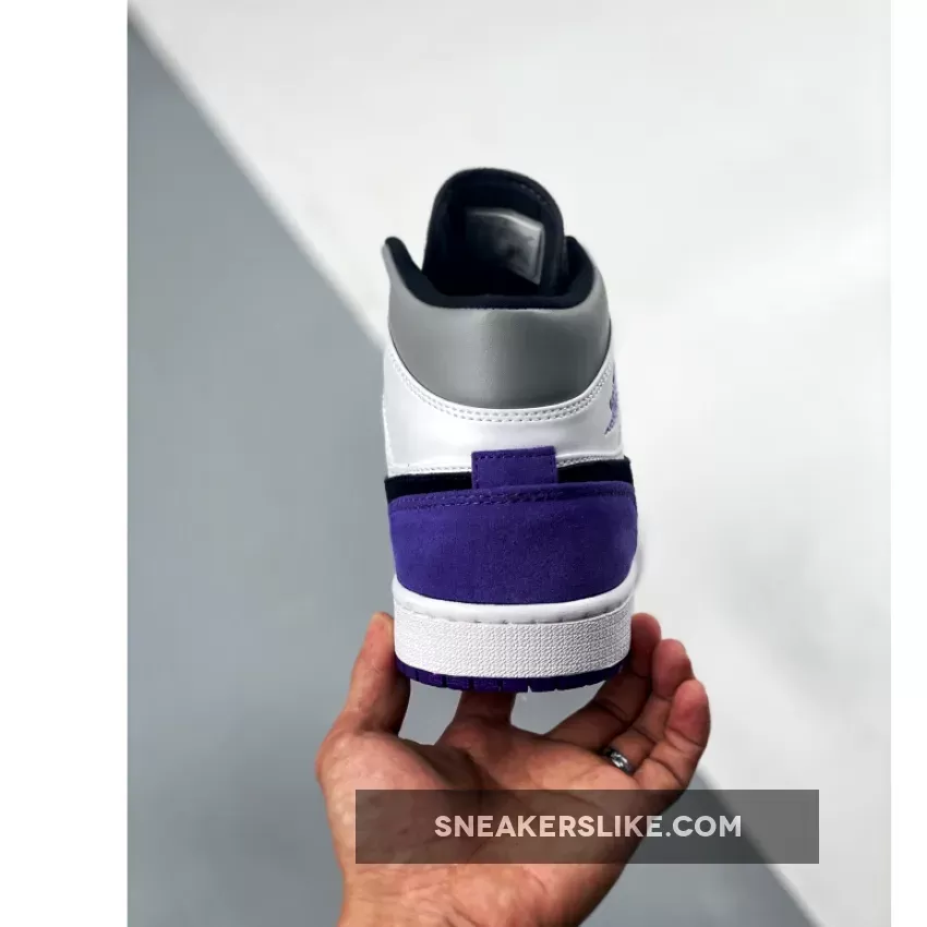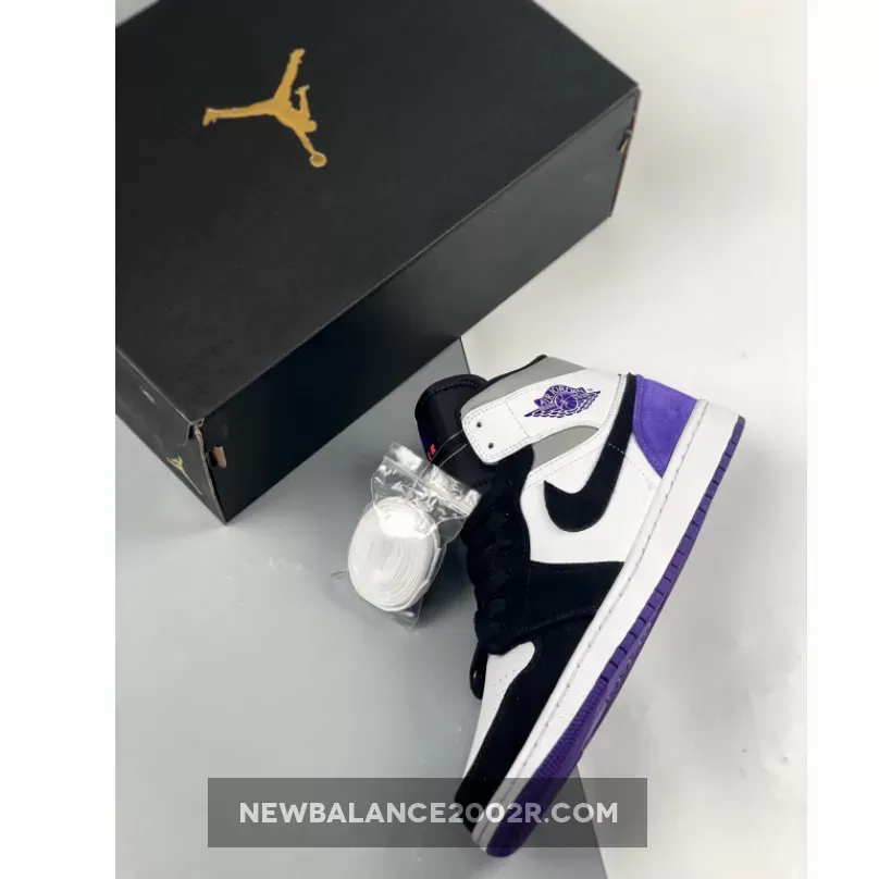 This offering of the mid-top Air Jordan 1 features a White leather base with Grey leather around the collar. Black suede overlays upfront, eyestay and Swoosh logos paired with Purple suede heels.