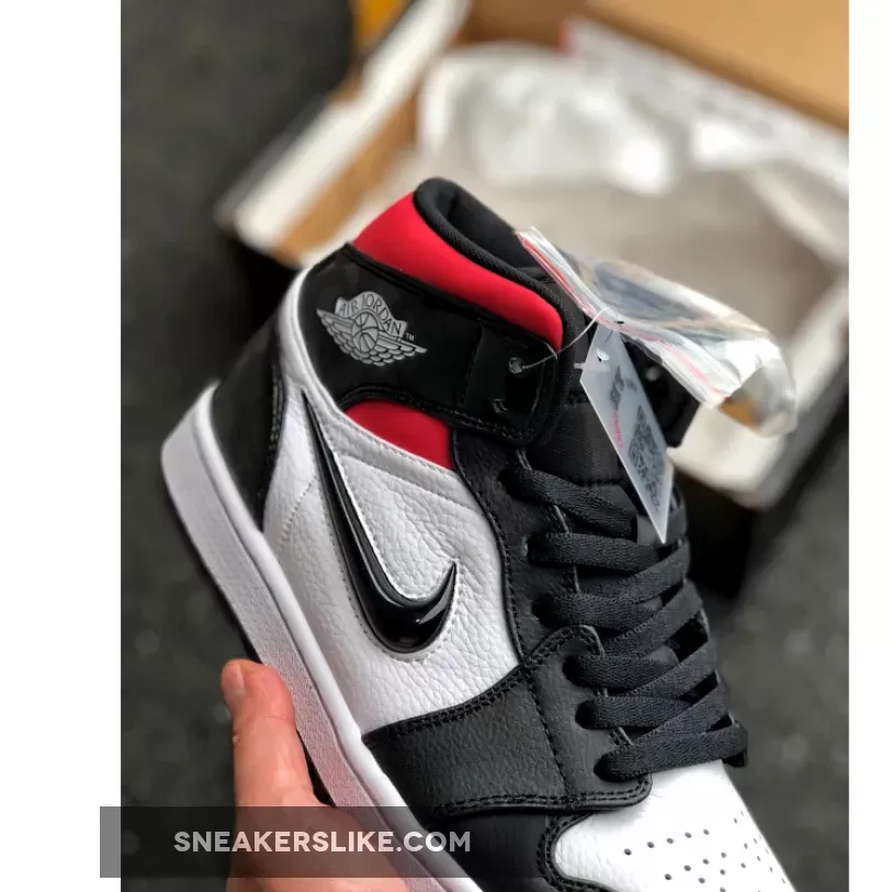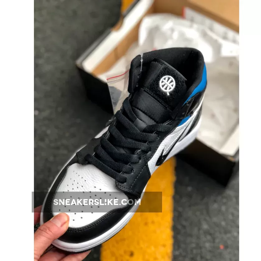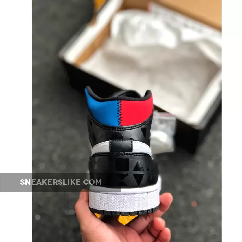 This offering of the mid-top Air Jordan 1 features a White leather upper with Black leather overlays. Other details includes a White Wings logo with a the Quai 54 basketball logo embroidered on the tongues, along with a jewel-like Swoosh logo on the sides. A glossy triangular pattern is displayed on the heel counter, while having Yellow/Green around the upper collar of the left shoe, and Blue/Red on the right shoe. Finishing off the design is the themes colorful shape pattern on the insoles.