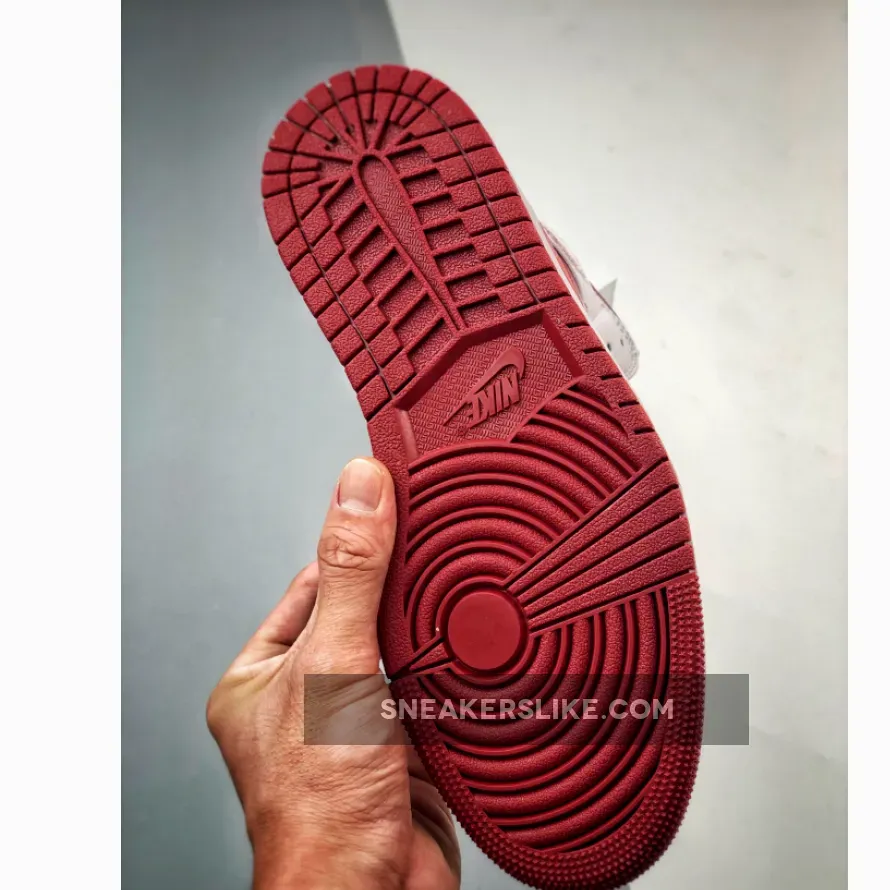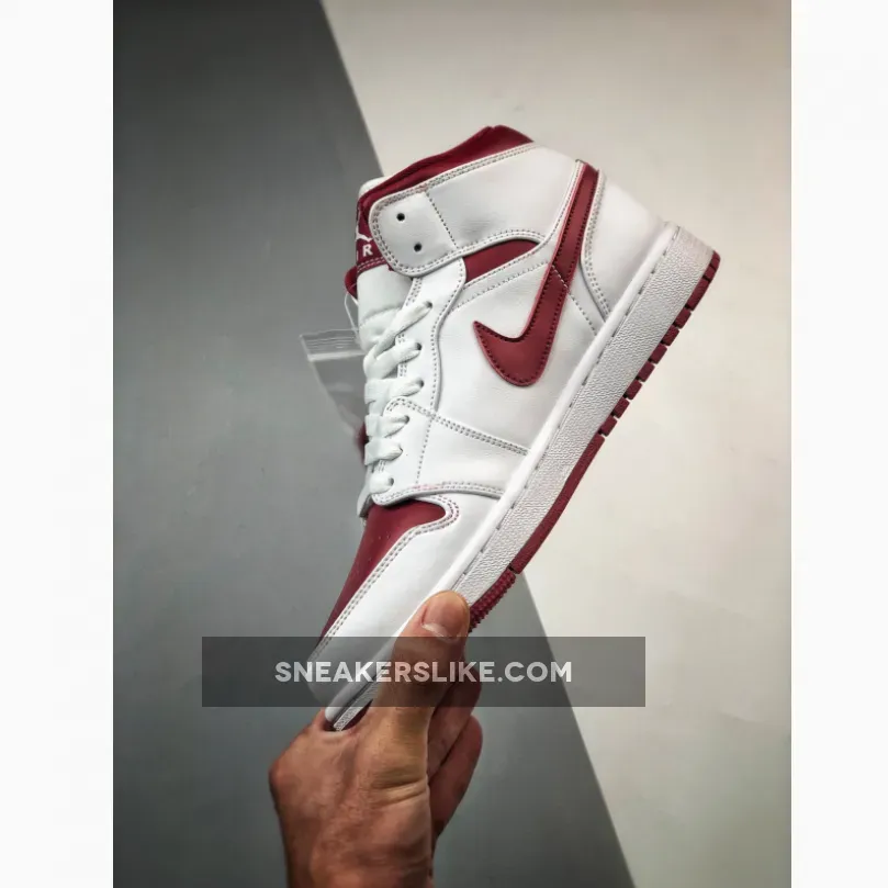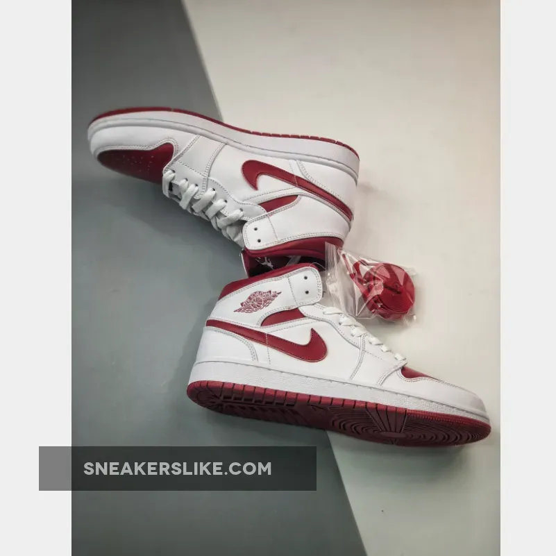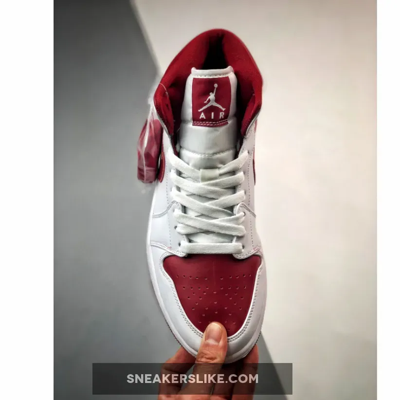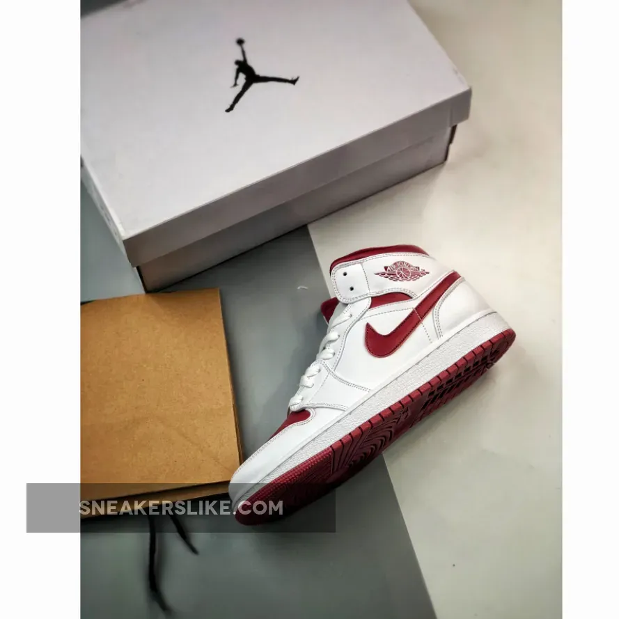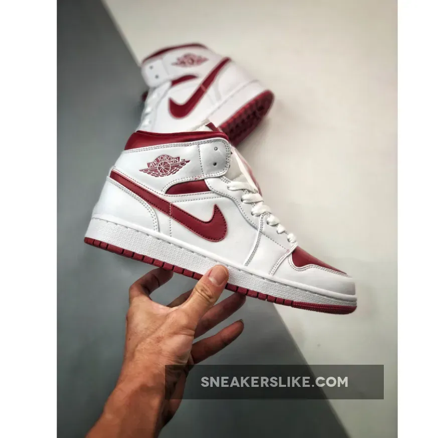This offering of the mid-top Air Jordan 1 comes constructed in a leather build featuring Red leather on the toe box, ankle collar, and Swooshes with White overlays.