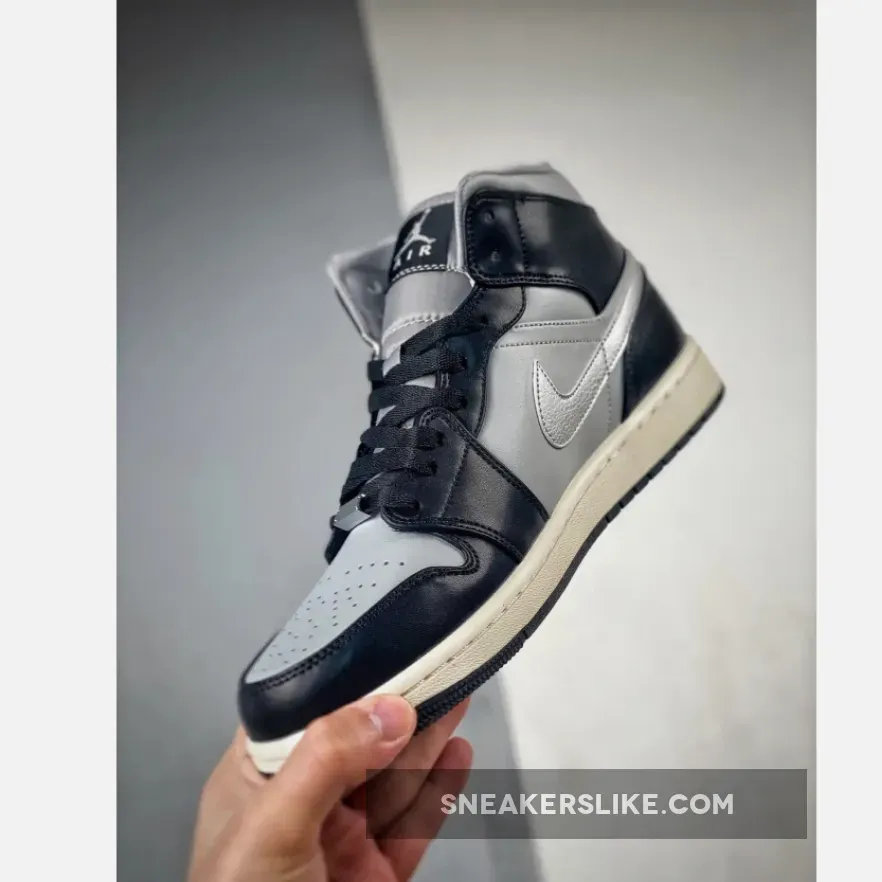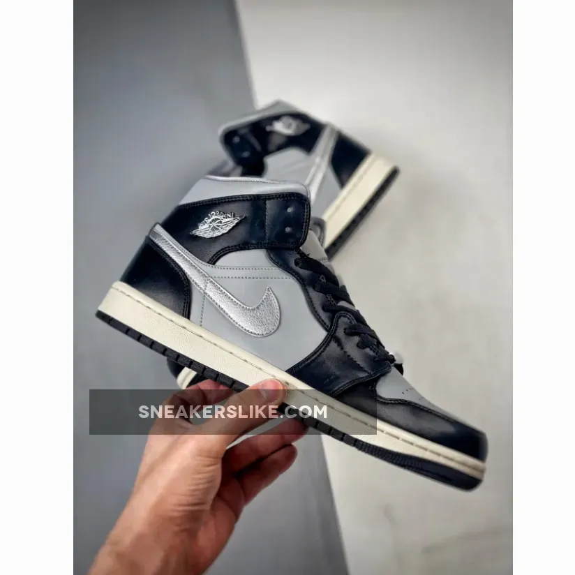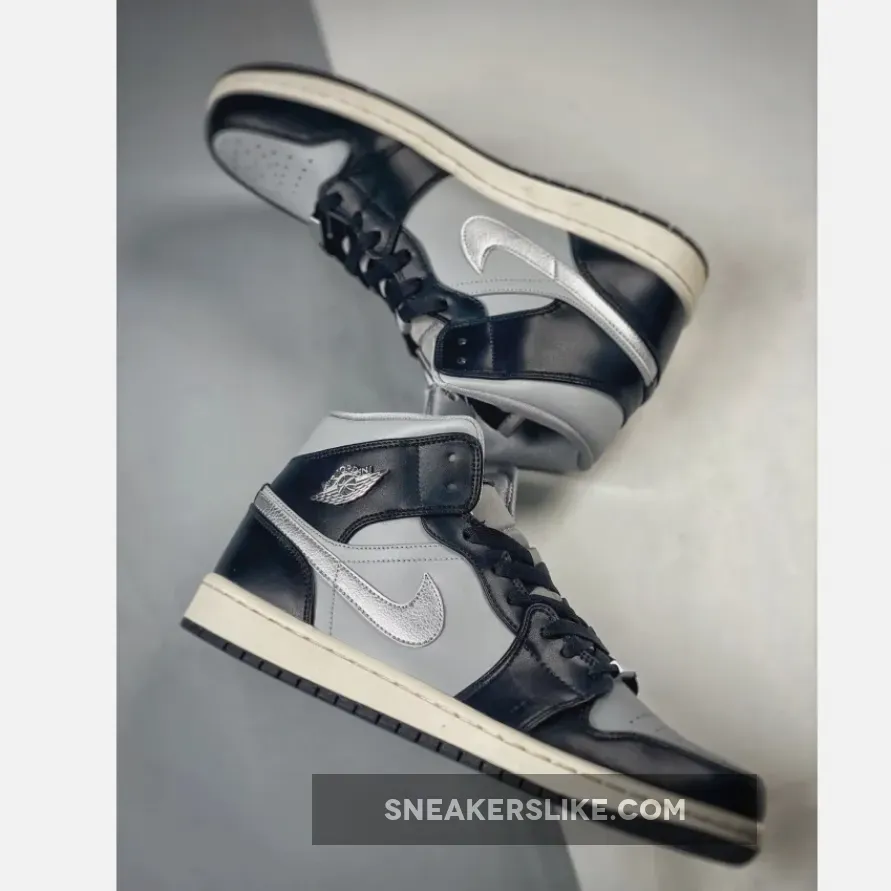 The shoe showcases a sleek ensemble of colors, including Black, Metallic Silver, Light Smoke Grey, and Sail. Crafted with luxe full-grain leathers and mesh lining, the AJ1 Mid SE “Black Chrome” provides both comfort and durability. The Light Smoke Grey leather upper creates a stylish tonal backdrop, while the striking Black leather overlays add glossy contrast with a patina-like finish. Notable additions include the Chrome Wings on the lateral ankle and lace dubrae, adding a touch of hardware-inspired flair. The vintage charm is further enhanced by the Sail midsole, complemented by a Black rubber outsole that completes the design.