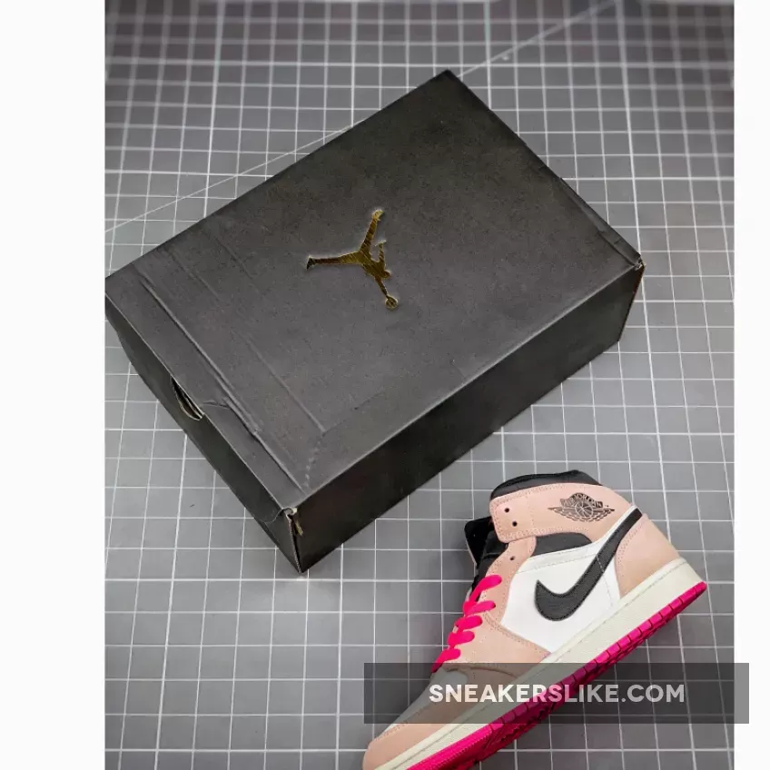 This mid-top Air Jordan 1 features a White leather upper with Pink suede overlays and Black nylon on the Swoosh logo and collar.