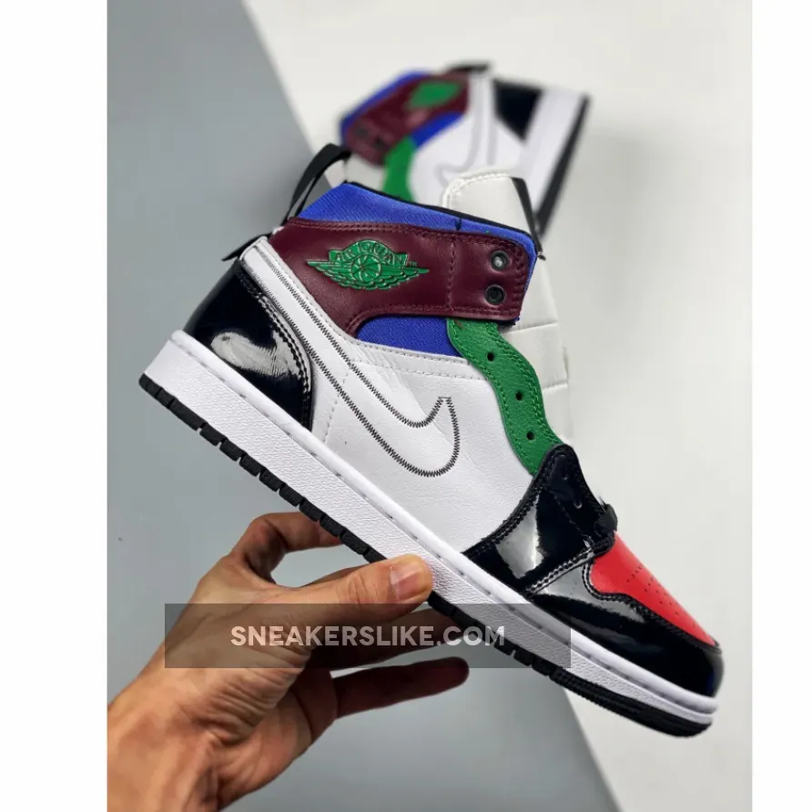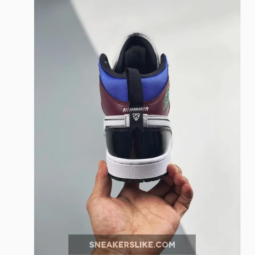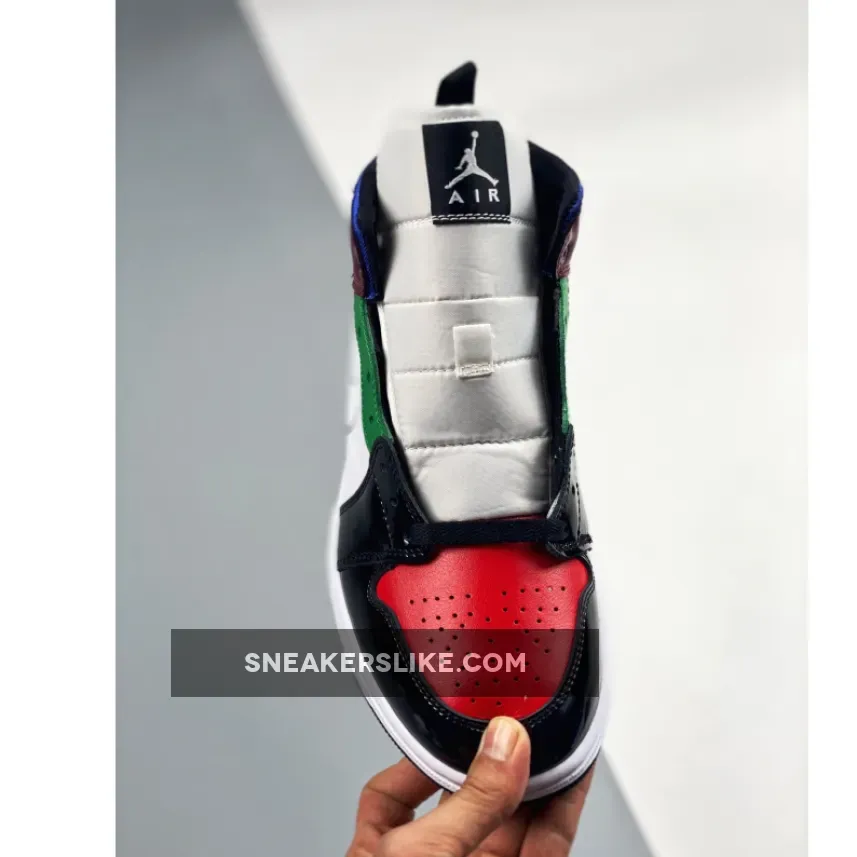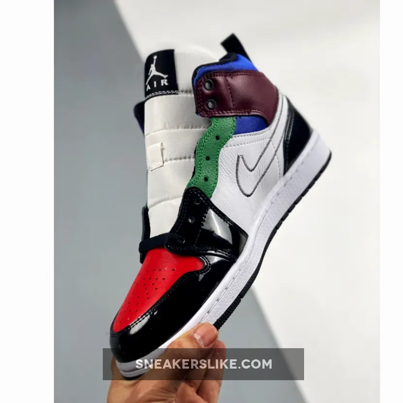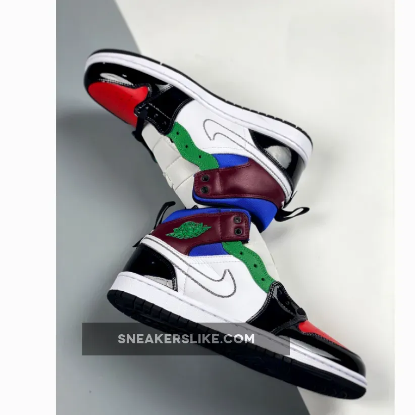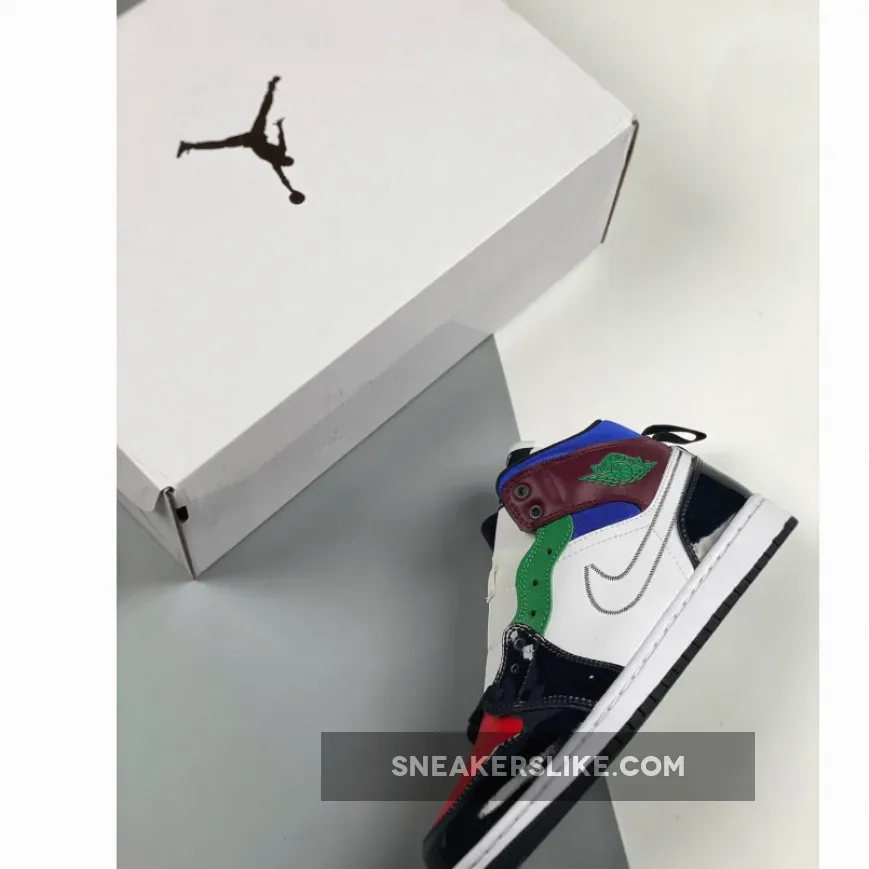 This mid-top Air Jordan 1 comes constructed in a mix of leather and patent leather with mesh material used on the collar.