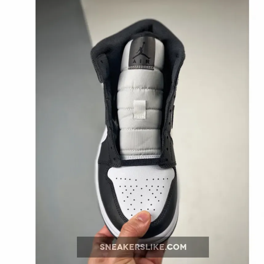 This special edition, mid-top AJ1 pays homage to the iconic Nike Dunk Low “Panda”, featuring a two-tone black and white colour palette. Black leather overlays on the mudguard, eye stay panel and heel panel are complemented by a white leather toe box and mid-panels. A white nylon tongue, on the other hand, contrasts with the black laces.