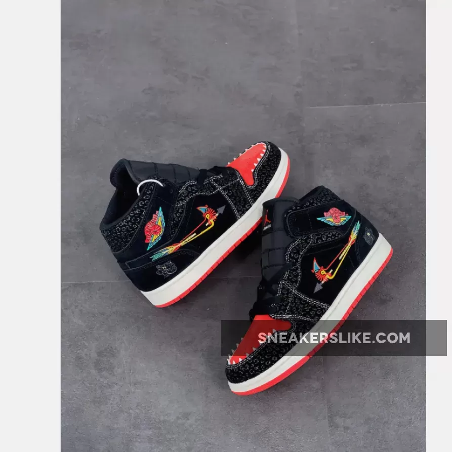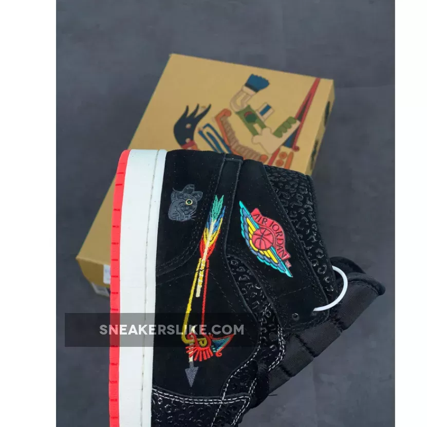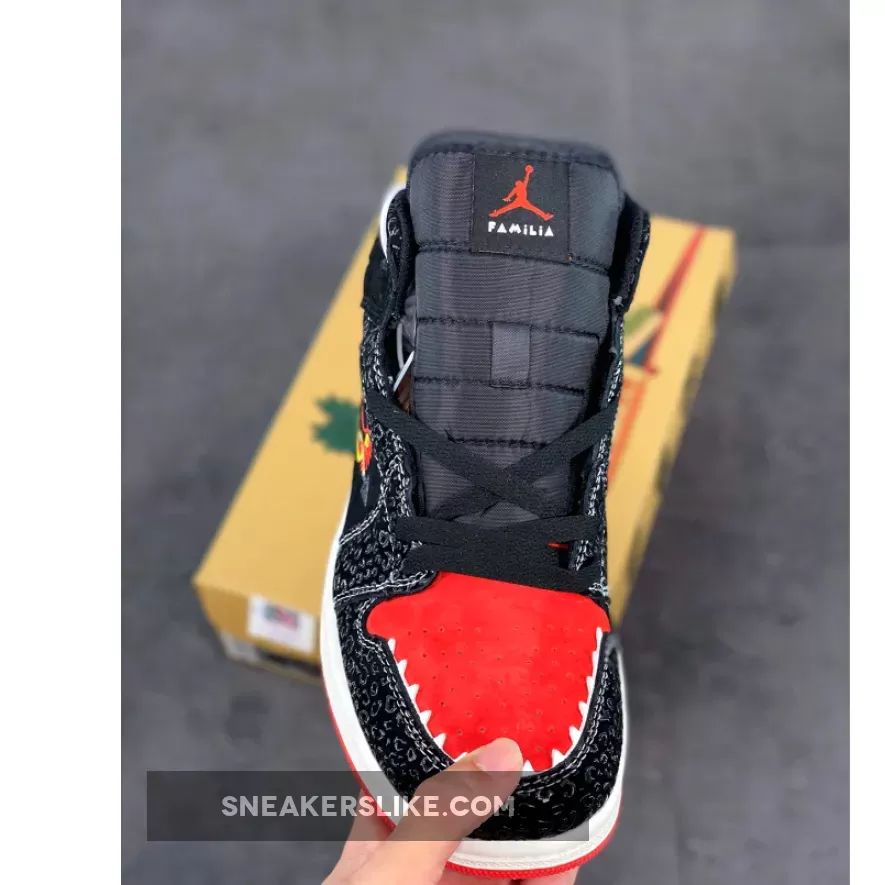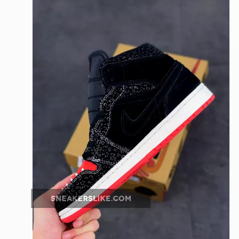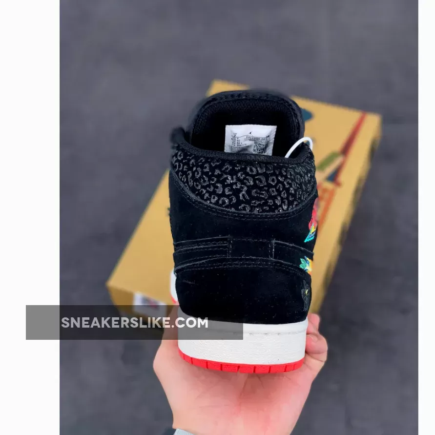 Drawing inspiration from Mexicos Día de los Muertos, also known as Day of the Dead, the Jordan 1 Mid Siempre Familia features a black and red suede upper with spirit related graphic embroidery prominent on the Swooshes and heel wraps. From there, glazed embossed cheetah print patterns cover the overlays. At the base, a Sail and red sole completes the design.