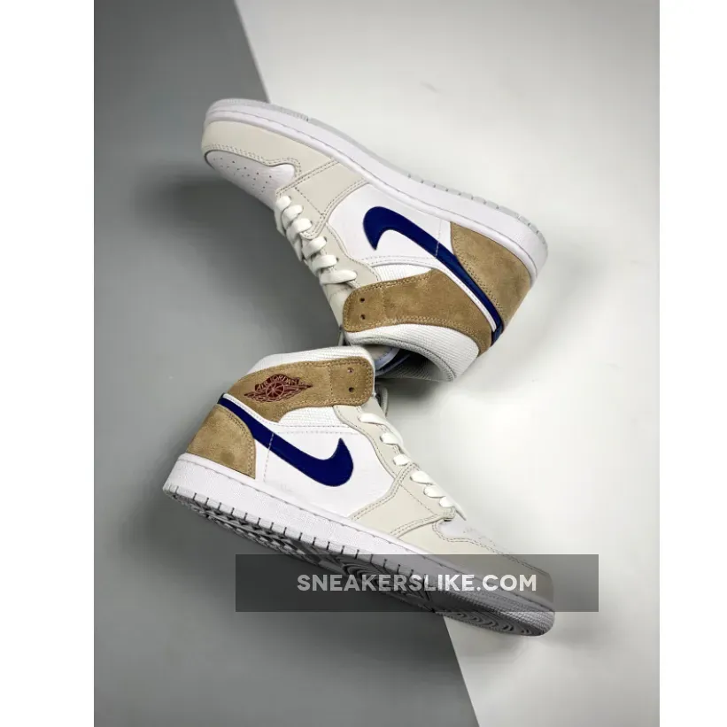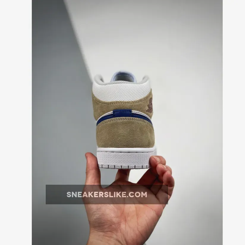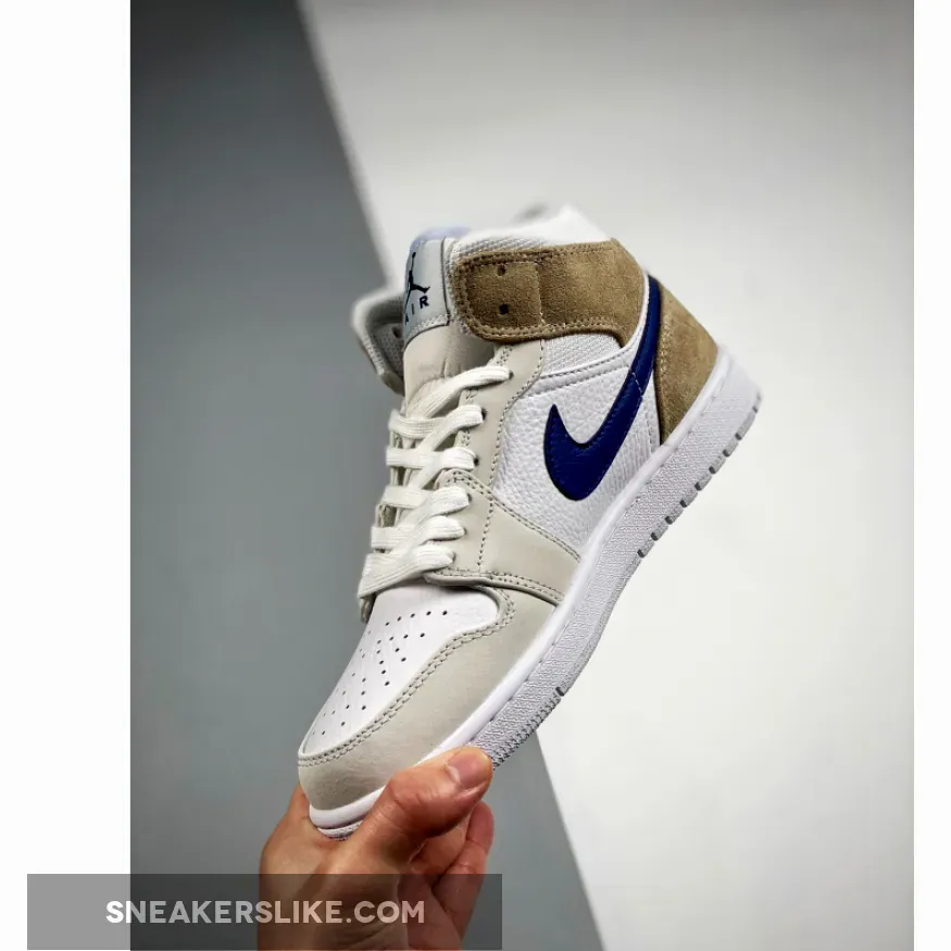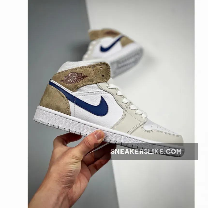 The latest Air Jordan 1 Mid Tan Suede is a neutral and smart pair, with a mostly white and light grey base upper. It contrasts very nicely with a navy-blue leather Swoosh across its quarter and backstay, and a warm tan suede for its ankle and bottom heel overlays.