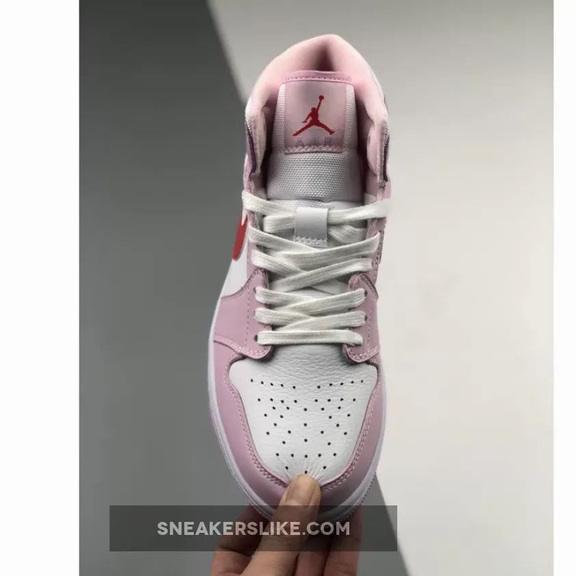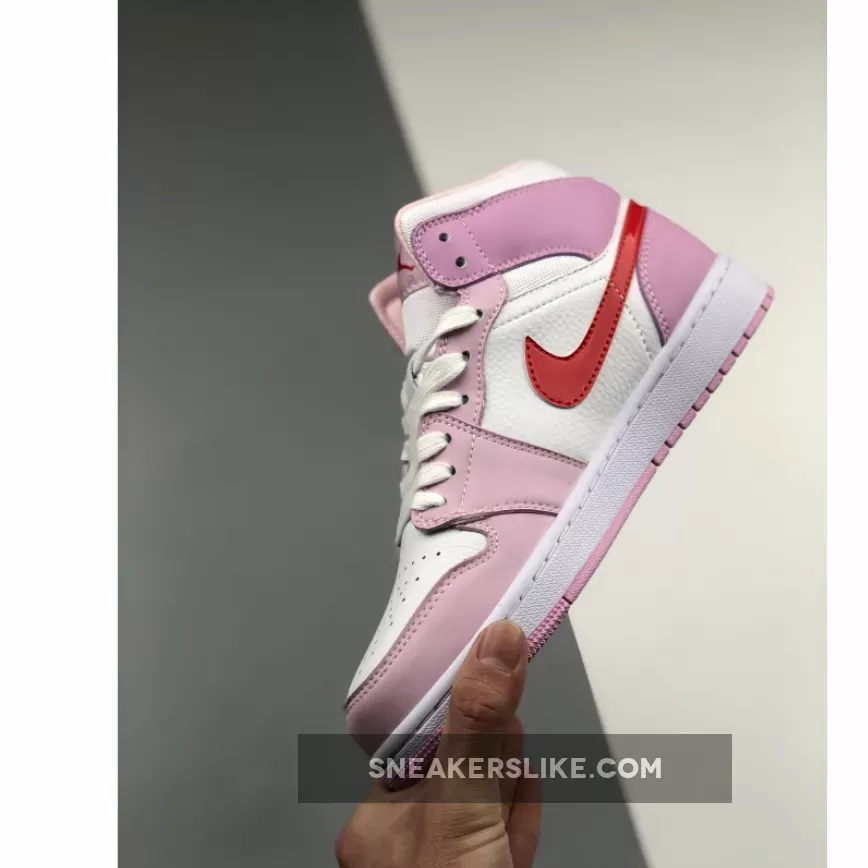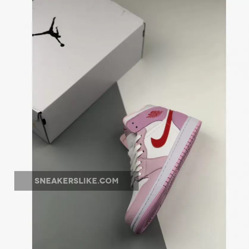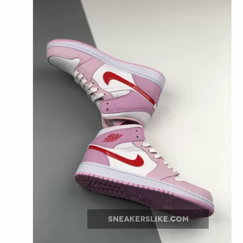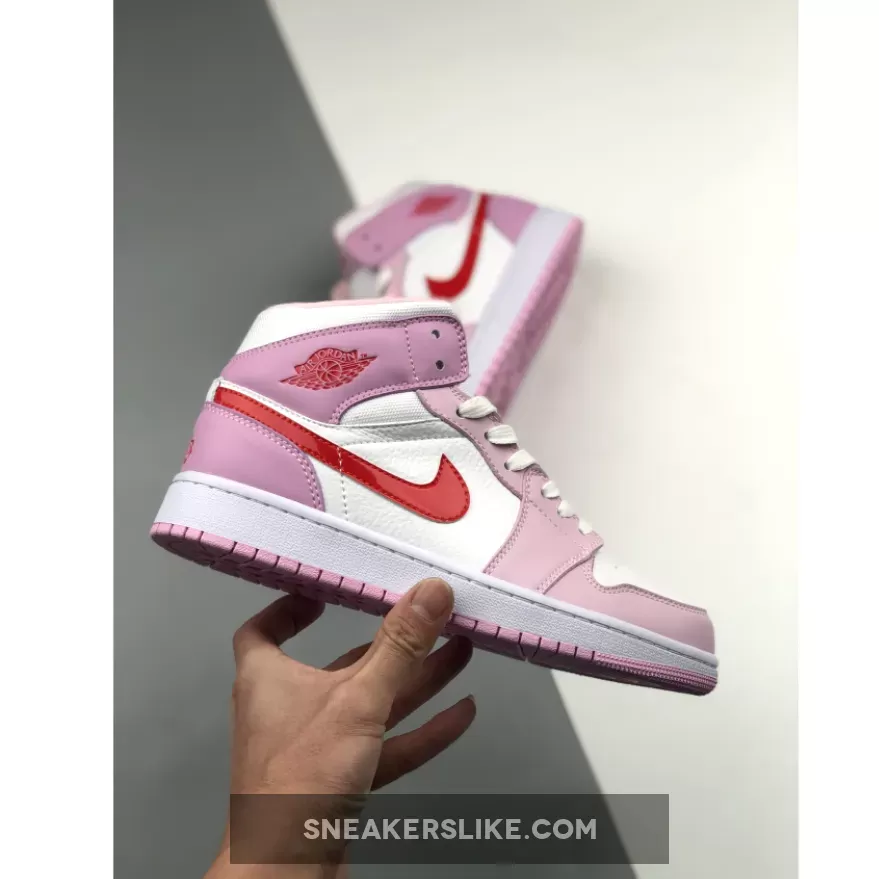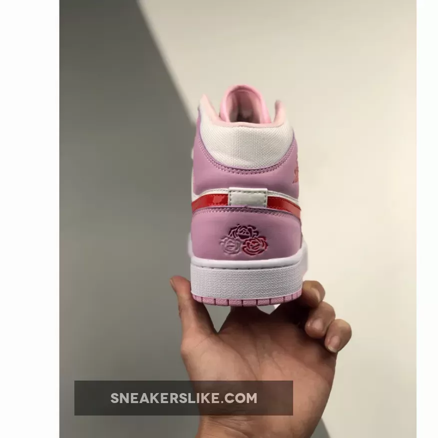 Love is in the air for the Air Jordan 1 Mid. Meet its latest iteration, the Air Jordan 1 Mid Valentine’s Day.This AJ1 has a tumbled leather base in white, matching the mesh tongue and collar. The overlays on the toe cap, the mudguard and the eyestay panel are all smooth leather in a pale lavender. The overlays on the foxing are also smooth leather but in a darker lilac shade. The Nike signature Swooshes on both the medial and lateral sides are in hot pink like the embossed Wings logo on the collar flap. A bouquet of three roses are embossed on the heel in hot pink, dark lilac and white.