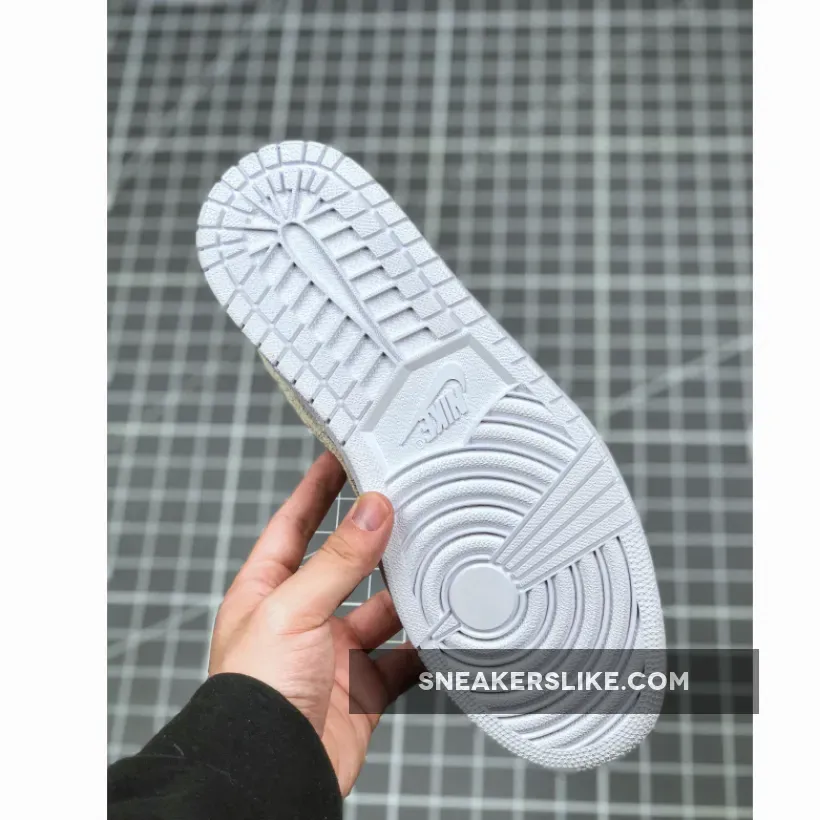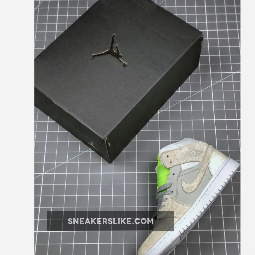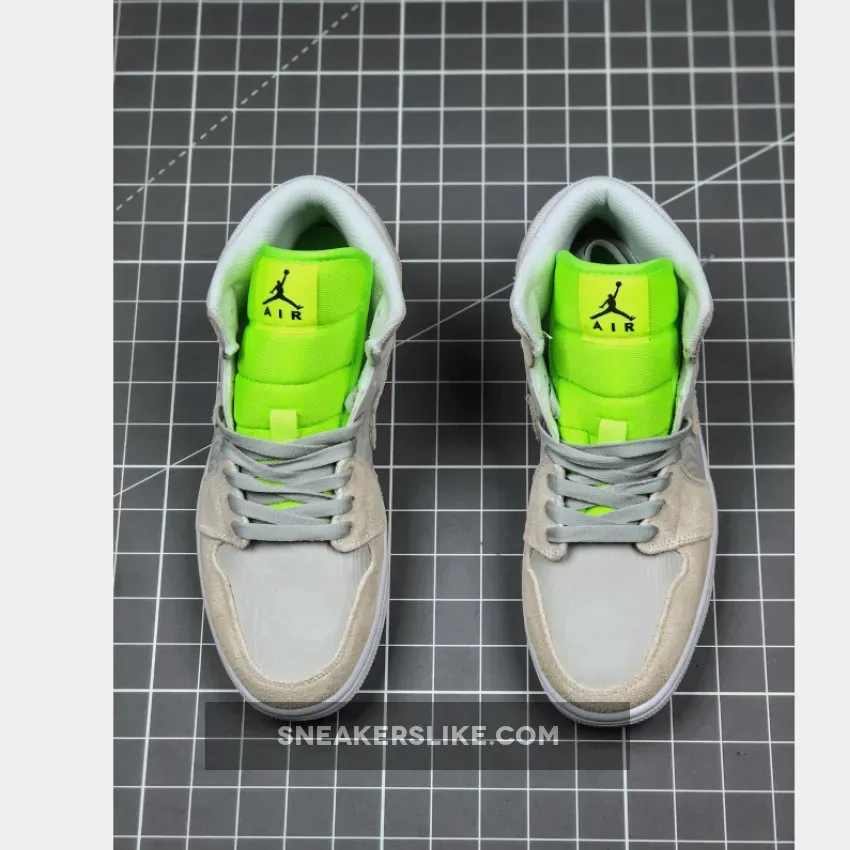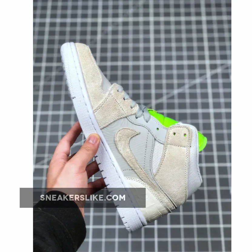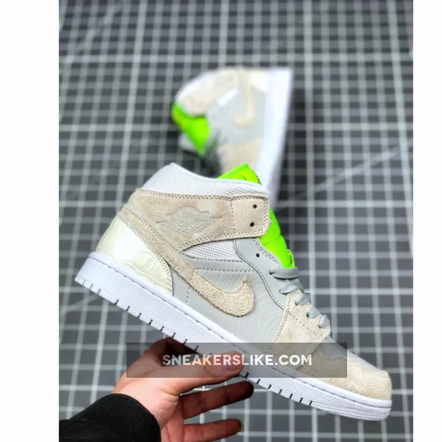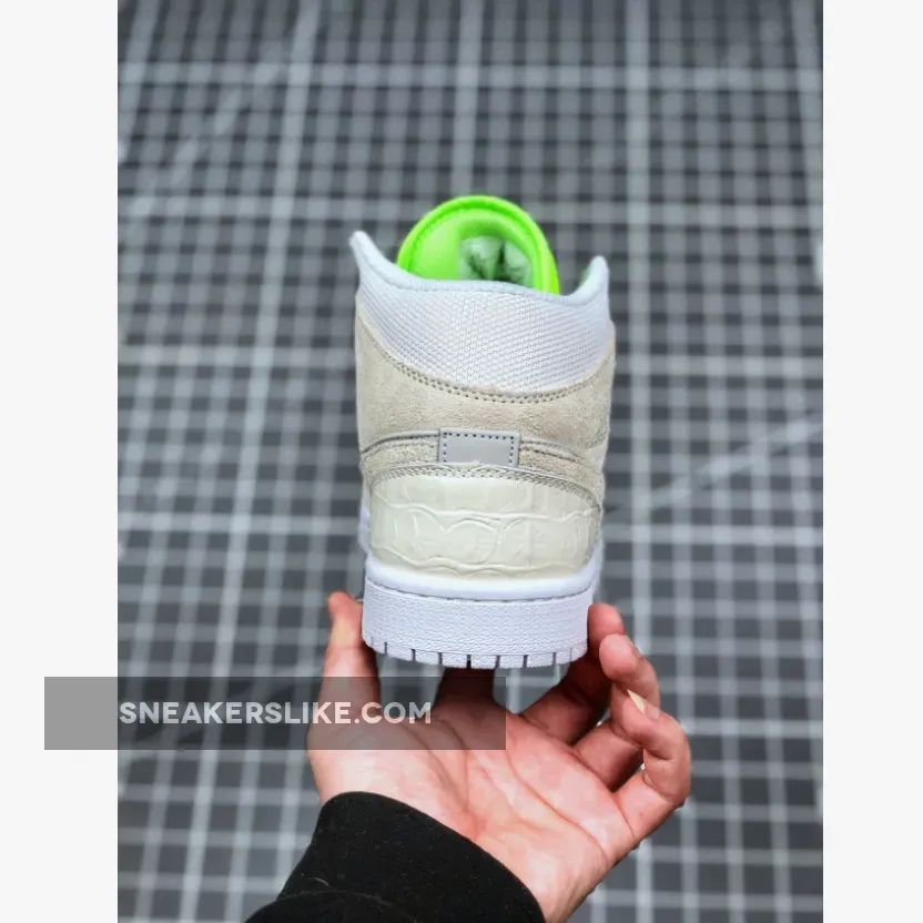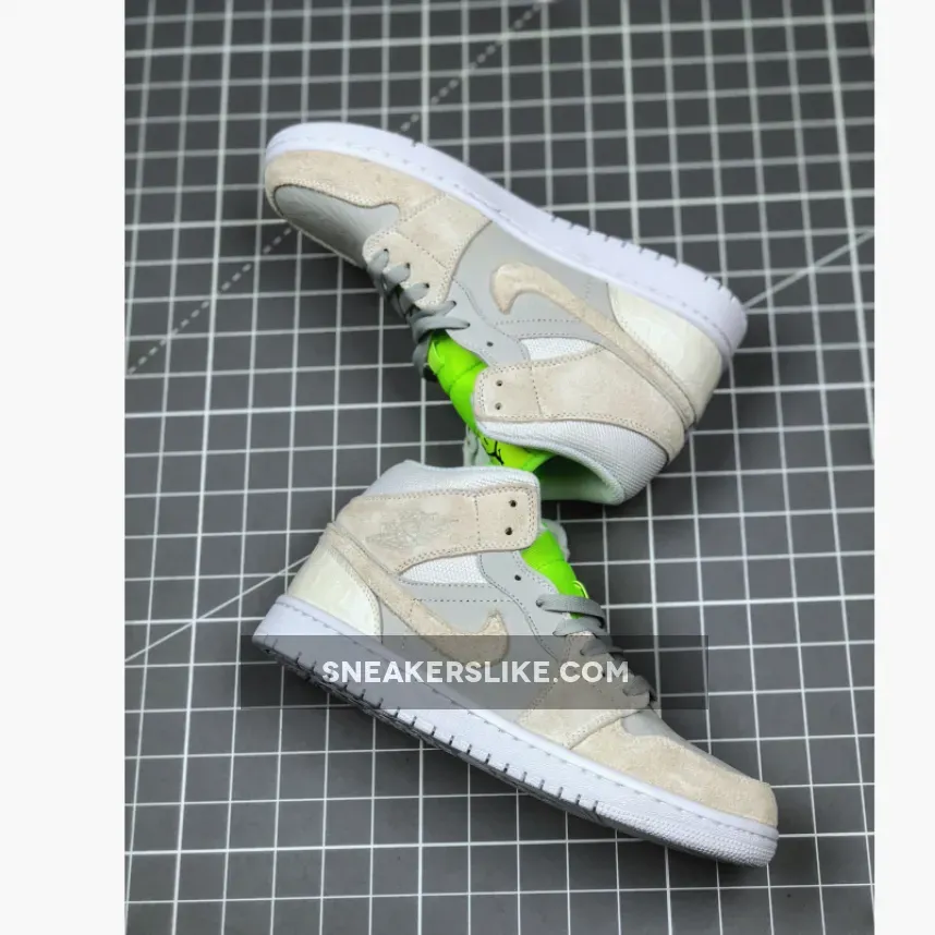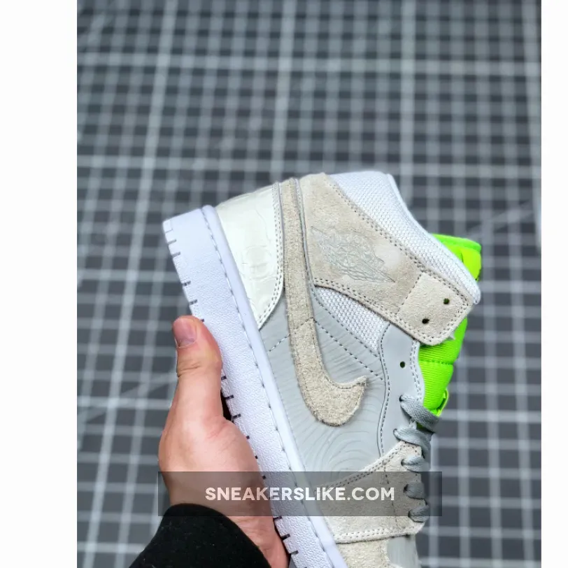 Dressed in a Vast Grey, Ghost Green, and White color scheme. This mid-top Air Jordan 1 features a mix of premium materials including mesh, suede, smooth leather and faux croc all done in its Grey hue. 3M reflective detailing covers the woodgrain-like finish on the side panels and toe, while having a vibrant Green tongue completed with velcro tongue tags.