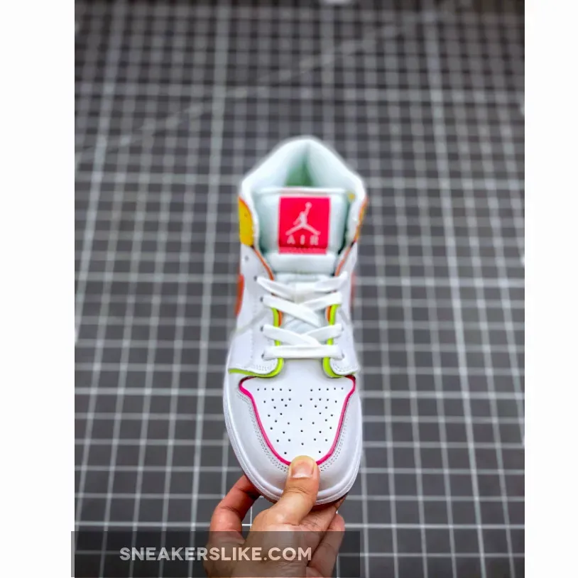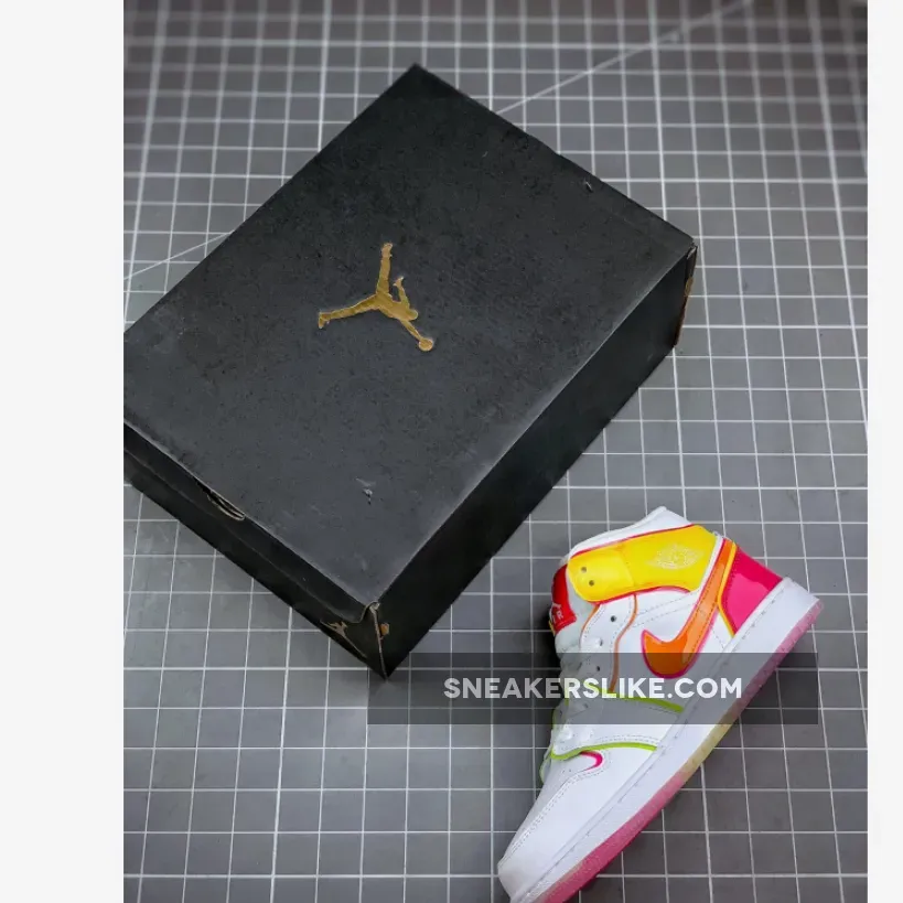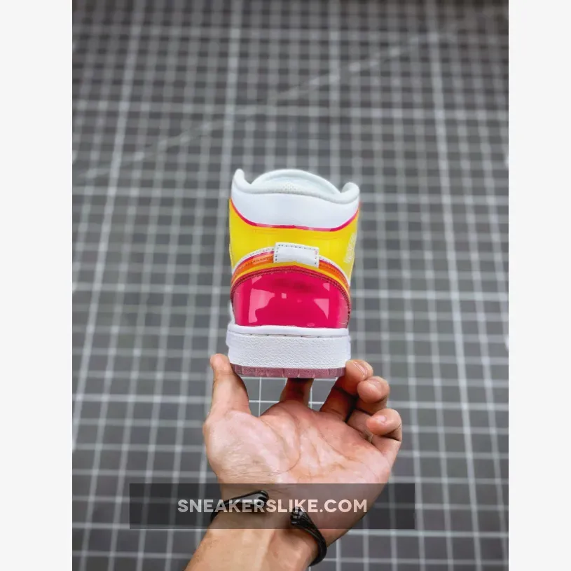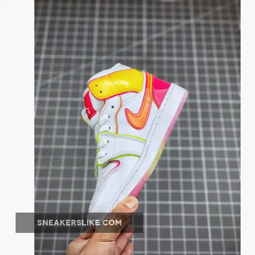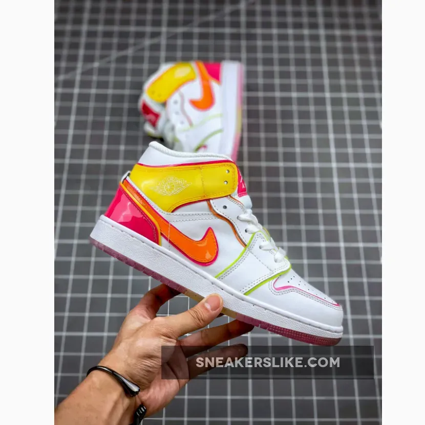 Made for big kids, the Air Jordan 1 Mid SE GS ‘Edge Glow’ enlivens the classic silhouette with fluorescent pops of color. In addition to highlighter piping, the white leather upper is contrasted by glossy coated overlays in contrasting orange and fuchsia hues at the collar and heel. Pink trim outlines the shiny orange Swoosh, while a matching pink Jumpman tag adorns the nylon tongue. The mid-top rides on a white rubber midsole, reinforced underfoot by a two-tone translucent rubber outsole.